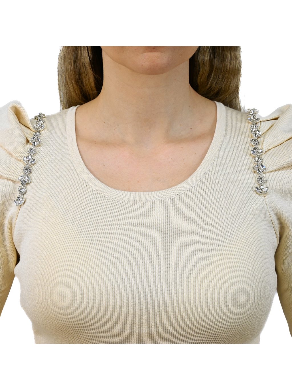 - dlhé rukávy sú v hornej časti jemne nariasené do decentného puff efektu, čo dodáva ramenám elegantný objem
