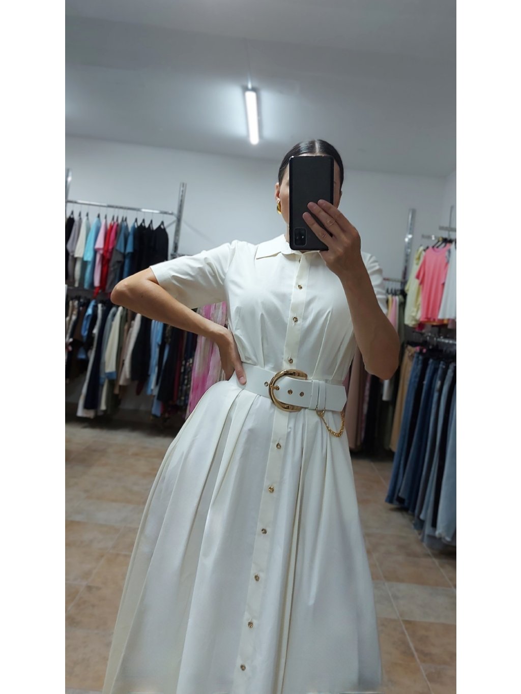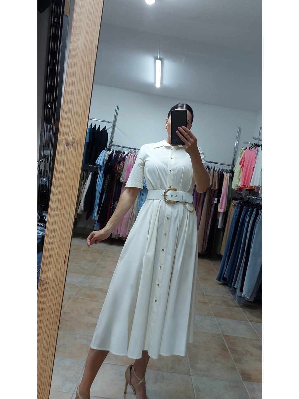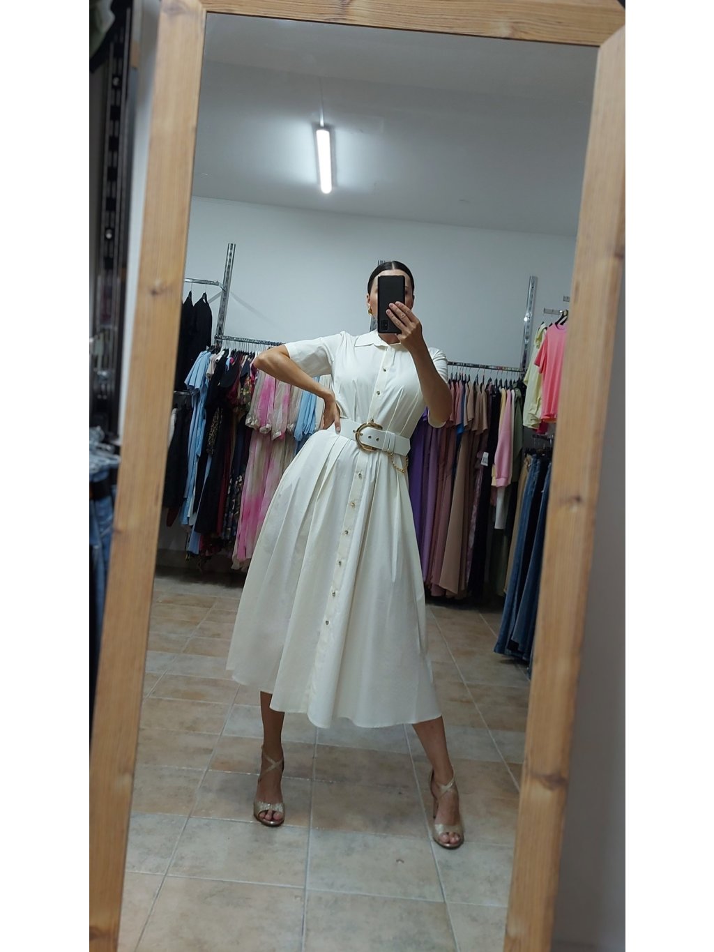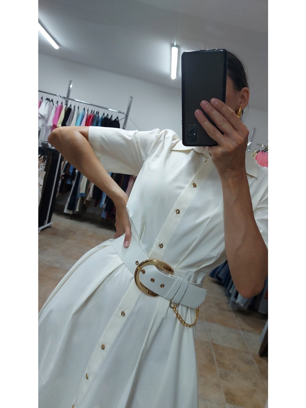 - súčasťou je aj široký opasok s výraznou zlatou prackou, ktorý vieš použiť ako ozdobu, no šaty pôsobia elegantne aj bez neho