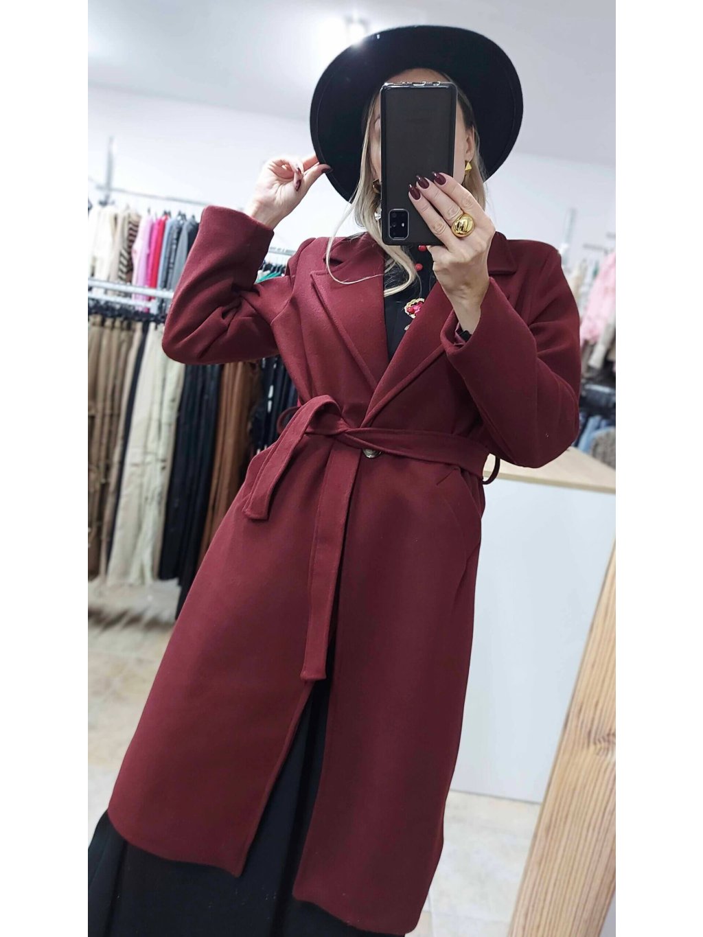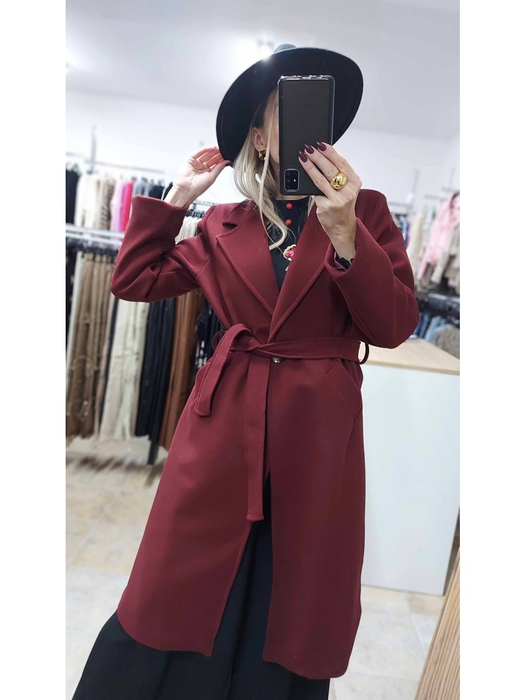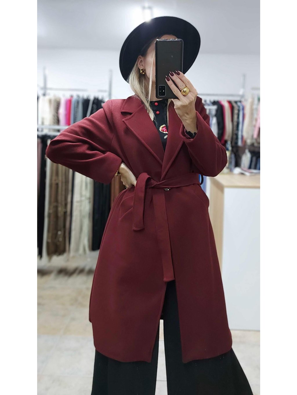 - bordový kabát s opaskom je esenciou elegancie a ženskosti, ktorá krásne podčiarkne tvoju postavu a dodá šatníku luxusný nádych