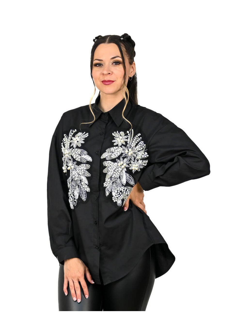 - to, čo túto košeľu robí skutočne výnimočnou, sú dve nádherné aplikácie na prednej časti, ktoré vytvárajú luxusný efekt