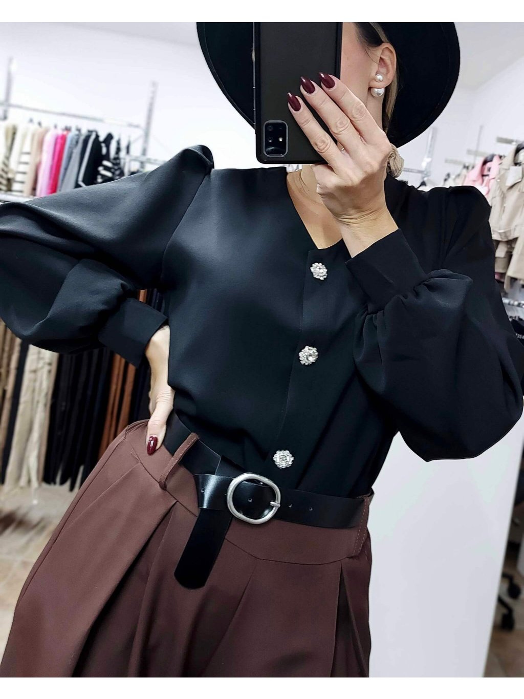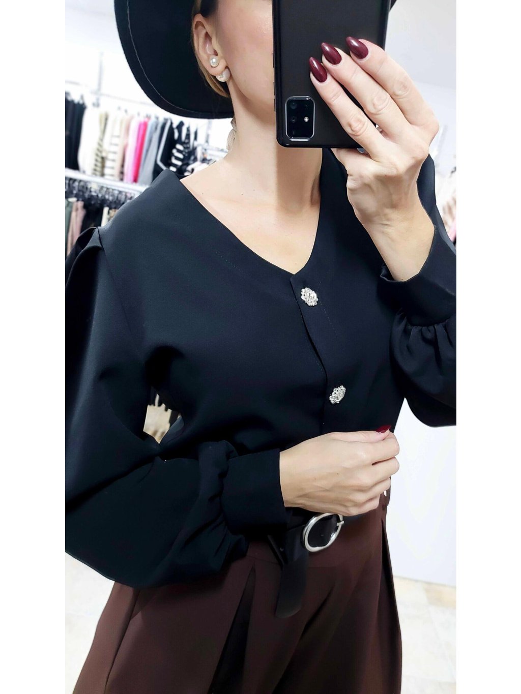 - luxusná čierna elegantná blúzka s naberanými rukávmi je kúskom, ktorý okamžite zaujme svojím elegantným spracovaním a jemne romantickými detailmi
