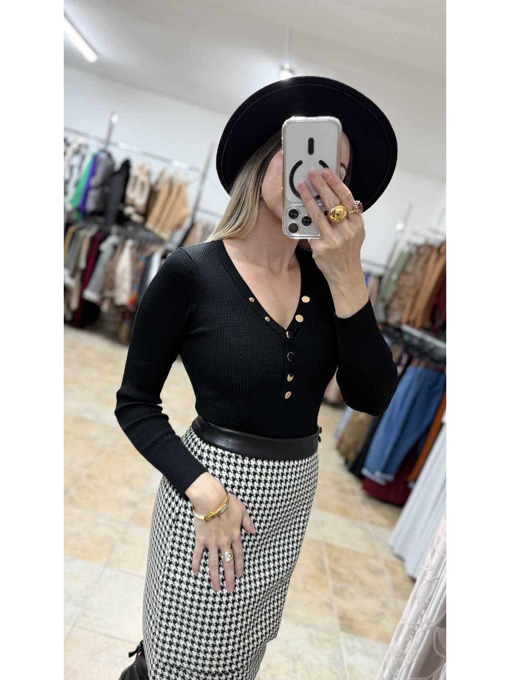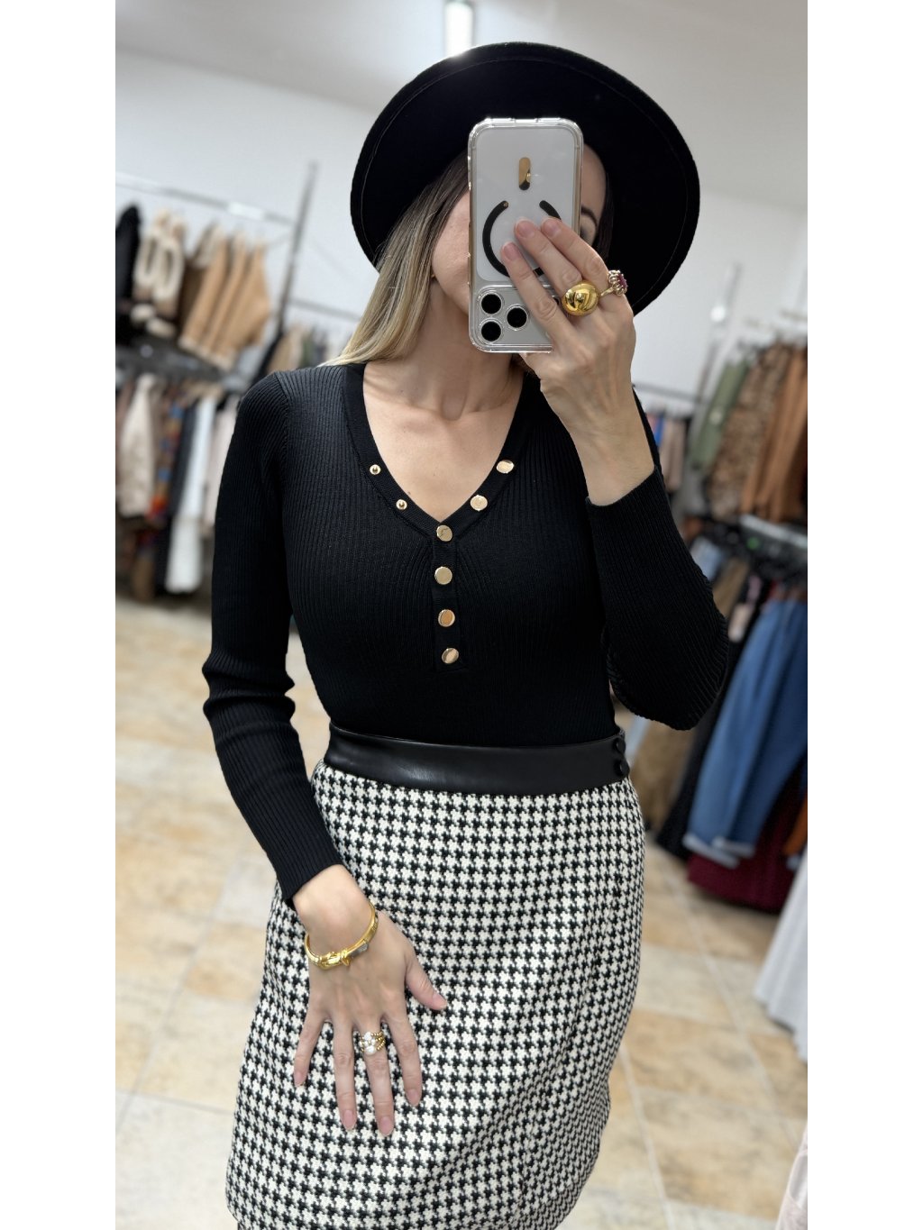 - čierne body s dlhým rukávom so zlatými cvokmi Je vyrobené z rebrovaného, príjemne prispôsobivého materiálu s vysokým podielom elastanu