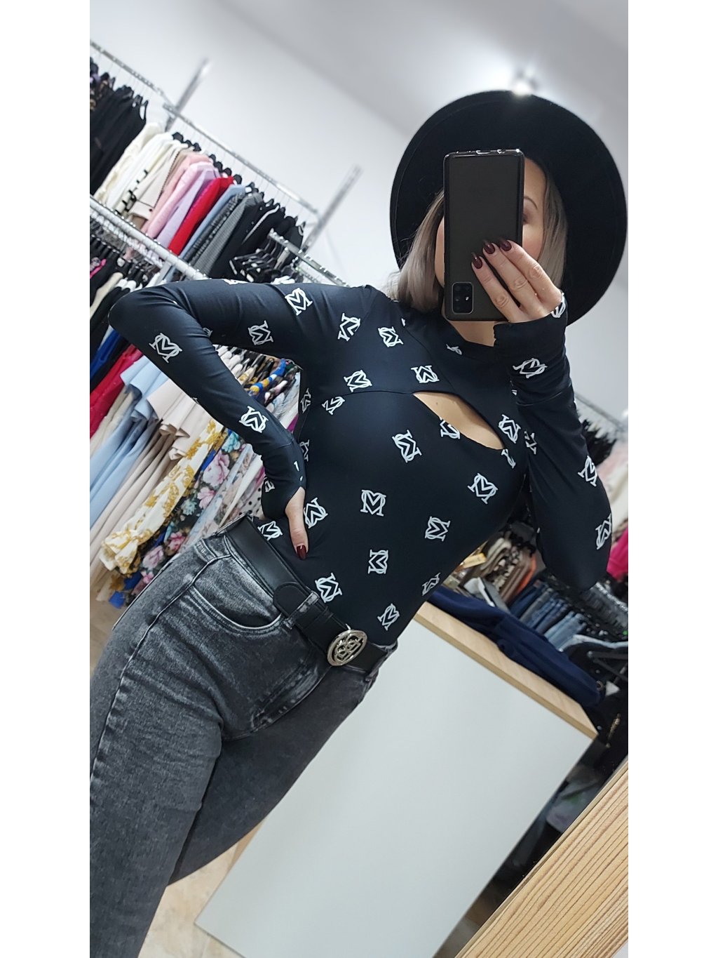 - dlhé rukávy sú ukončené manžetou s otvorom na palec, ktorá vytvára efekt jemnej „rukavičky“ – praktický a štýlový detail, ktorý zaujme