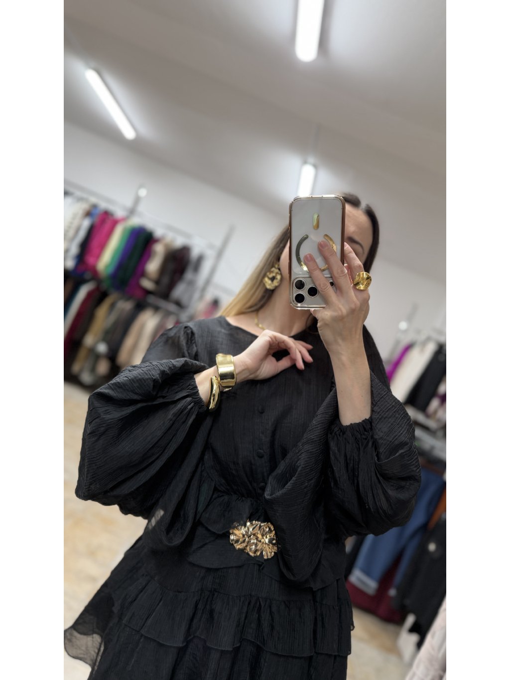 - súčasťou šiat je nastaviteľný opasok so zlatou kvetinovou prackou