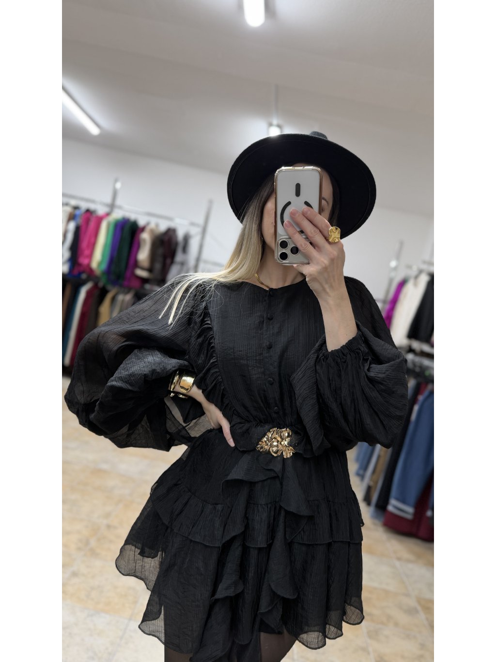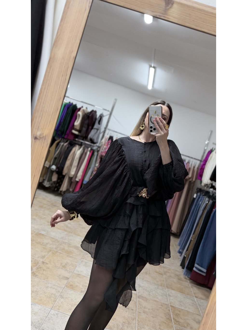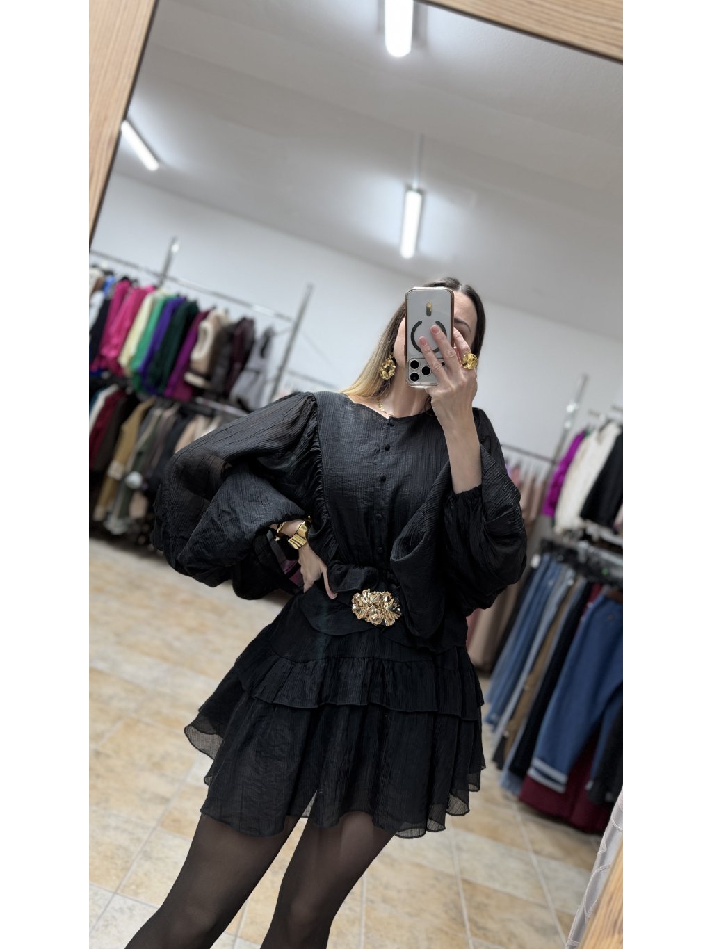 - volánové čierne minišaty s dlhým rukávom majú voľnejší, lichotivý strih, ktorý je v páse doplnený o pružnú gumičku a krásne sa prispôsobí postave