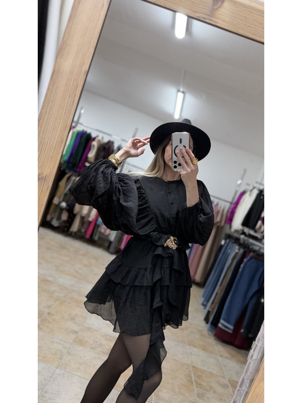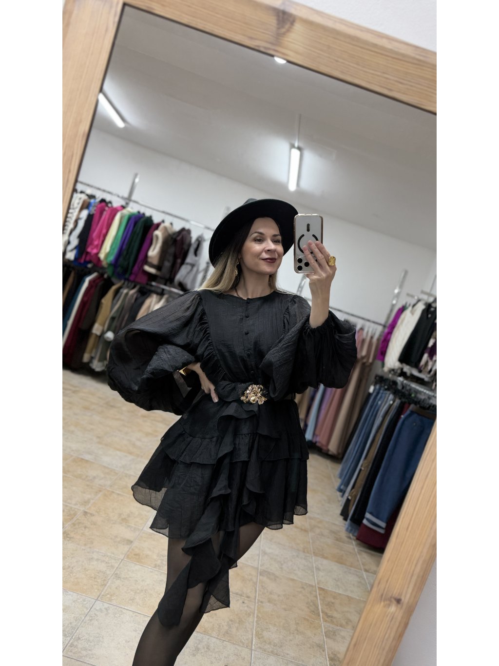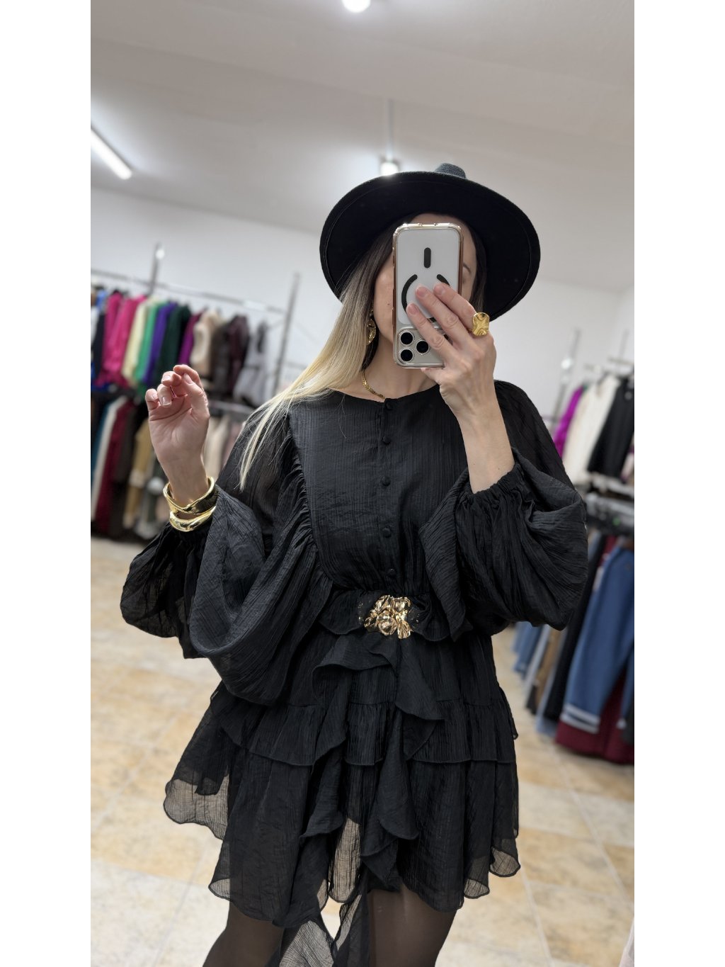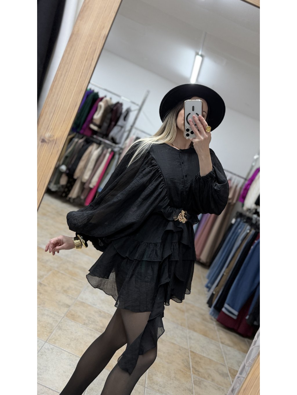 - volánové čierne minišaty s dlhým rukávom majú voľnejší, lichotivý strih, ktorý je v páse doplnený o pružnú gumičku a krásne sa prispôsobí postave