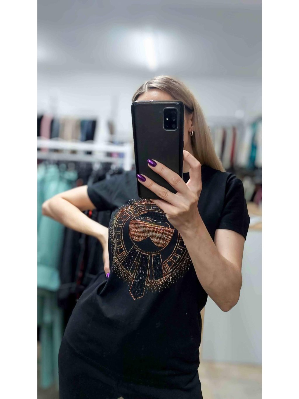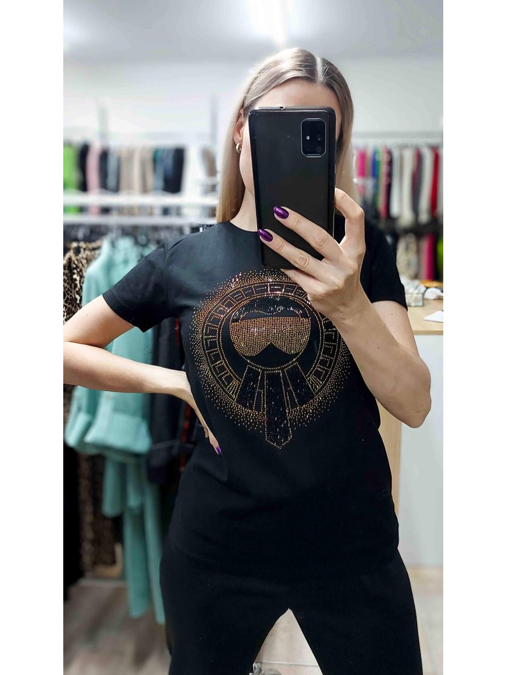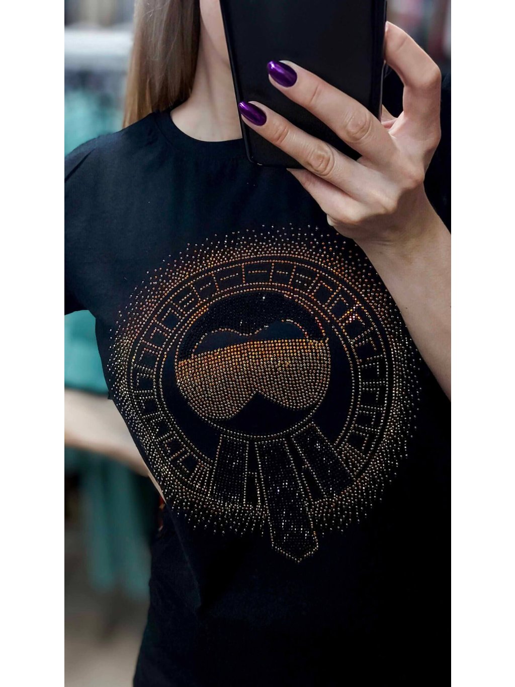 - kamienky krásne odrážajú svetlo a menia odtiene podľa uhla pohľadu, čím dodávajú tričku jedinečný, žiarivý efekt