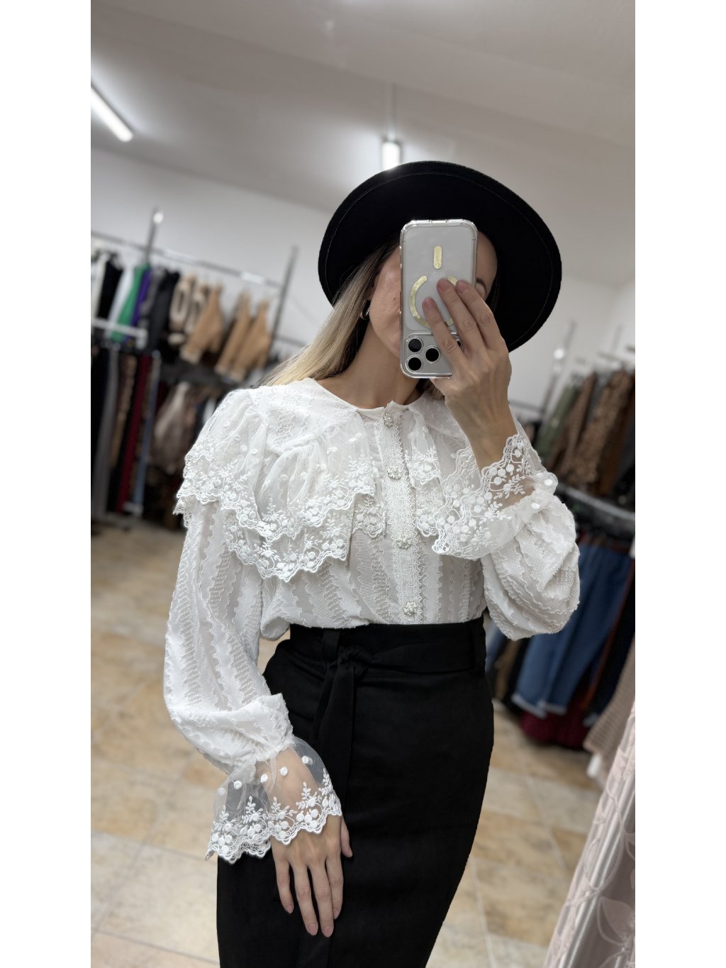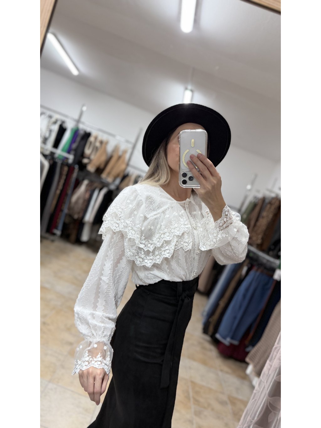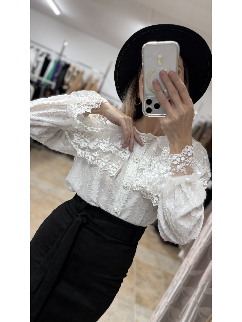 - čipkovaná blúzka s volánom je jemný a romantický kúsok, ktorý okamžite upúta svojím detailným spracovaním a ženským šarmom