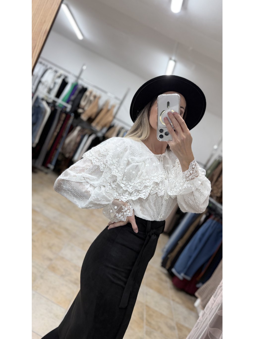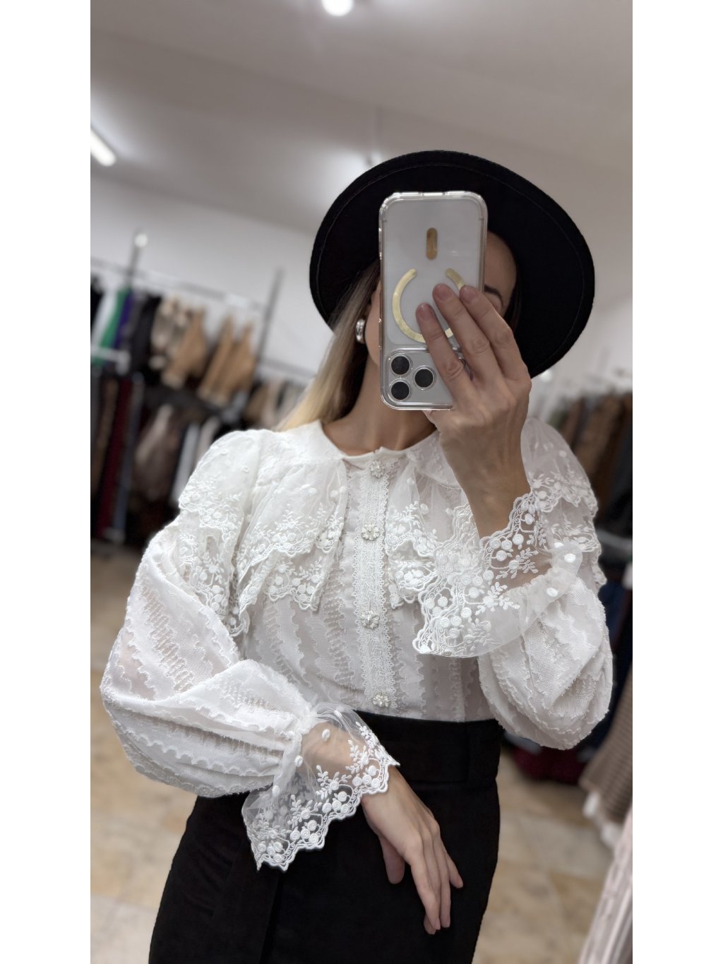 - dlhé rukávy sú ukončené širokou zvonovou krajkou, čo pridáva blúzke výraznú romantickú siluetu