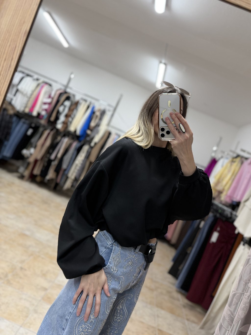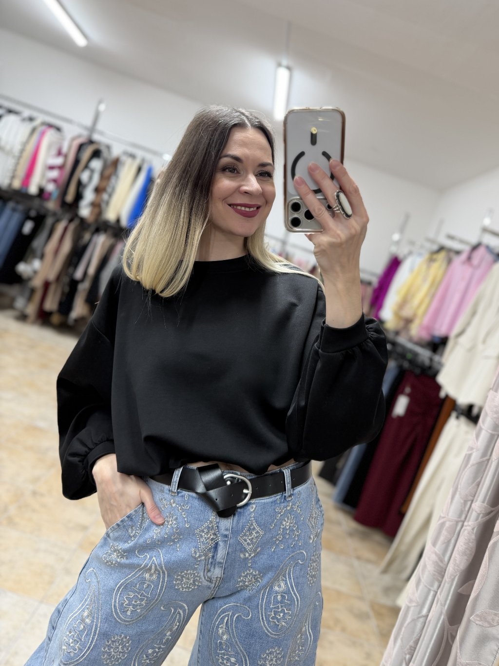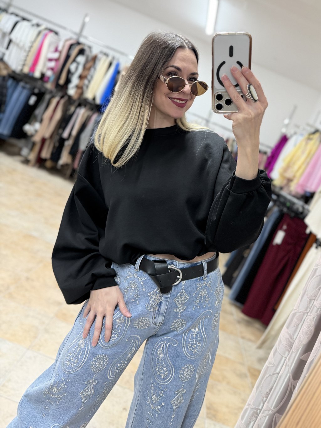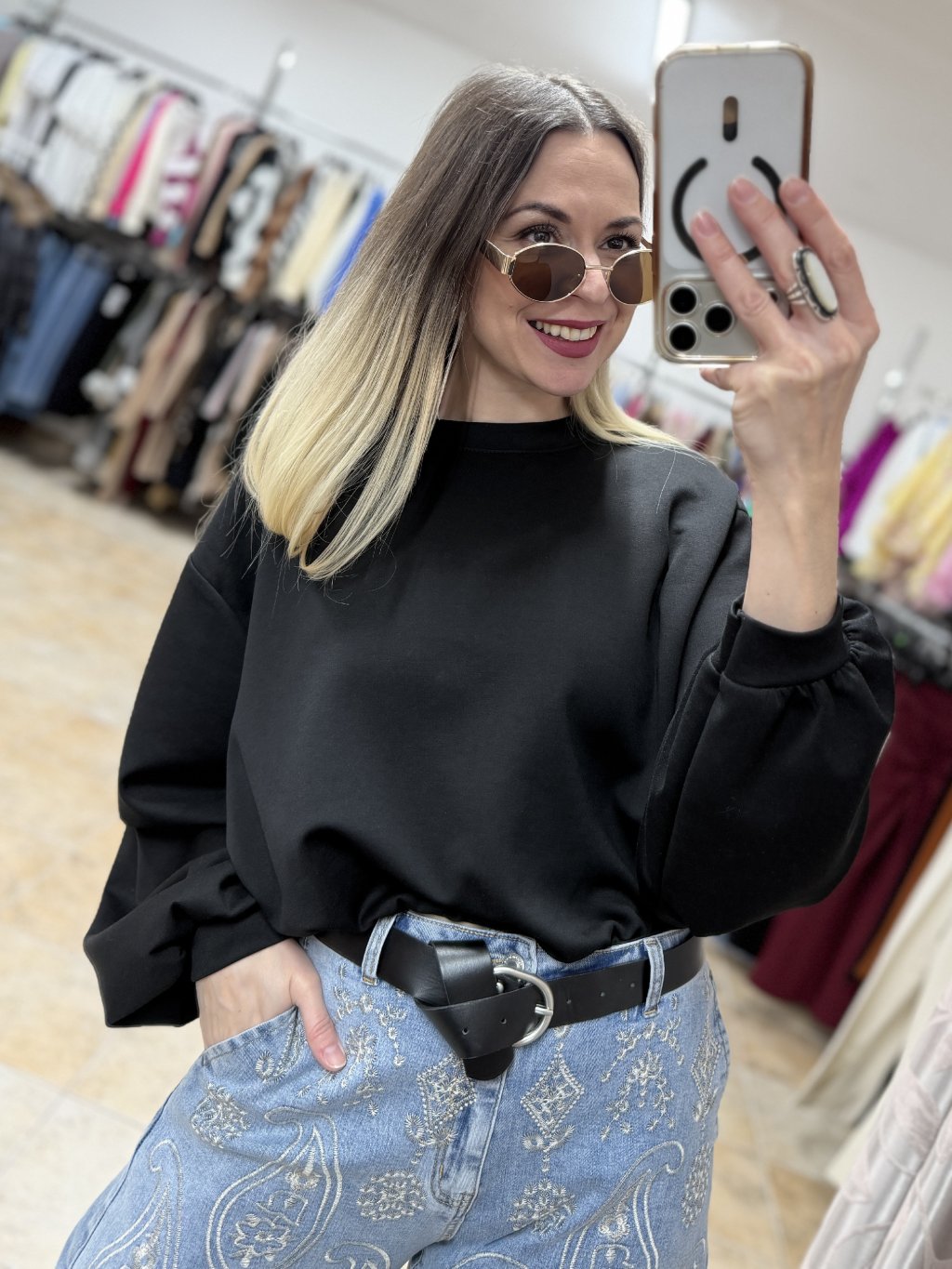 - moderná dámska čierna mikina, kratšia, trendová dĺžka zvýrazňujúca pás