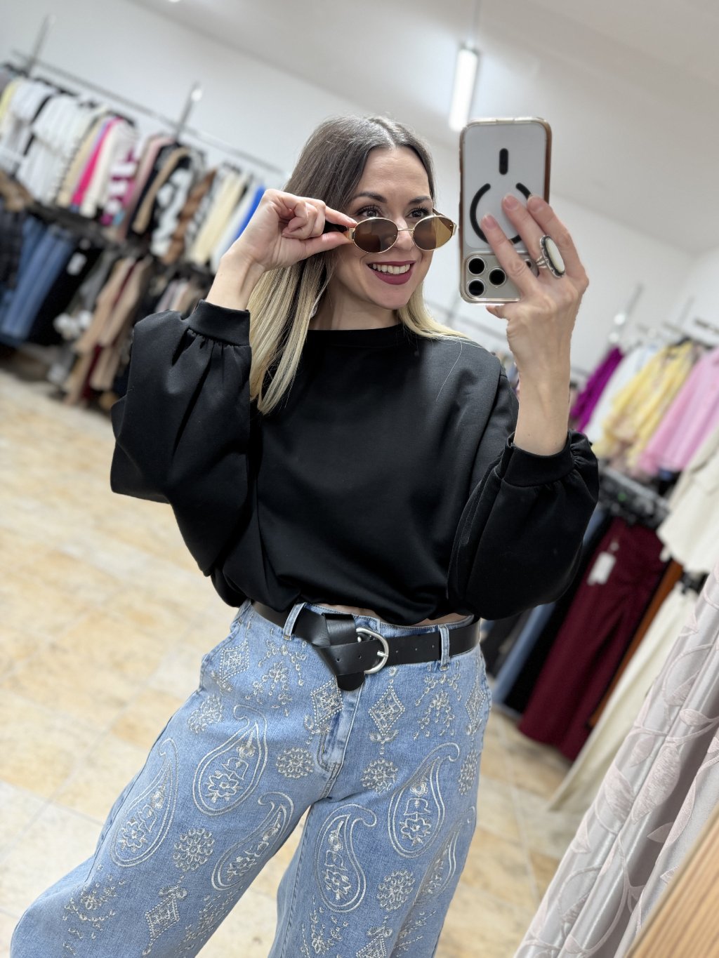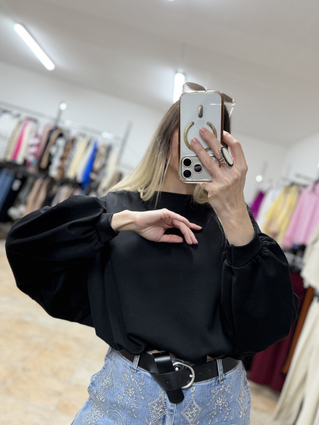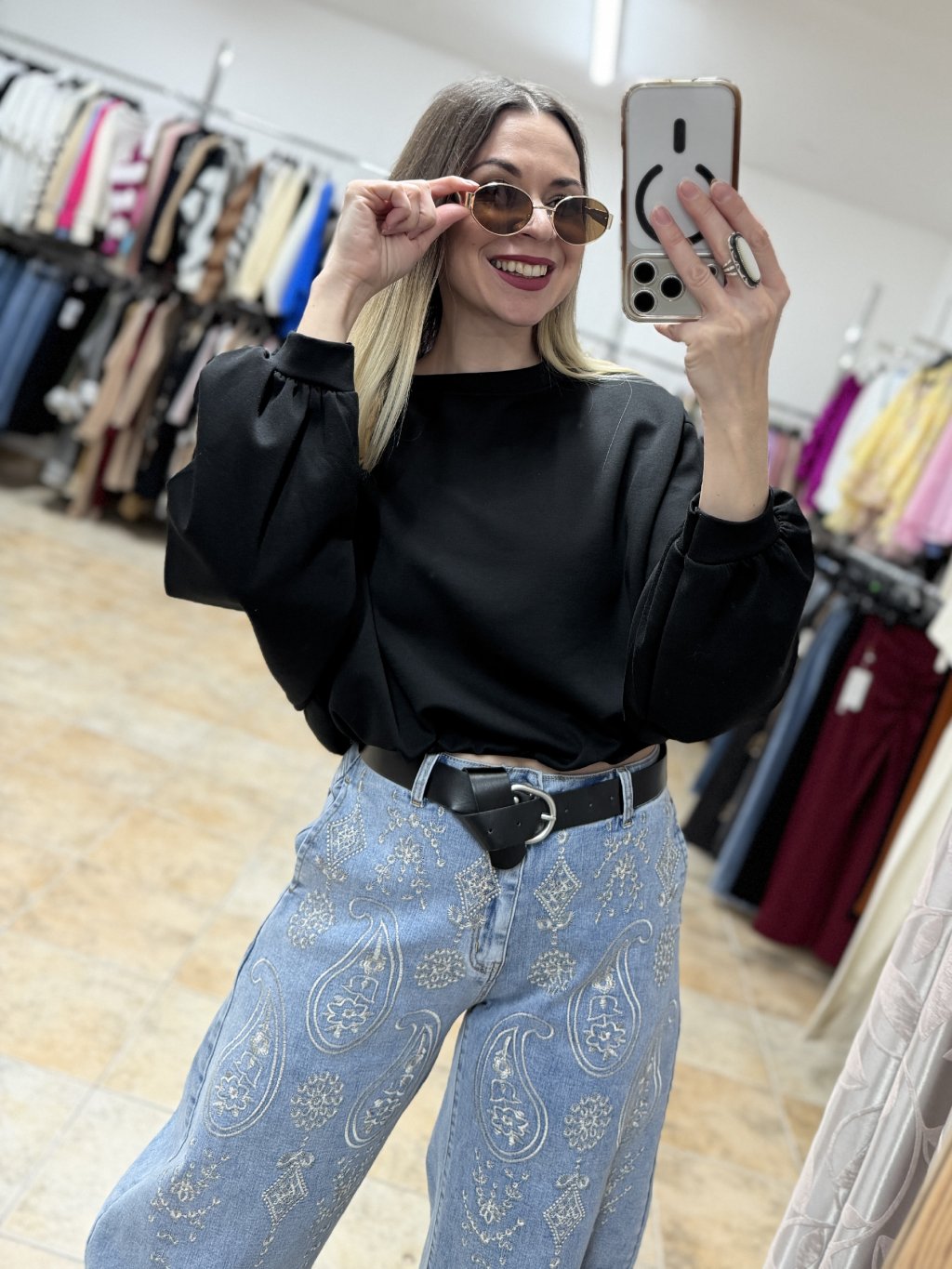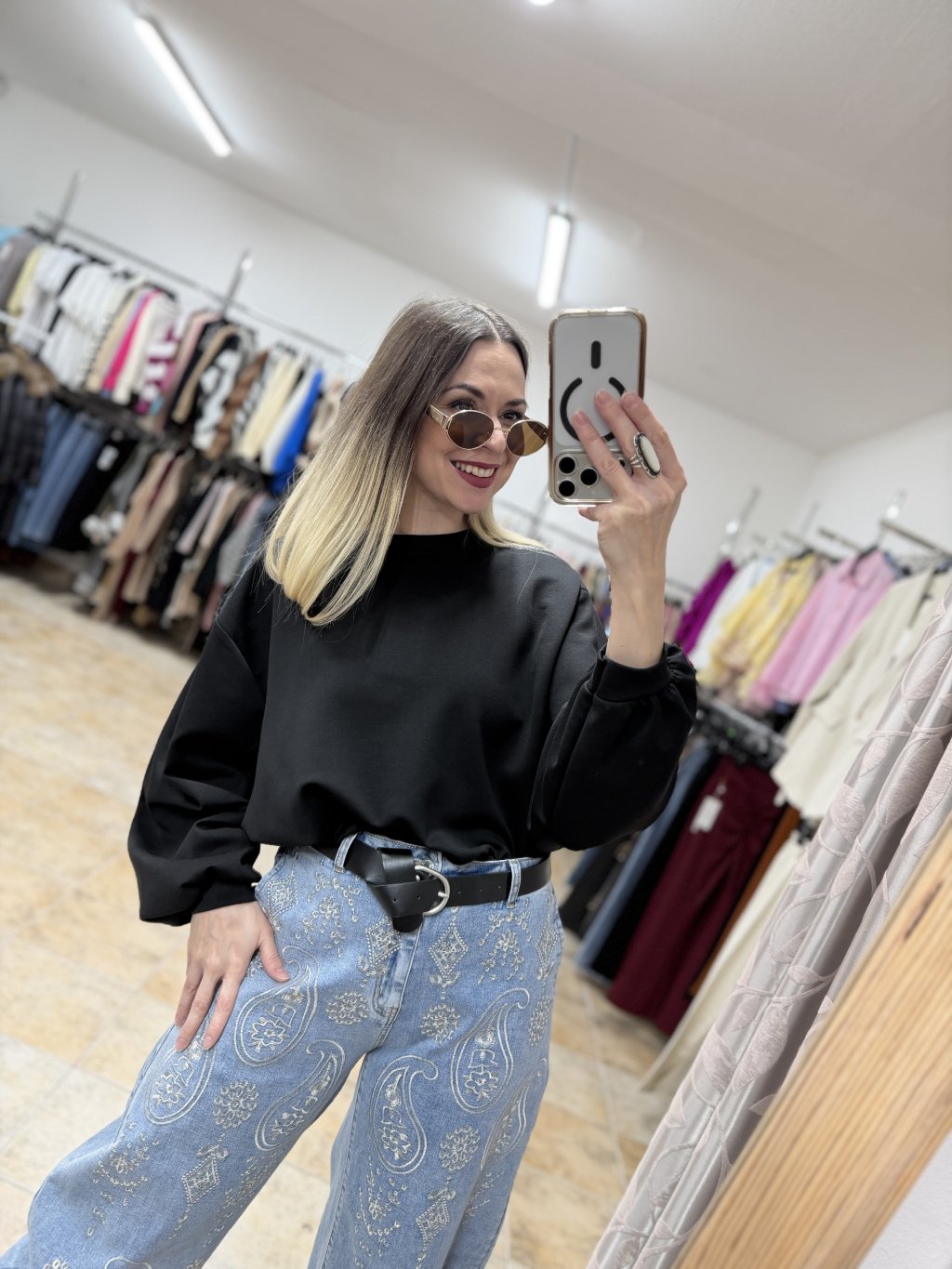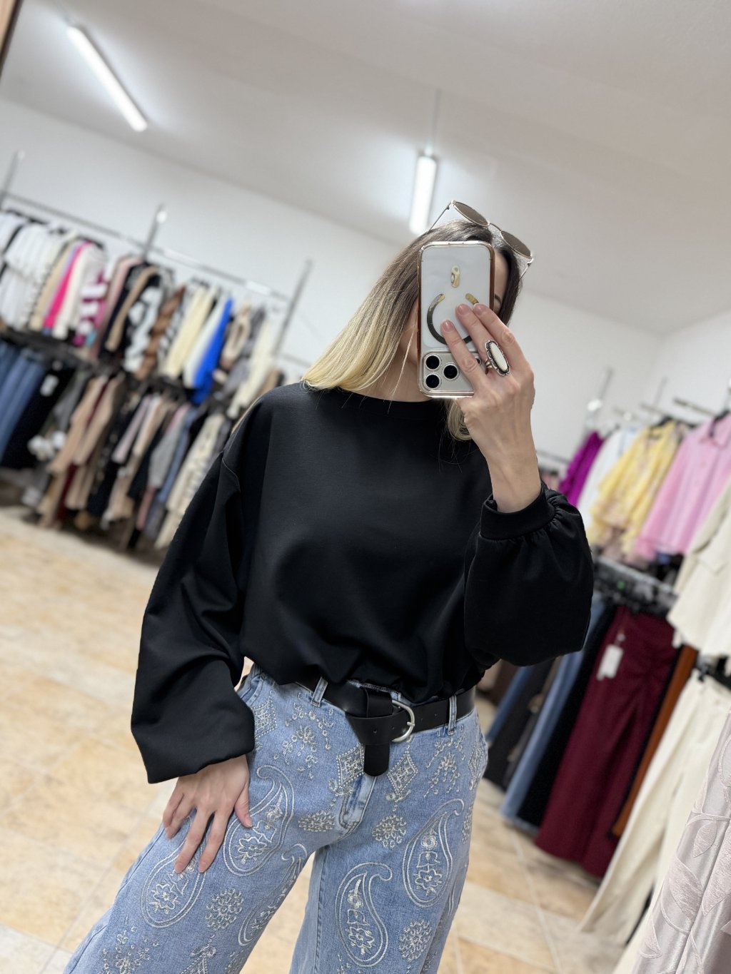 - moderná dámska čierna mikina, kratšia, trendová dĺžka zvýrazňujúca pás