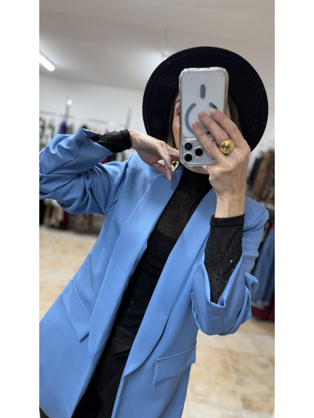 - toto bledomodré sako nemá zapínanie, čo mu dodáva vzdušný, uvoľnený vzhľad