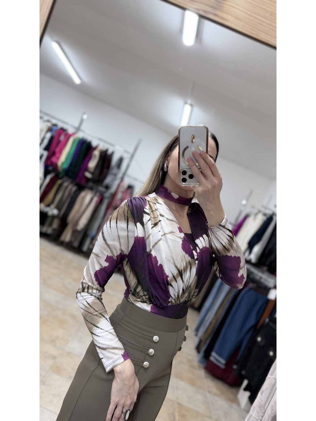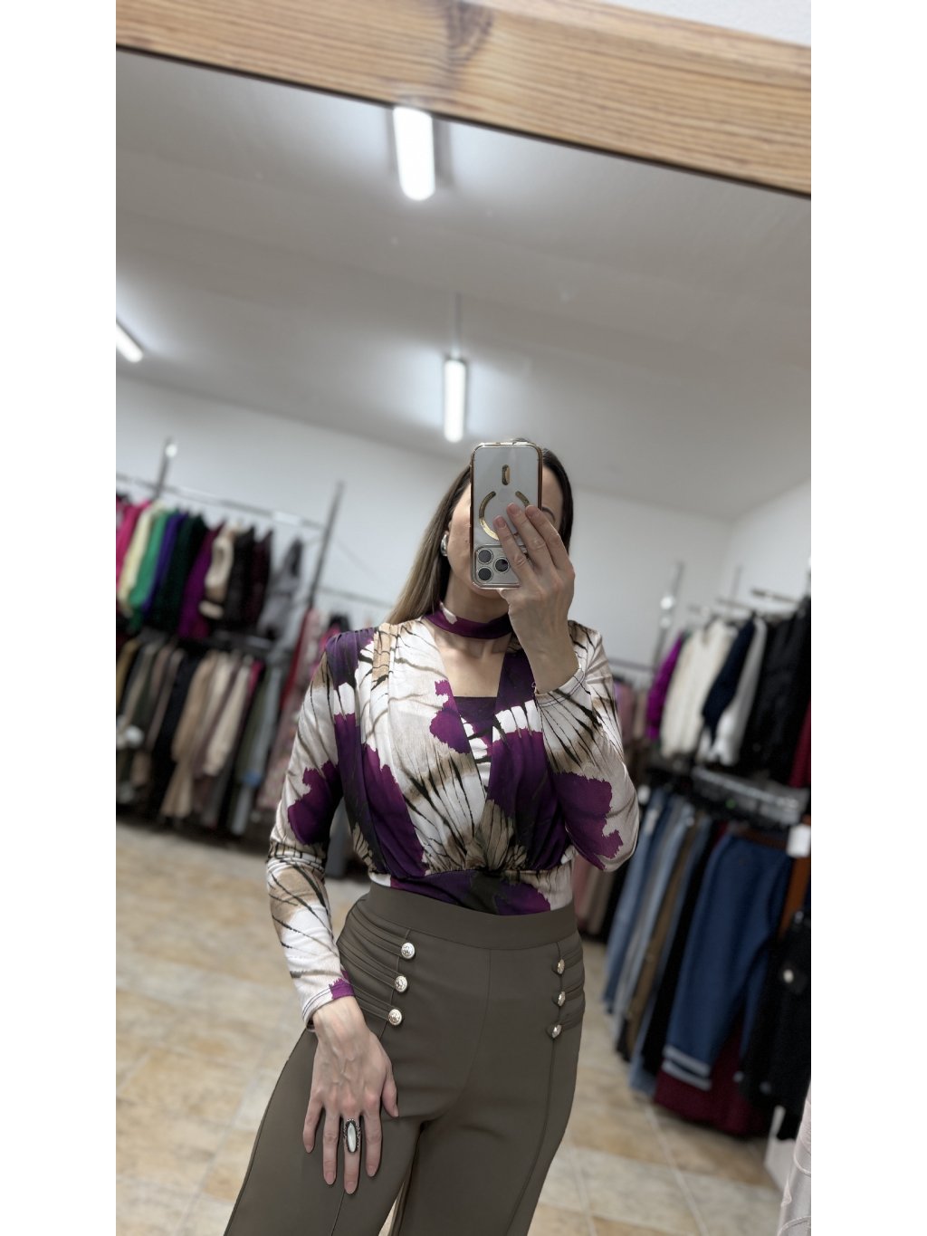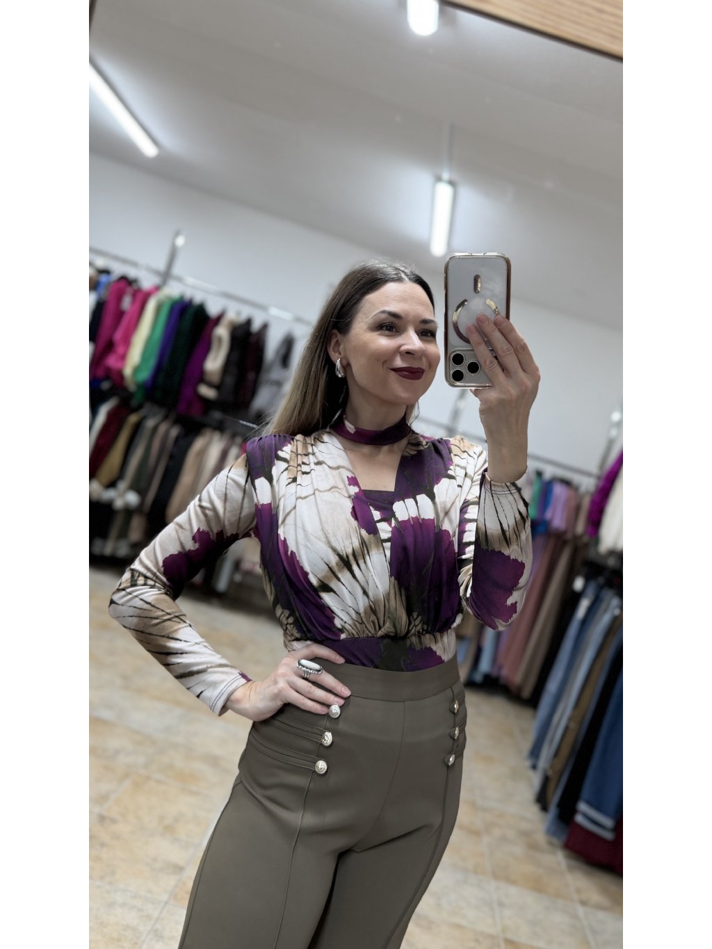 - vzor bodyčka pripomína jemnú batiku v harmonickej kombinácii fialových a hnedých tónov, ktorá pôsobí jedinečne a zaujímavo