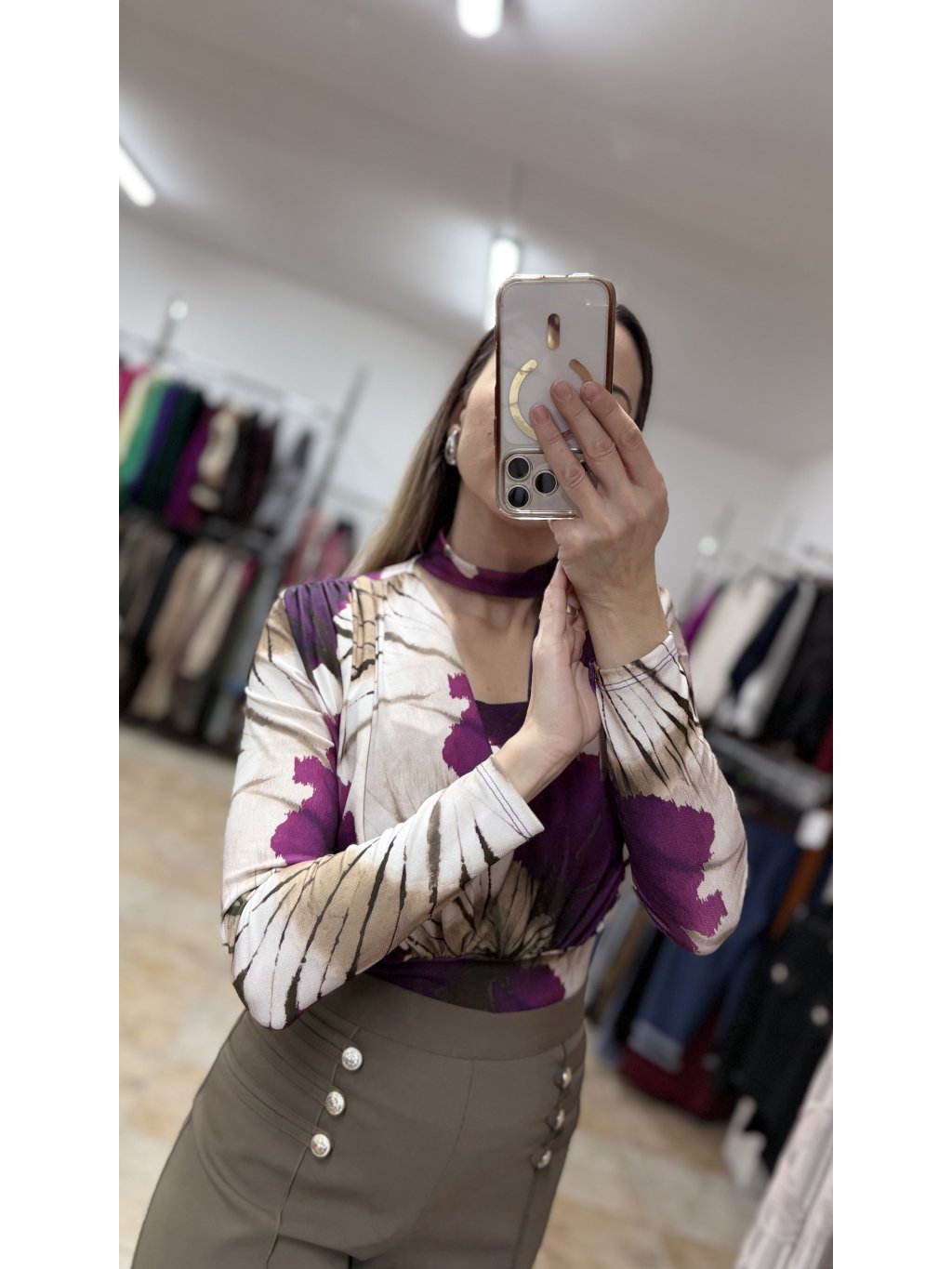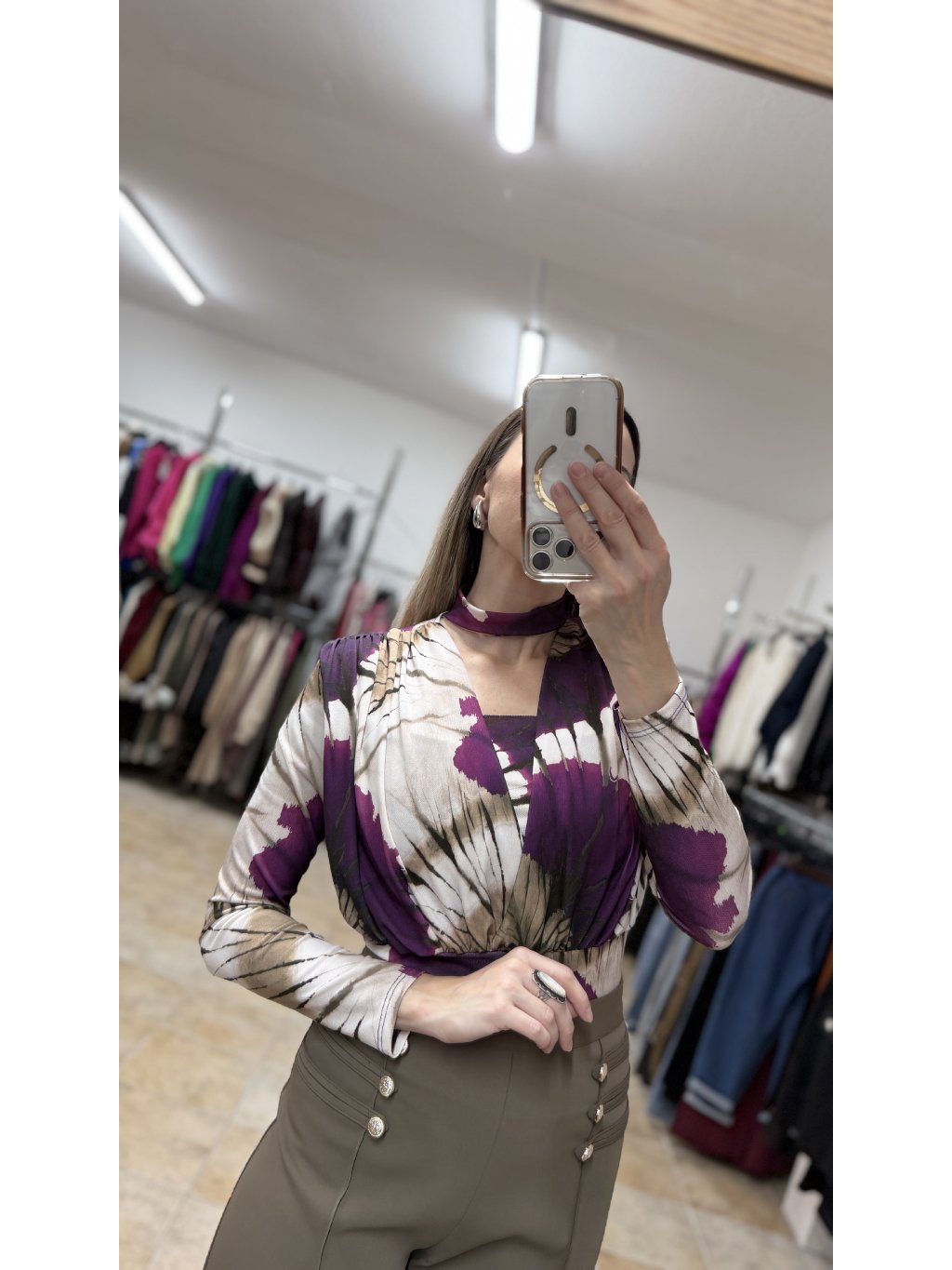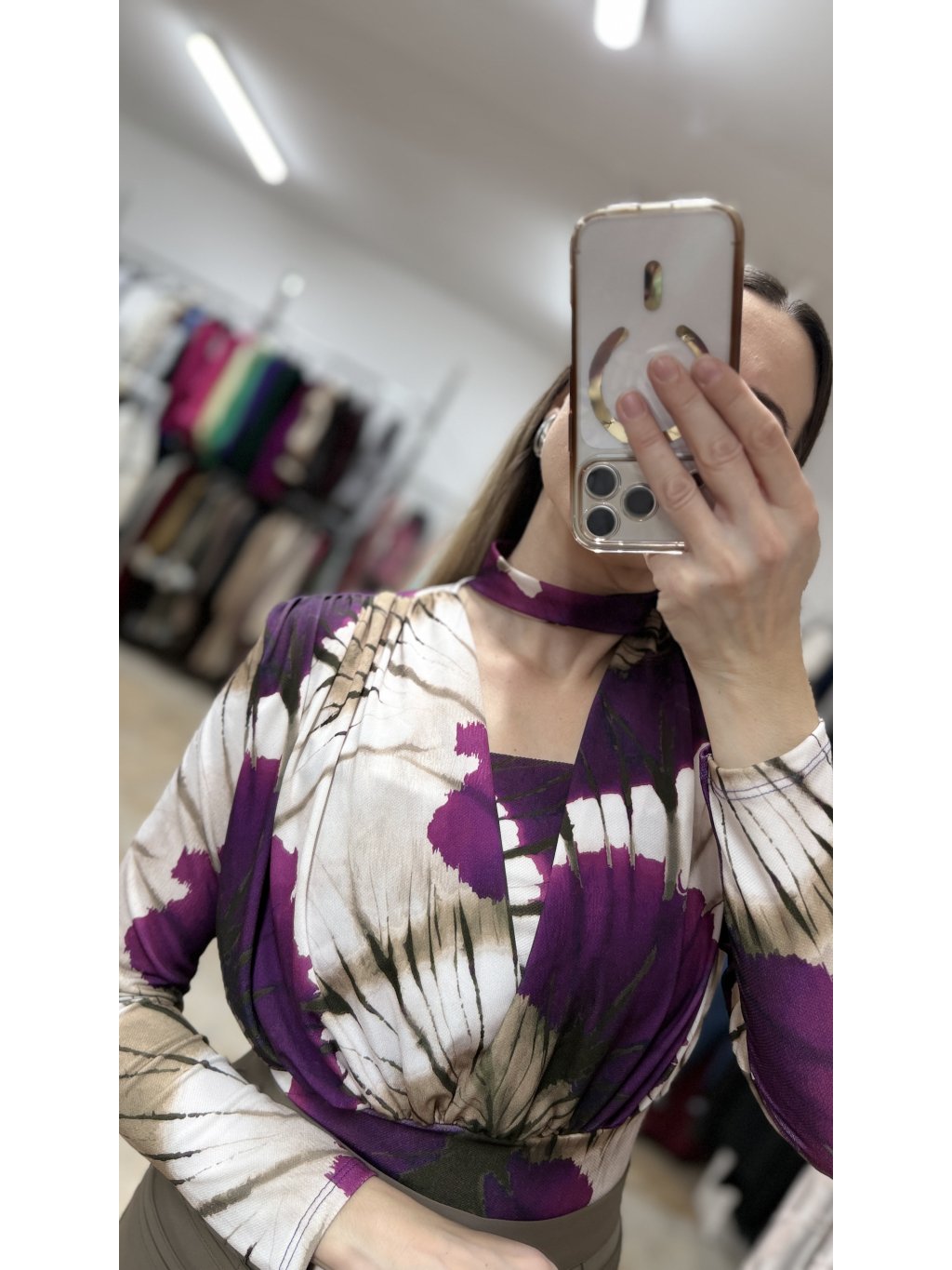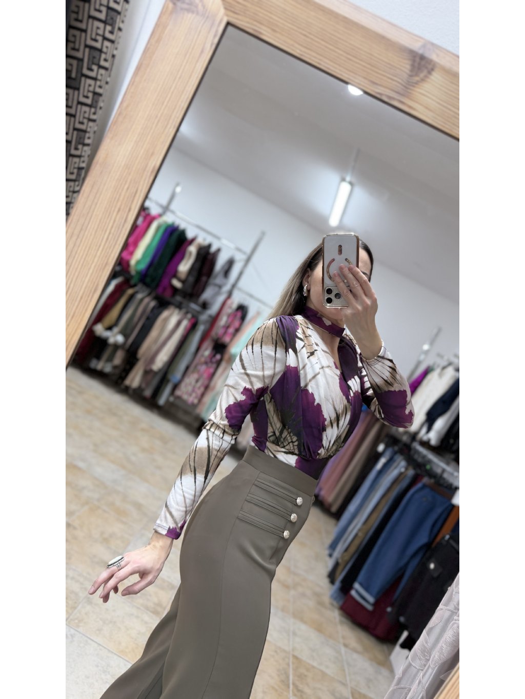 - vzor bodyčka pripomína jemnú batiku v harmonickej kombinácii fialových a hnedých tónov, ktorá pôsobí jedinečne a zaujímavo