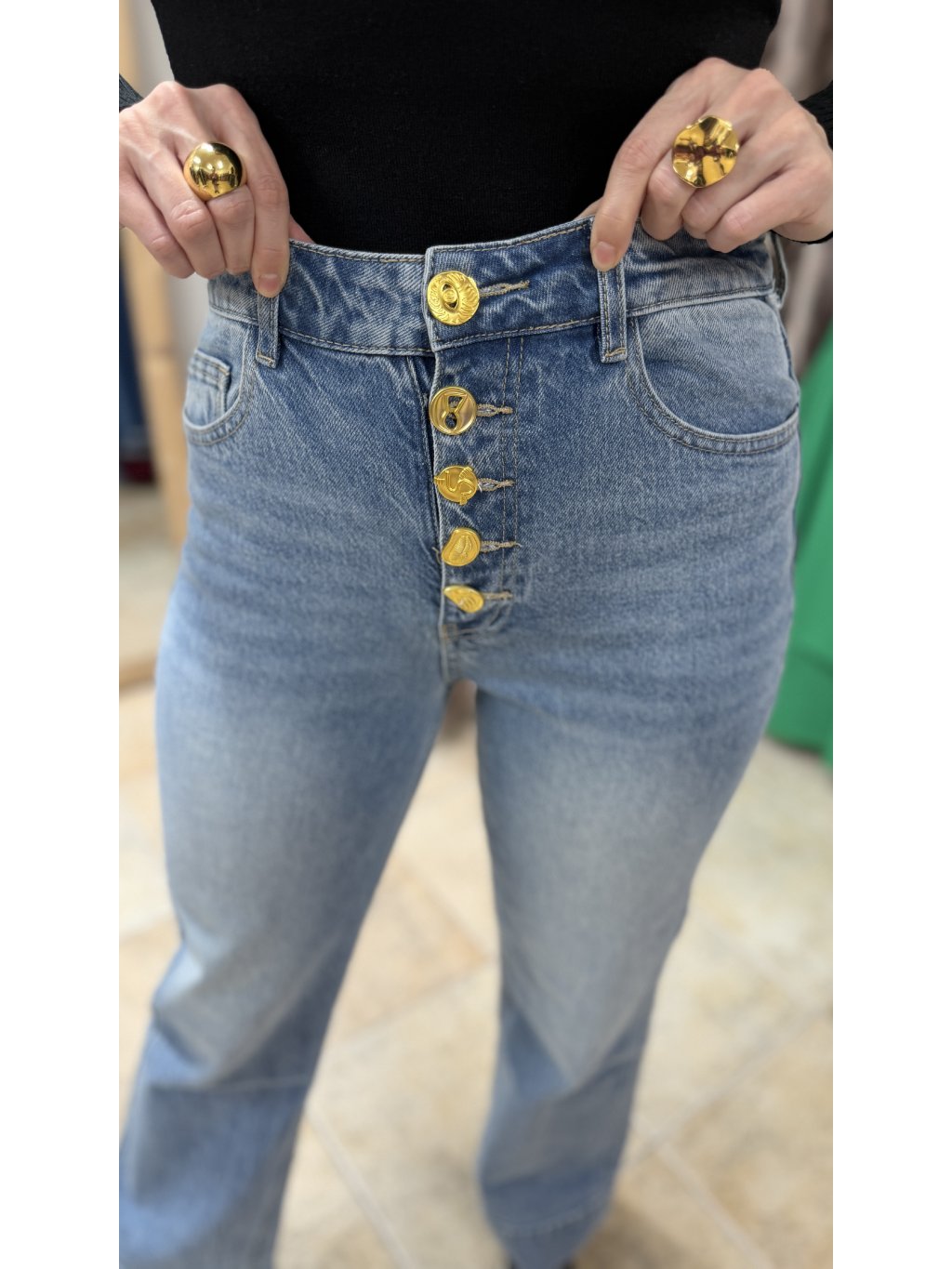 - zapínanie je riešené zlatými gombíkmi, pričom každý z nich má odlišný tvar ako dizajnový akcent