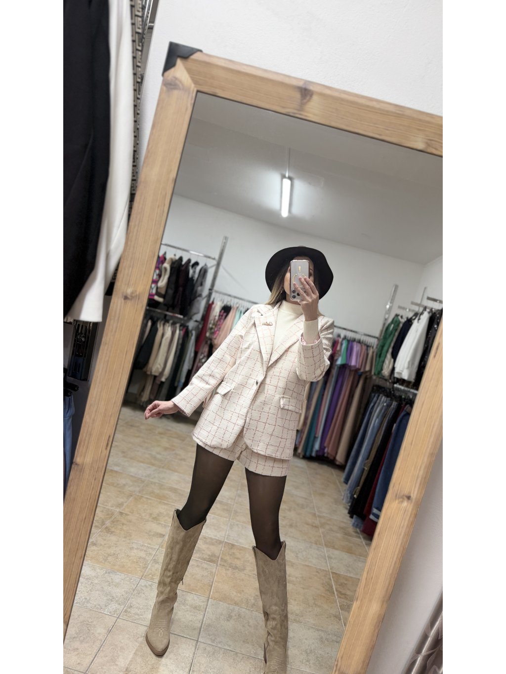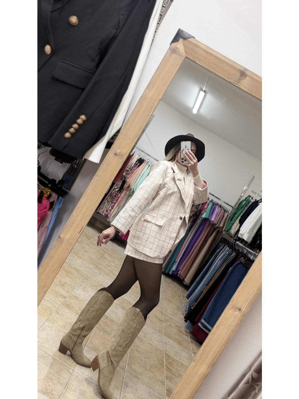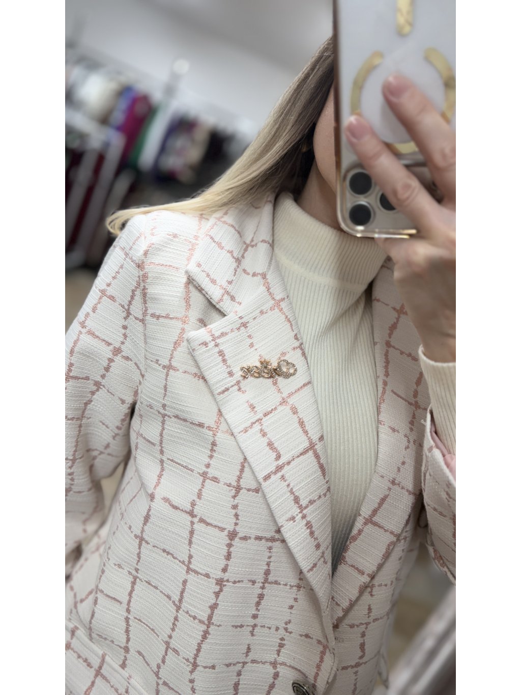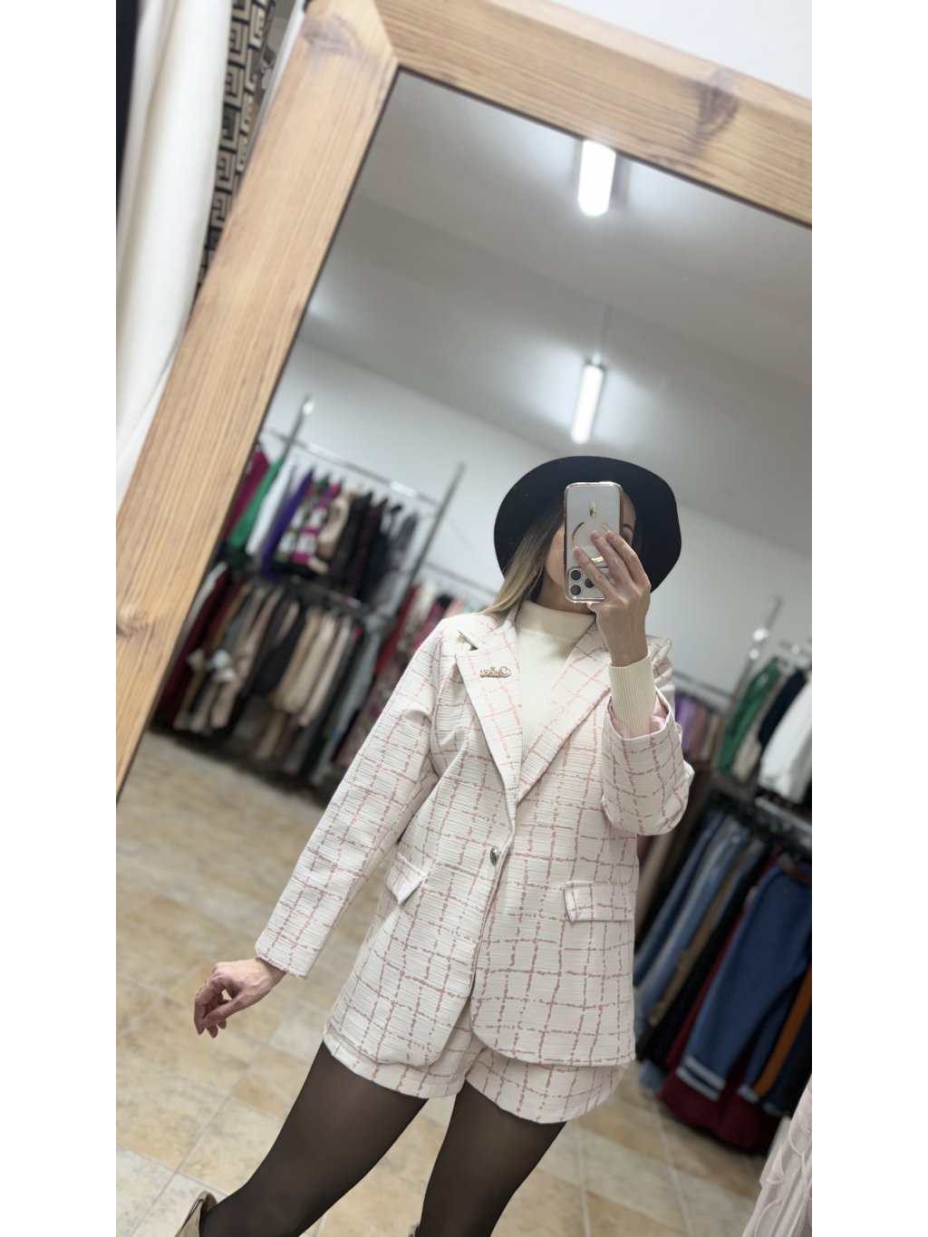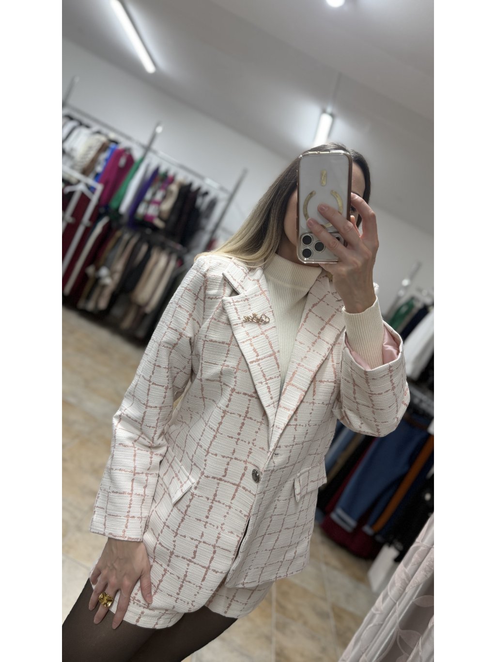 - prvou časťou je jemne oversize sako s klasickým fazónkovým golierom, ktoré má čisté línie a vkusné spracovanie