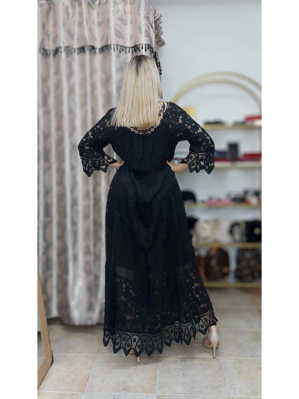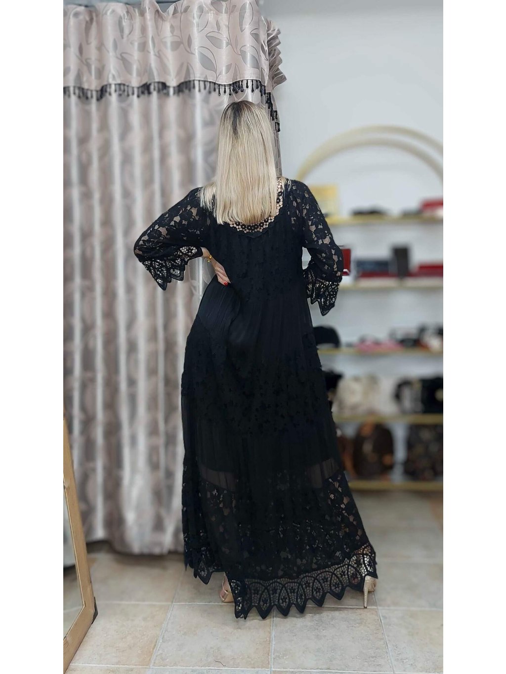 - rukávy sú trojštvrťové, jemne rozšírené, zdobené výraznou čiernou krajkou, ktorá ladí s celkovým romantickým nádychom šiat