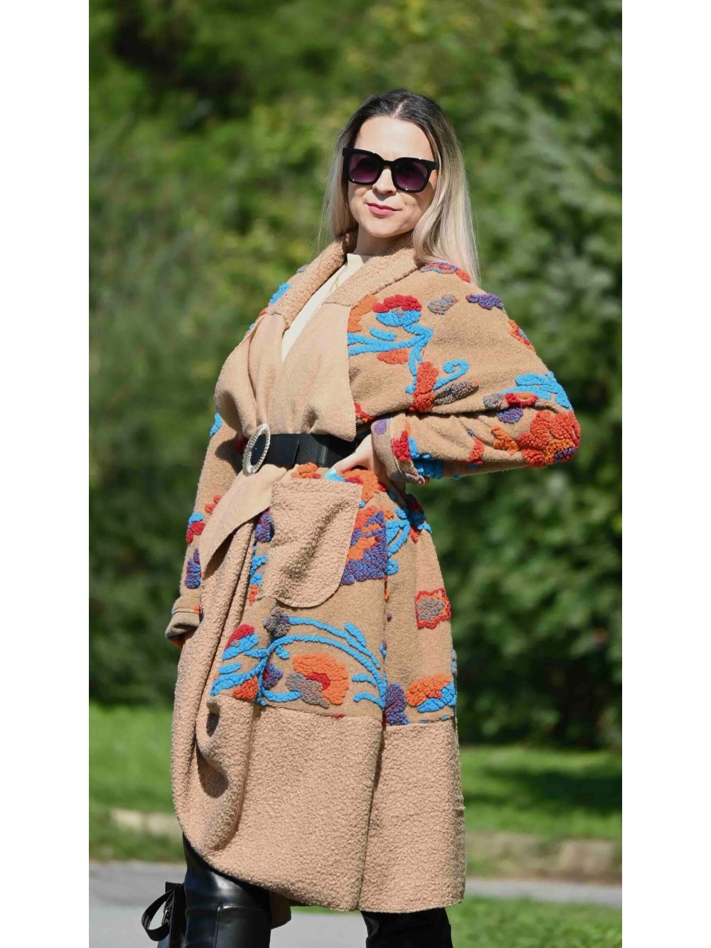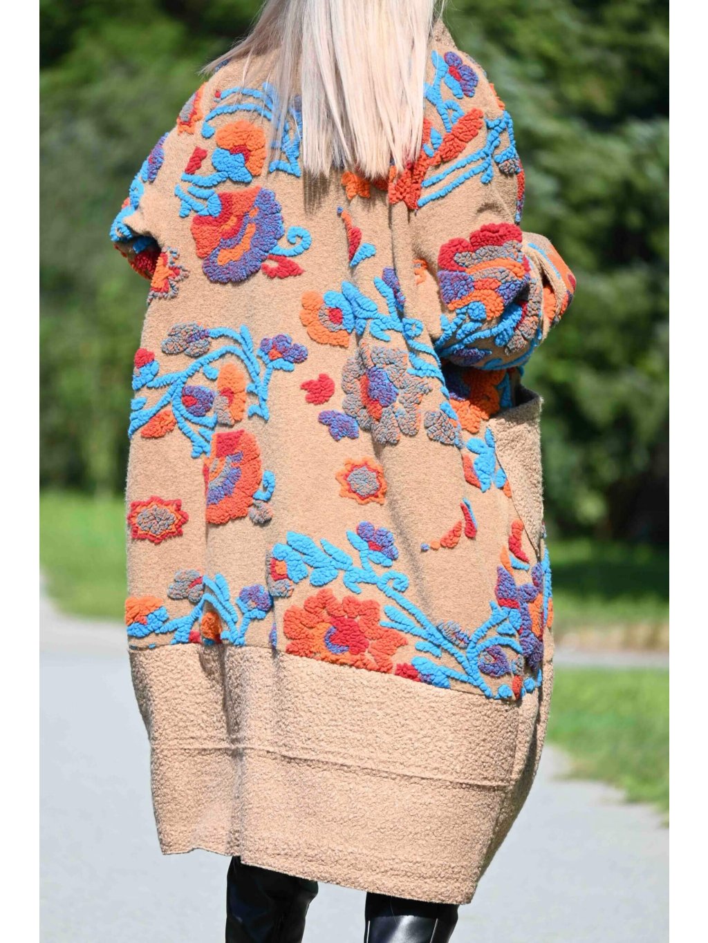 - celý dlhý kabát zdobia 3D textúrované kvety v odtieňoch tyrkysovej, červenej a oranžovej, ktoré sú rozmiestnené na prednom aj zadnom diele a dokonca aj na rukávoch
