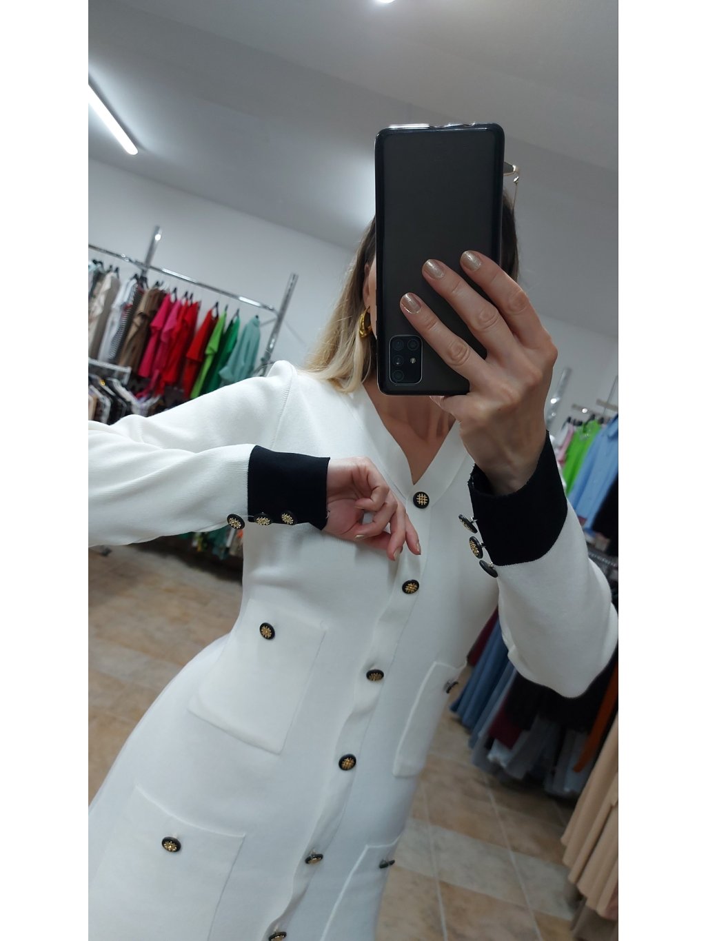 - šaty majú véčkový vystrih a zdobia ich dekoratívne čierno-zlaté gombíky – pôsobia luxusne a zvýrazňujú výnimočnosť šiat