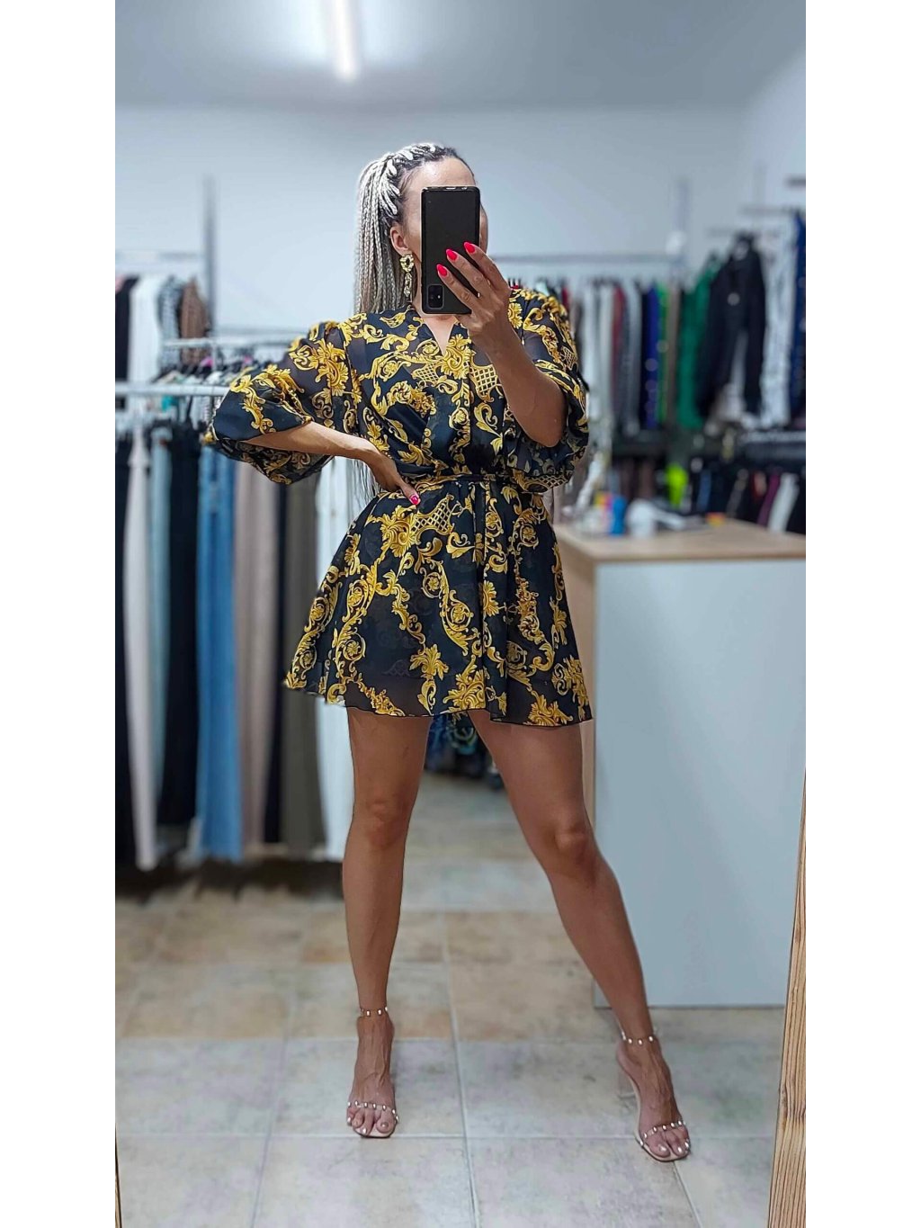 - materiál v hornej časti je mierne priesvitný, preto odporúčame zvoliť si pod neho jemnú spodnú vrstvu, ak preferuješ decentnejšie zakrytie. (Modelka zvolila bodičko)