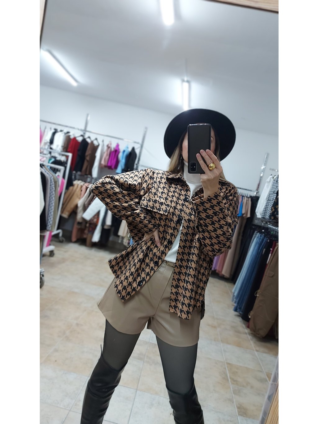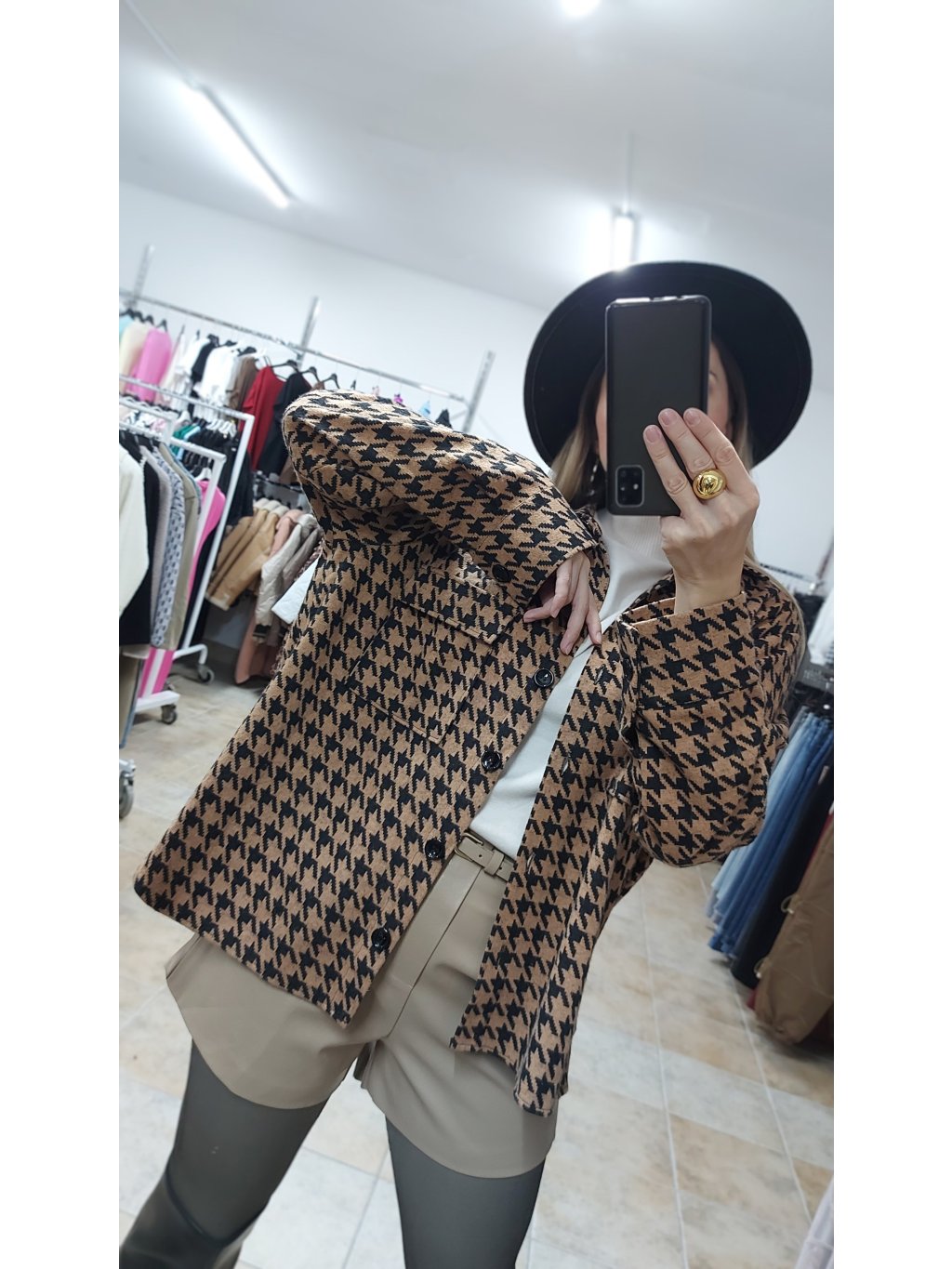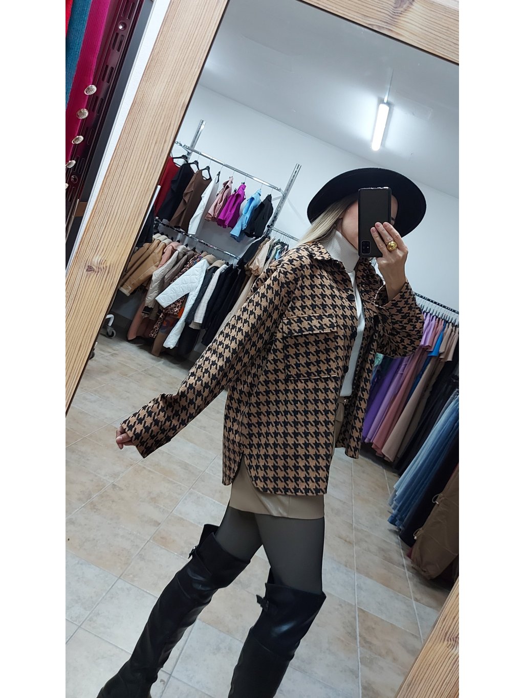 - farebné prevedenie kombinuje béžový základ s čiernym vzorom kohútej stopy, čo z nej robí univerzálny kúsok na každodenné nosenie