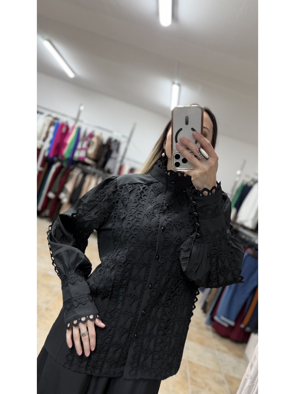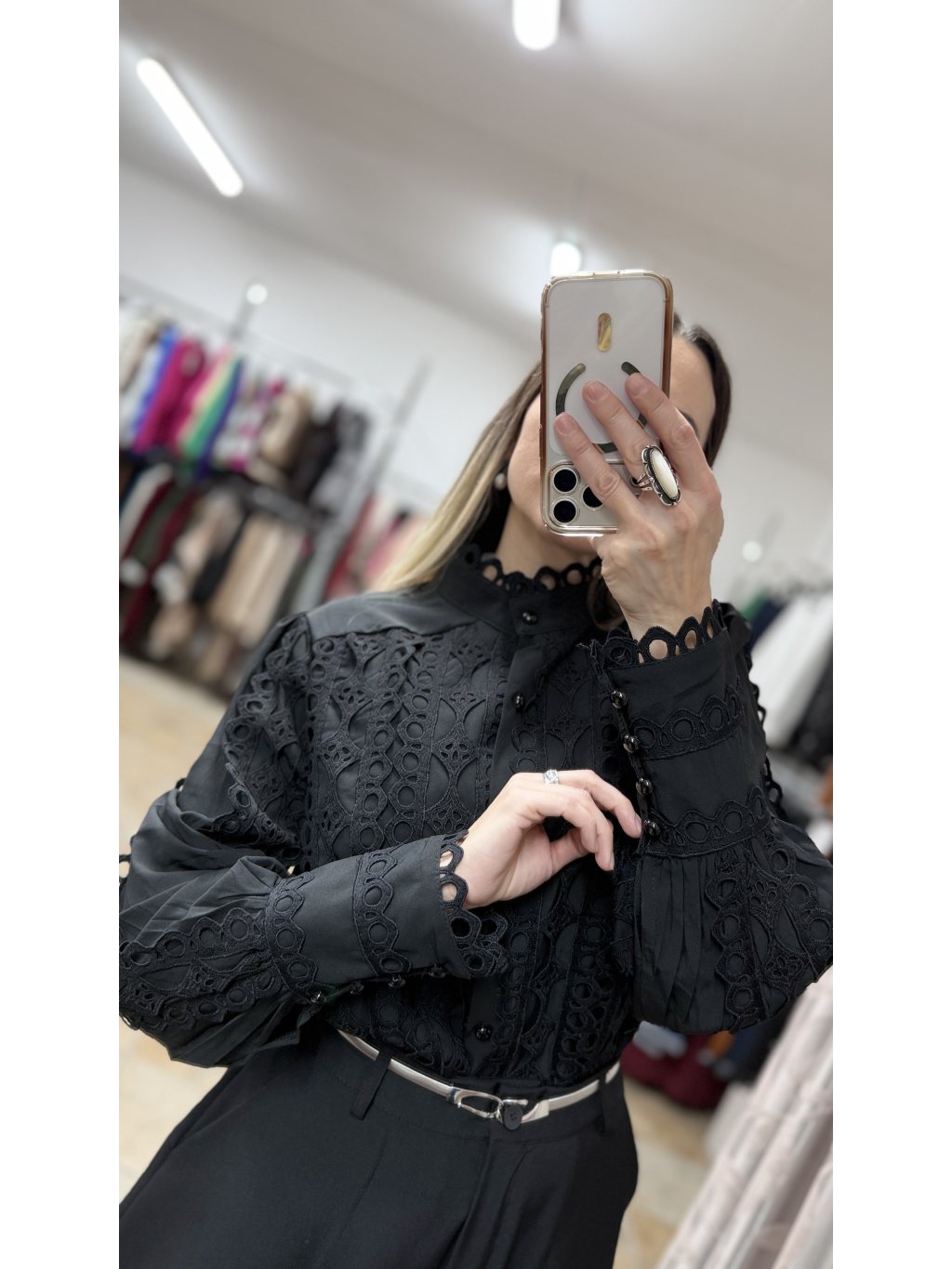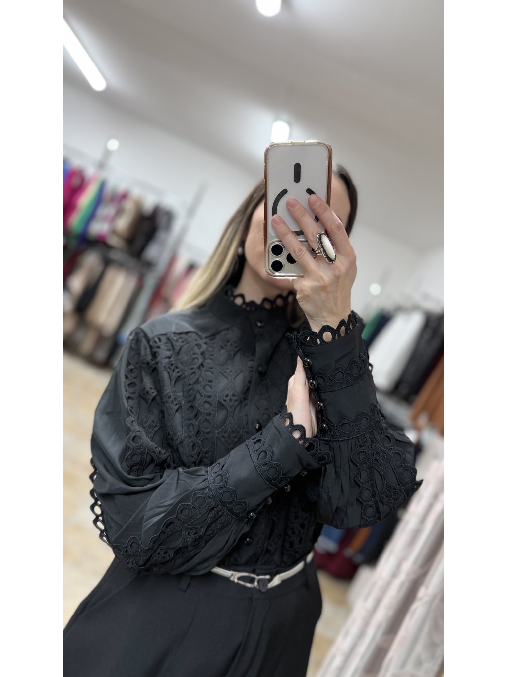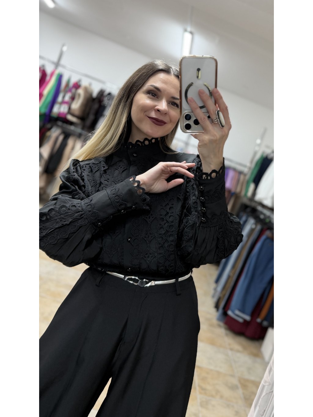 - táto čierna blúzka má stojáčikový golier zakončený jemným krajkovým lemom