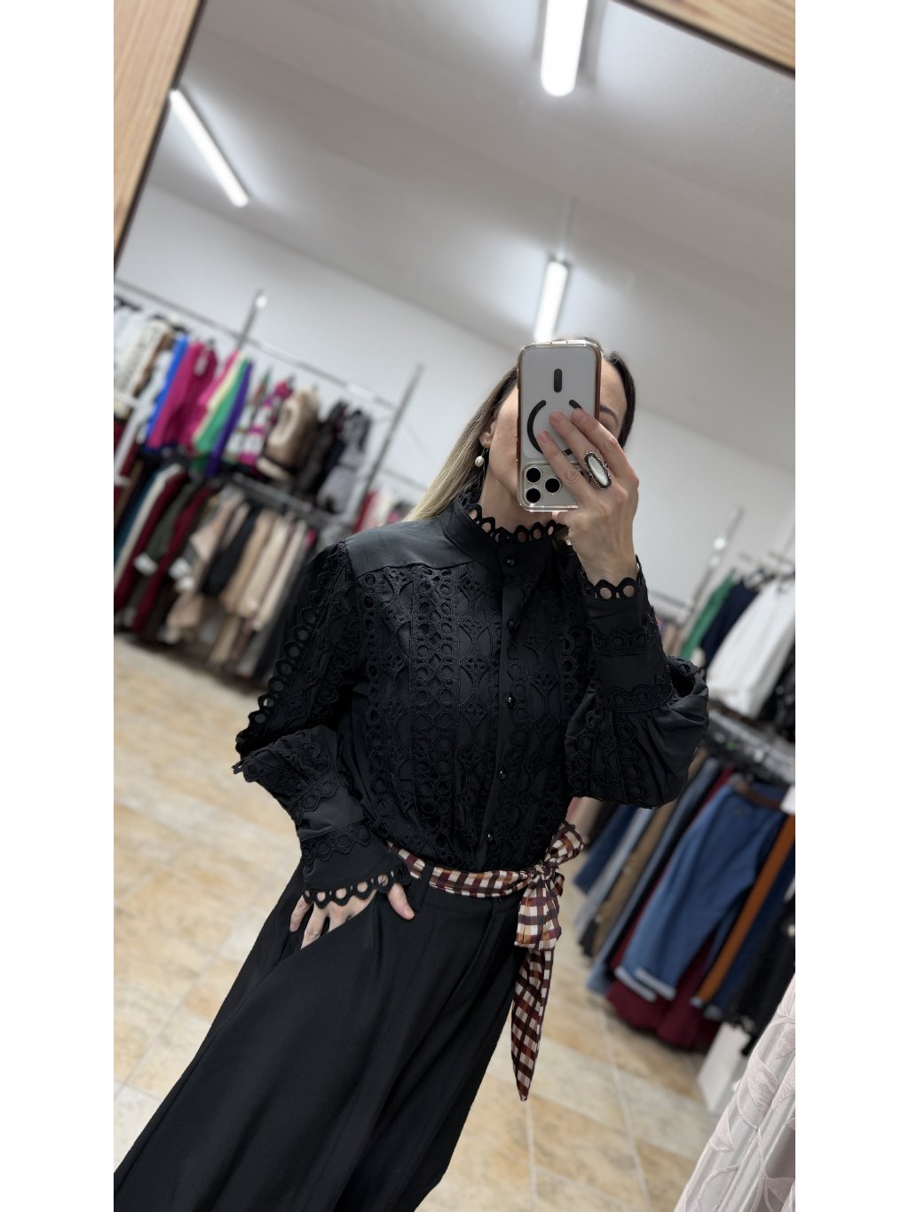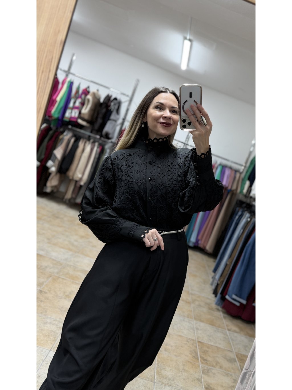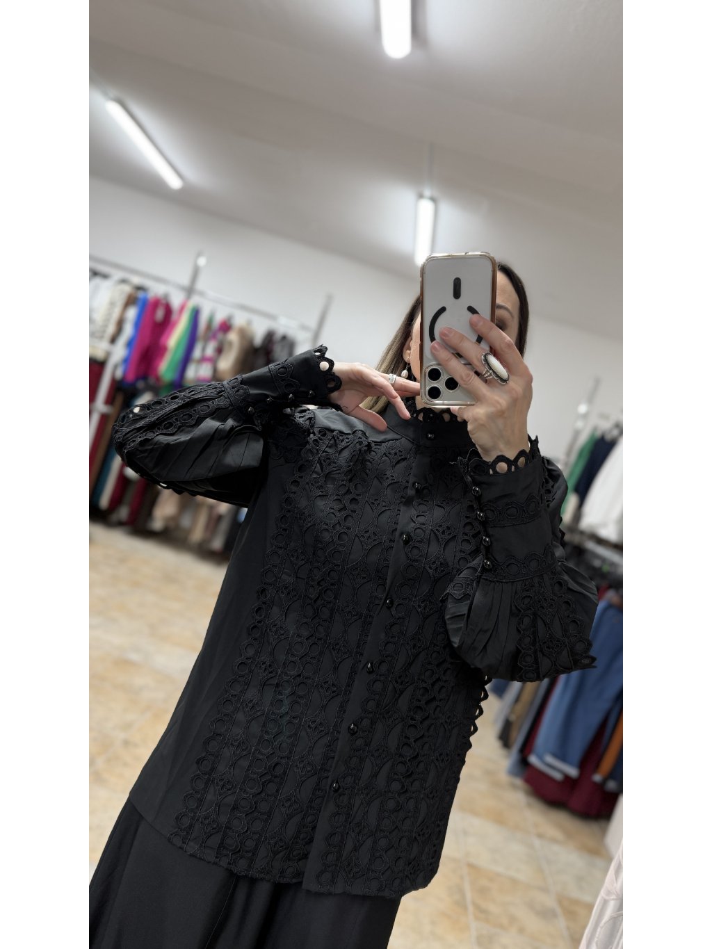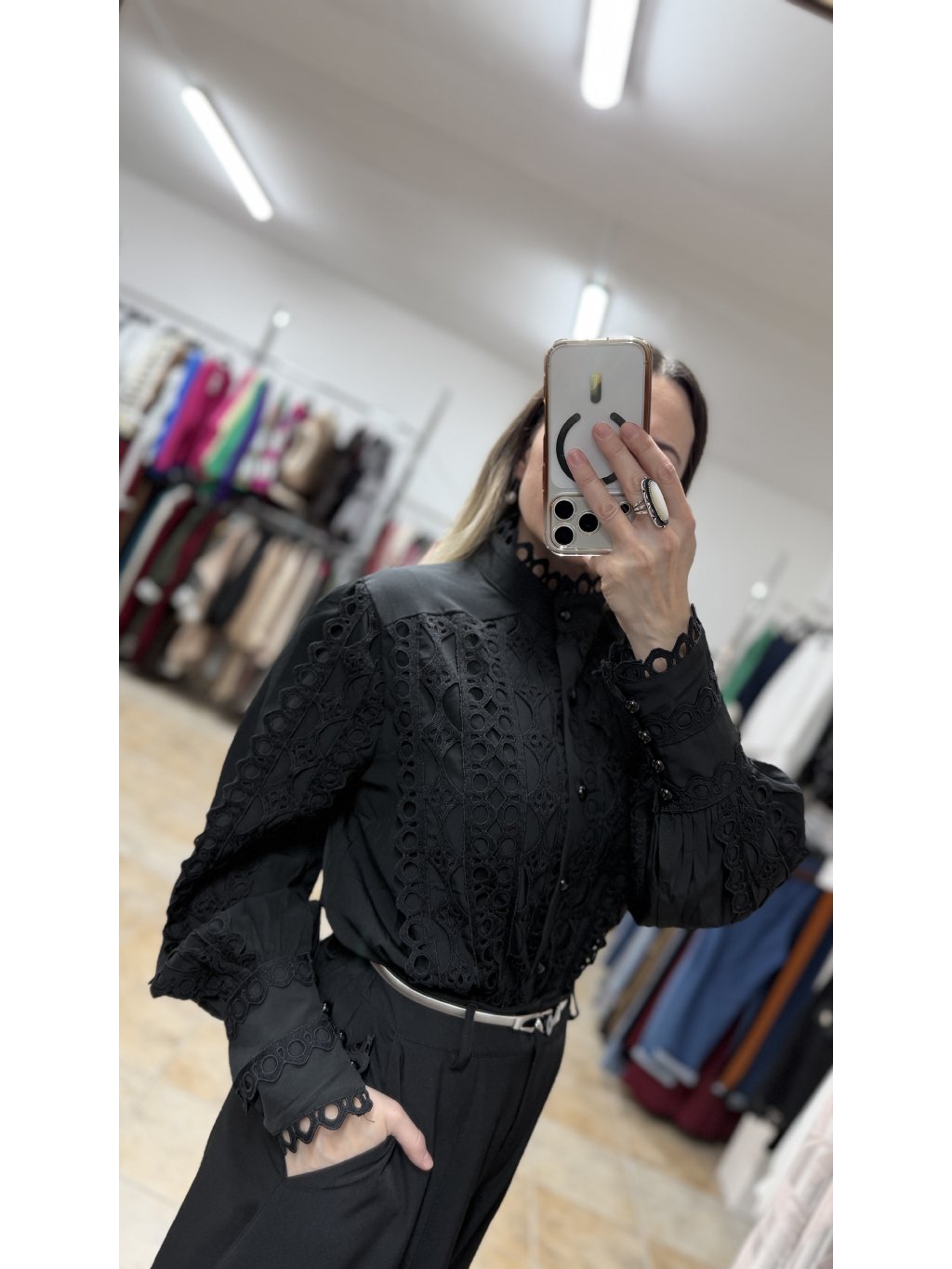 - táto čierna blúzka má stojáčikový golier zakončený jemným krajkovým lemom