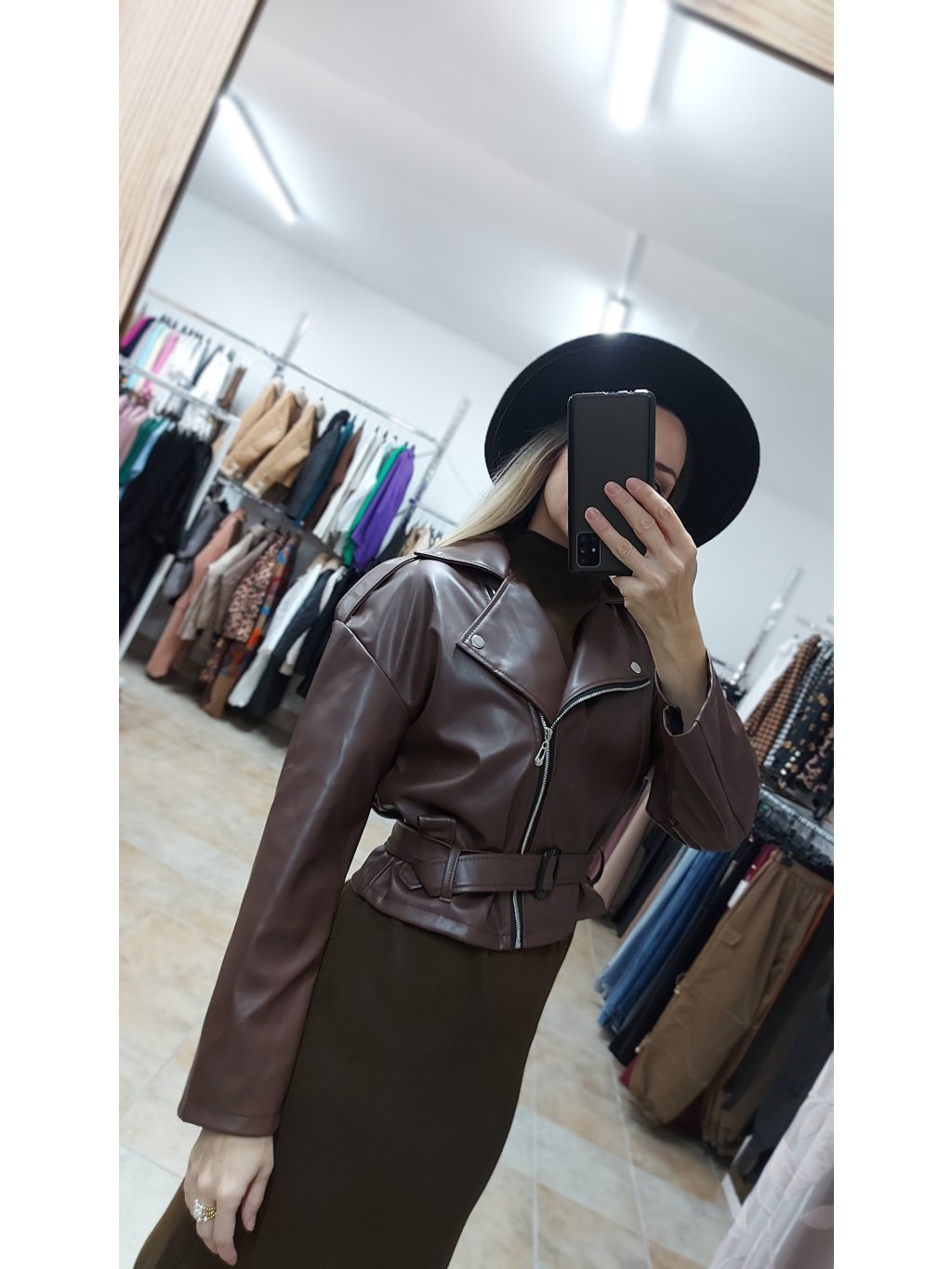 - hnedá koženka sa skvele kombinuje s rifľami, úpletovými šatami alebo sukňou s vysokým pásom