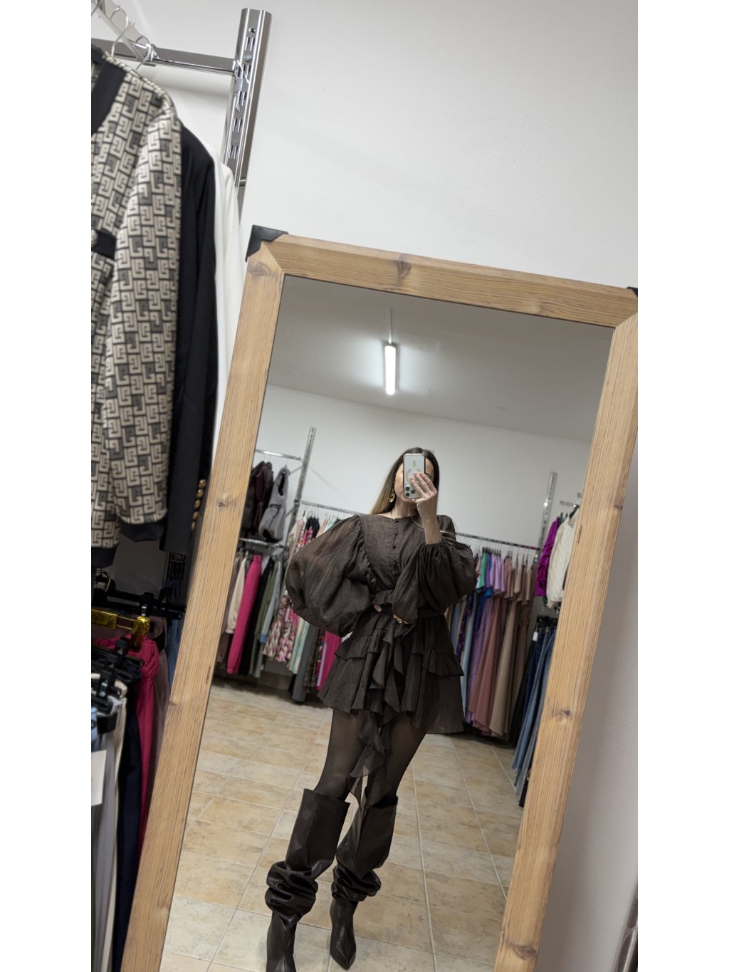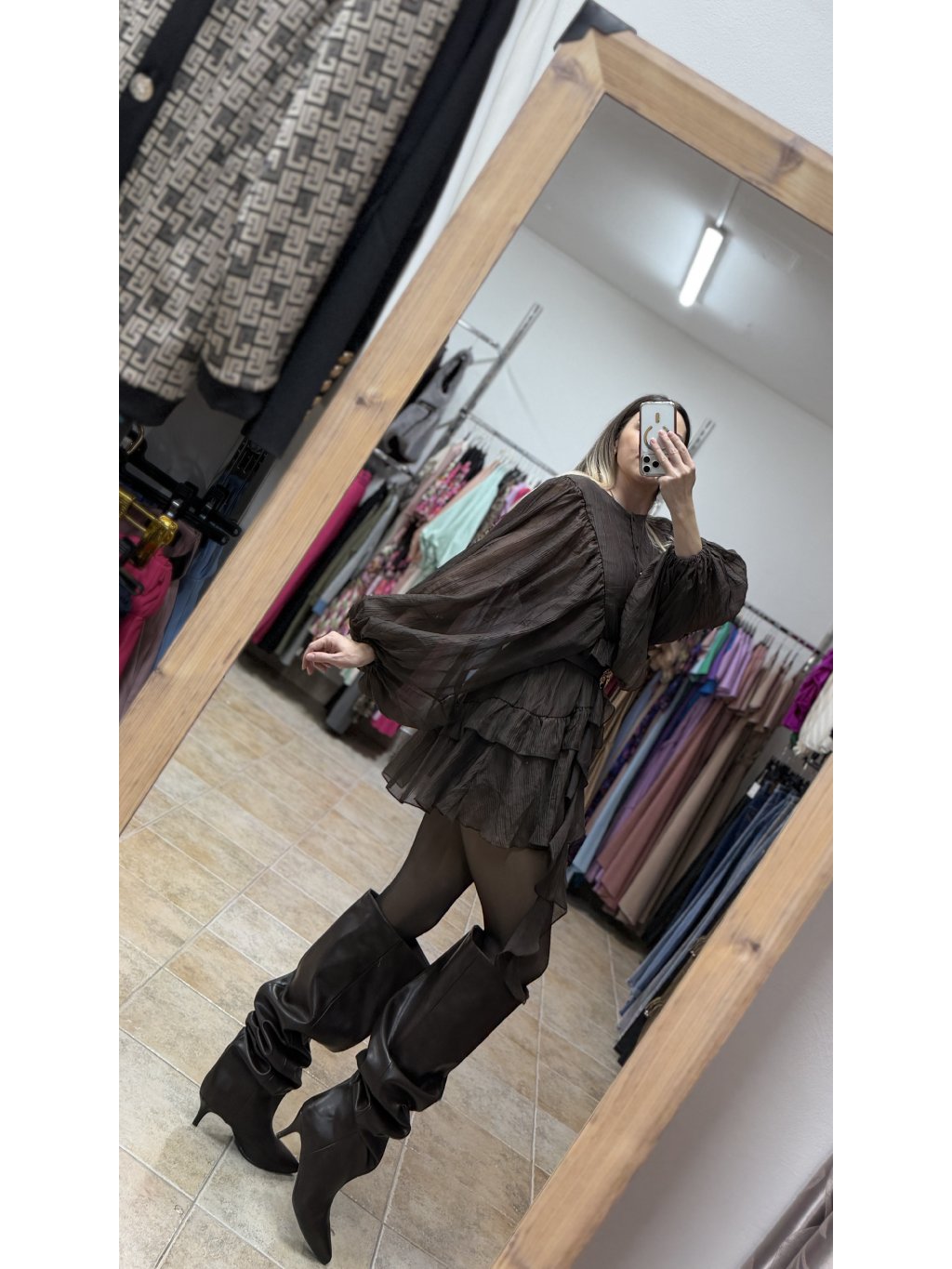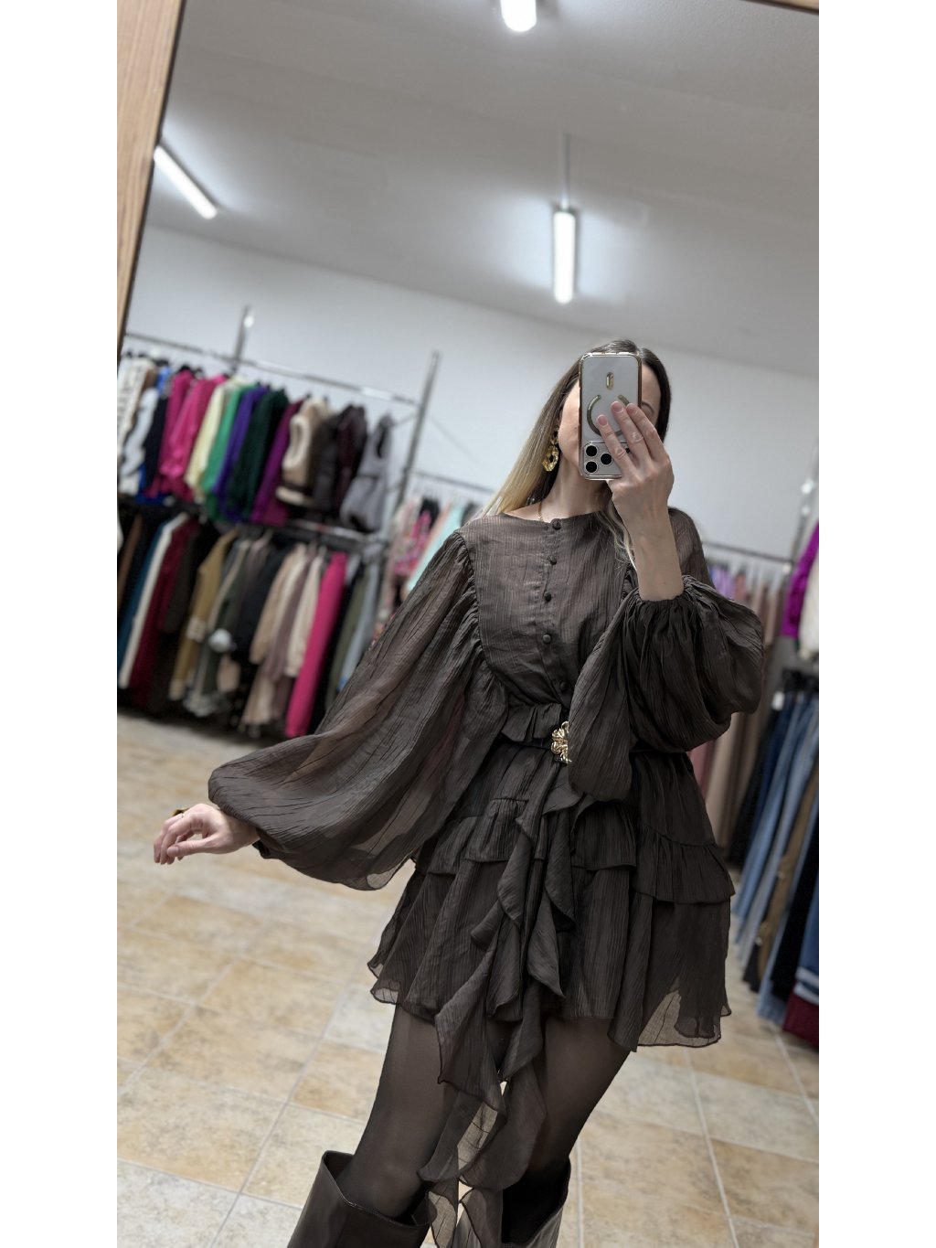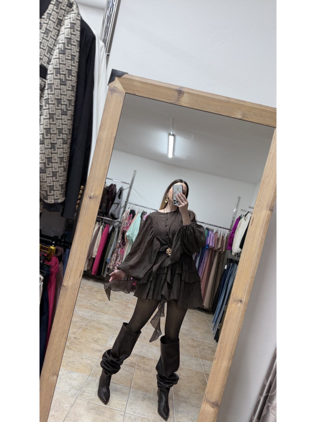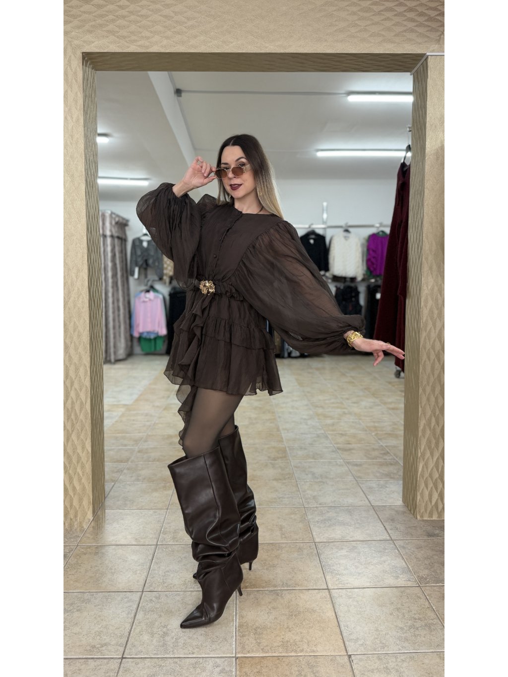 - volánové mini šaty s dlhým rukávom v tmavej čokoládovej hnedej farbe majú voľný a veľmi lichotivý strih, v páse doplnený o pružnú gumičku