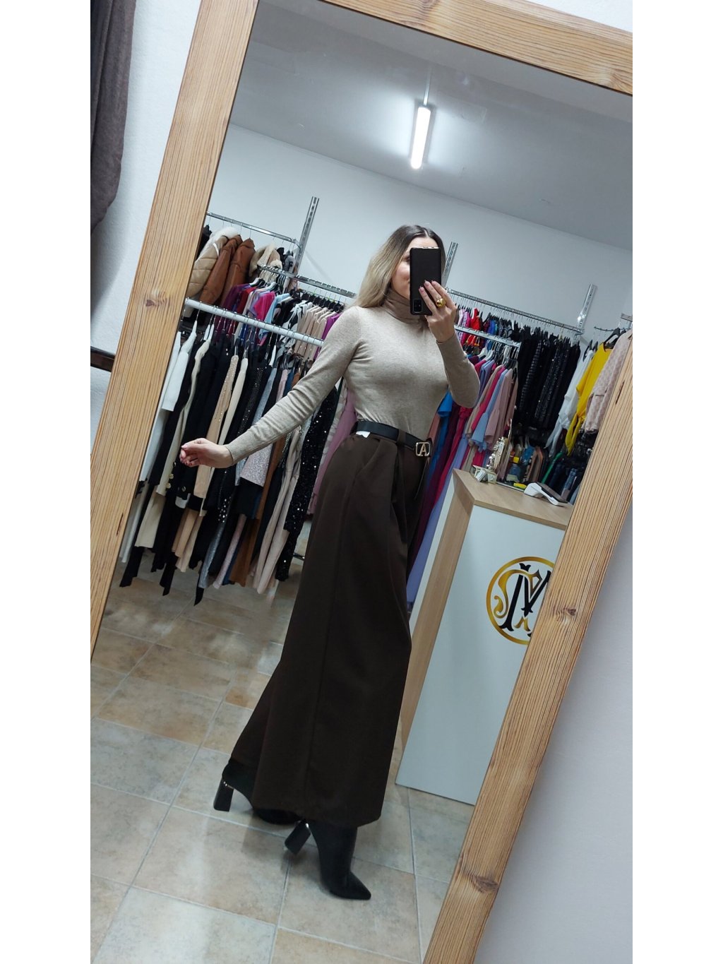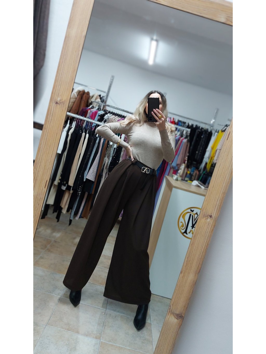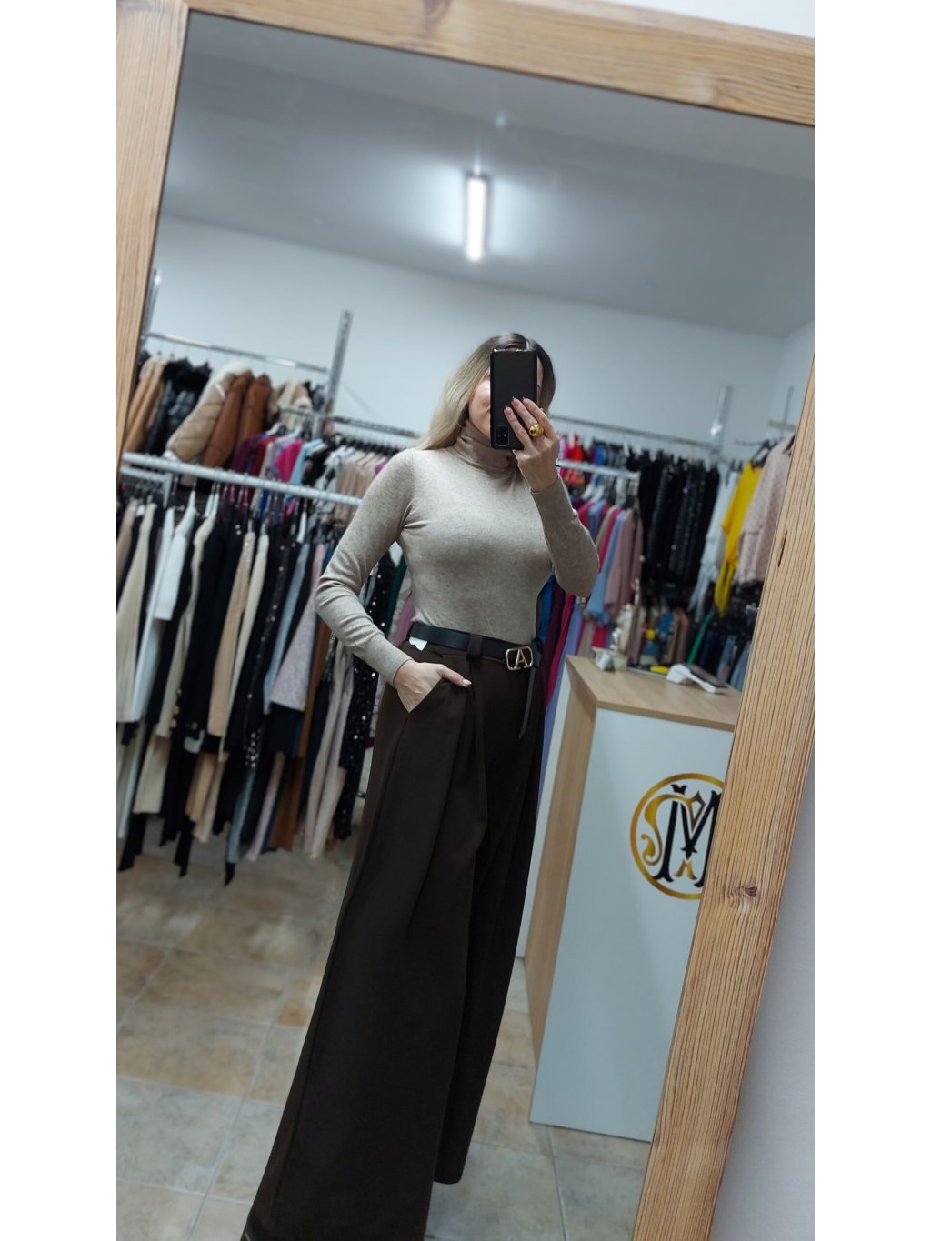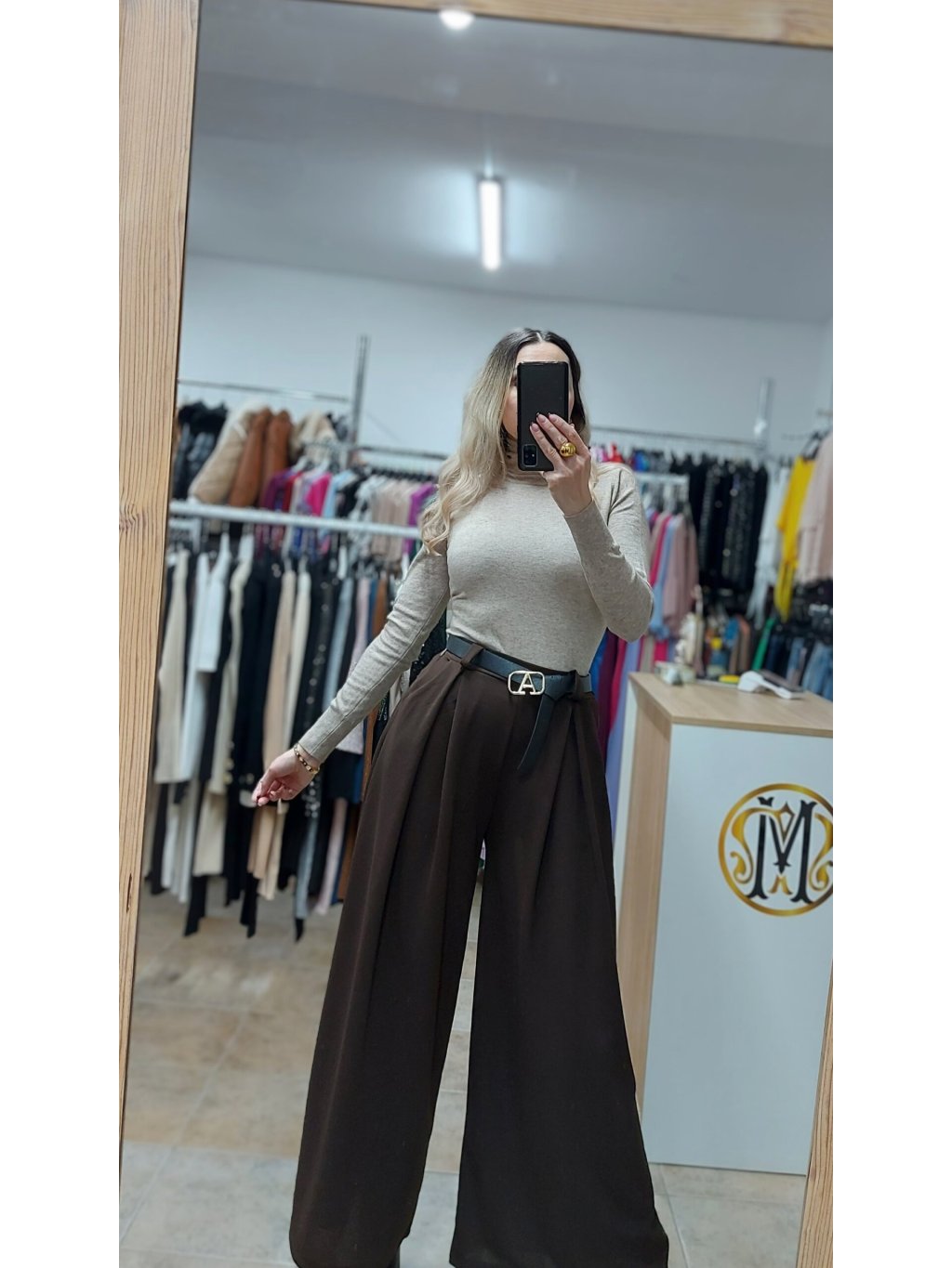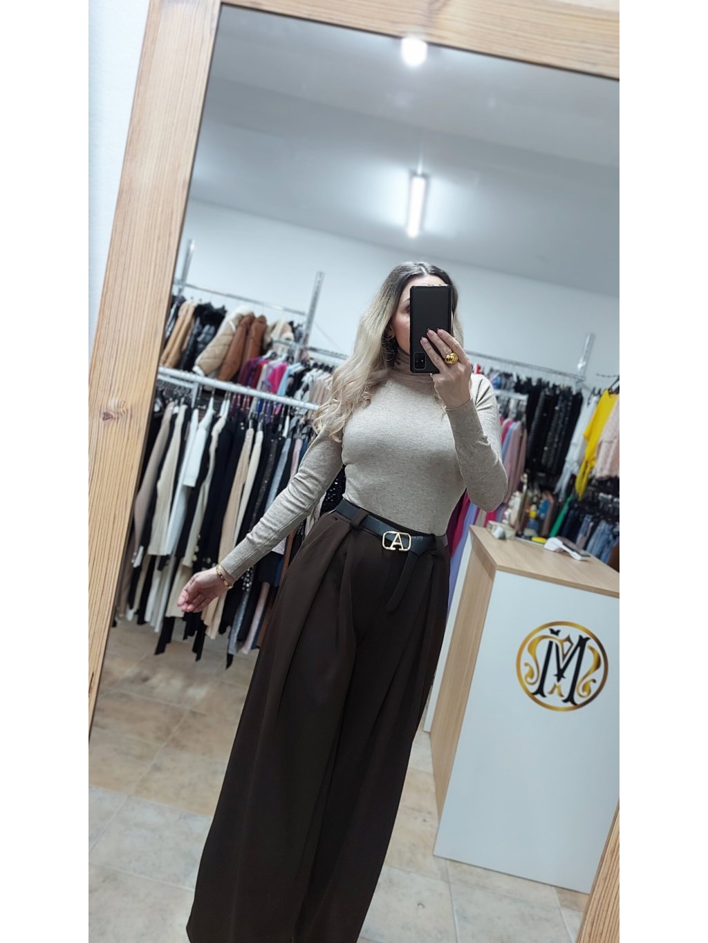 - tieto hnedé široké nohavice sú doplnené praktickými vreckami a opaskom so zlatou prackou, ktorý dotvára celkový efekt