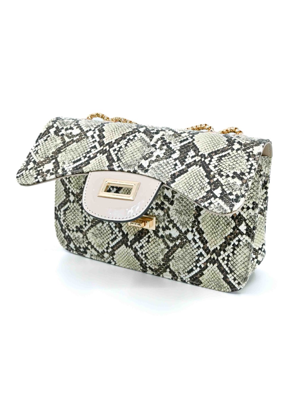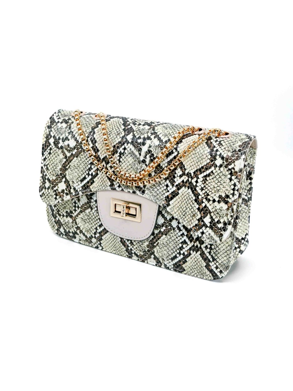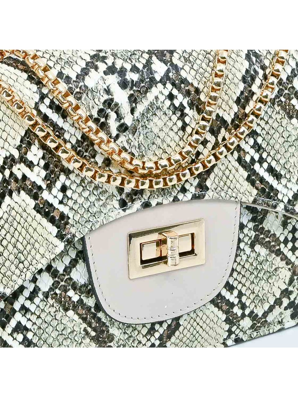 - táto kabelka s hadím vzorom sa zapína elegantným otočným zámkom v zlatej farbe