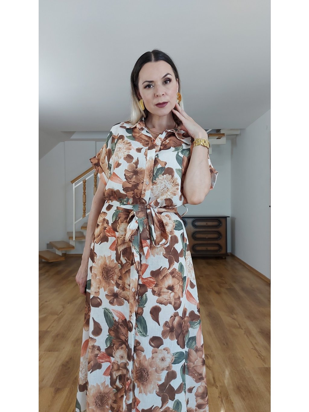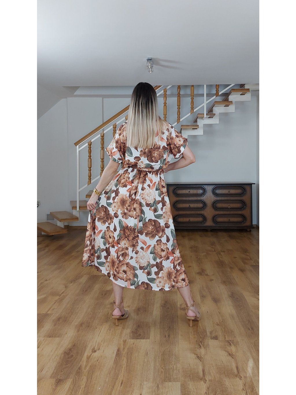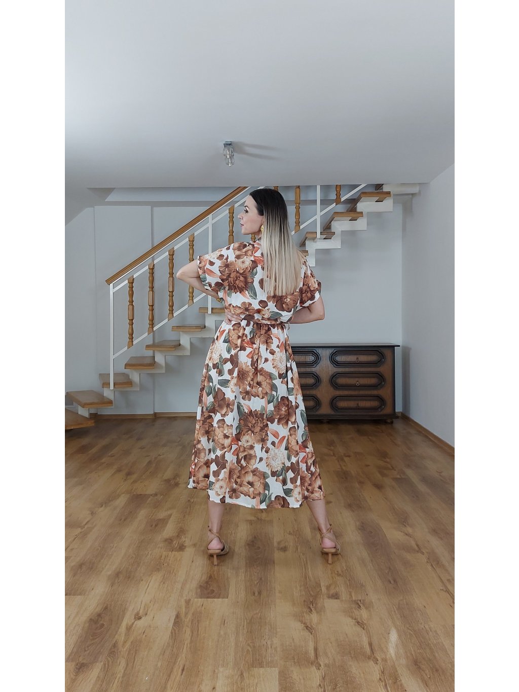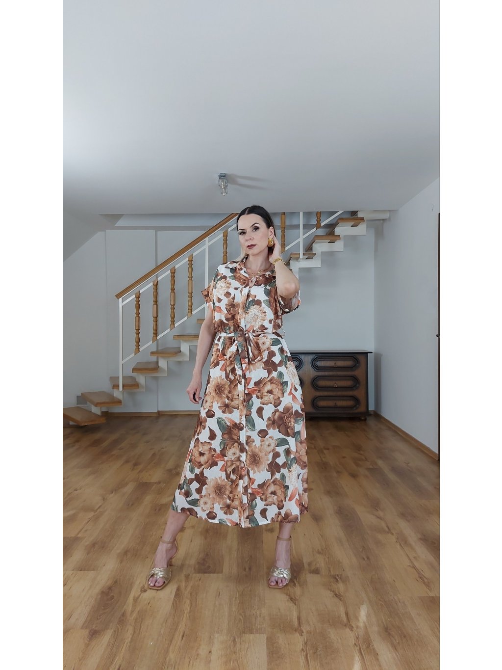 - potlač šiat je nádherná – na jemnom bielom podklade sa vynímajú väčšie kvety v teplých karamelových tónoch, doplnené o jemnučké odtiene oranžovej a decentné lístky