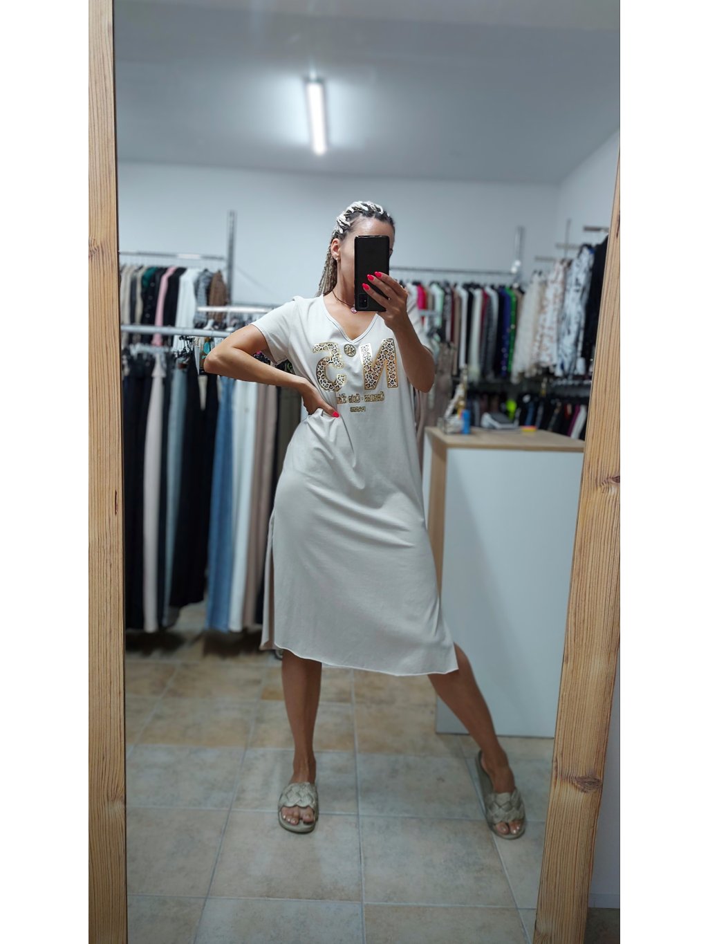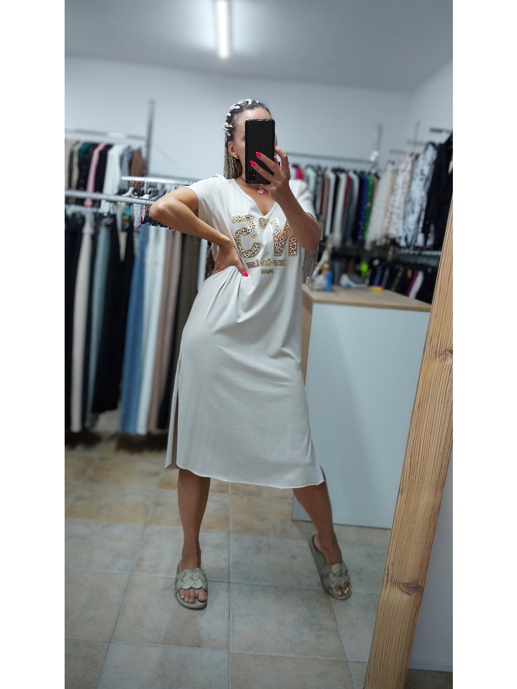 - to, čo tieto letné tričkové šaty ozvláštňuje, je štýlový nápis na hrudníku v duchu „Chanel vibes“ – vyzlátené písmo s jemným leopardím detailom pôsobí vkusne a moderne