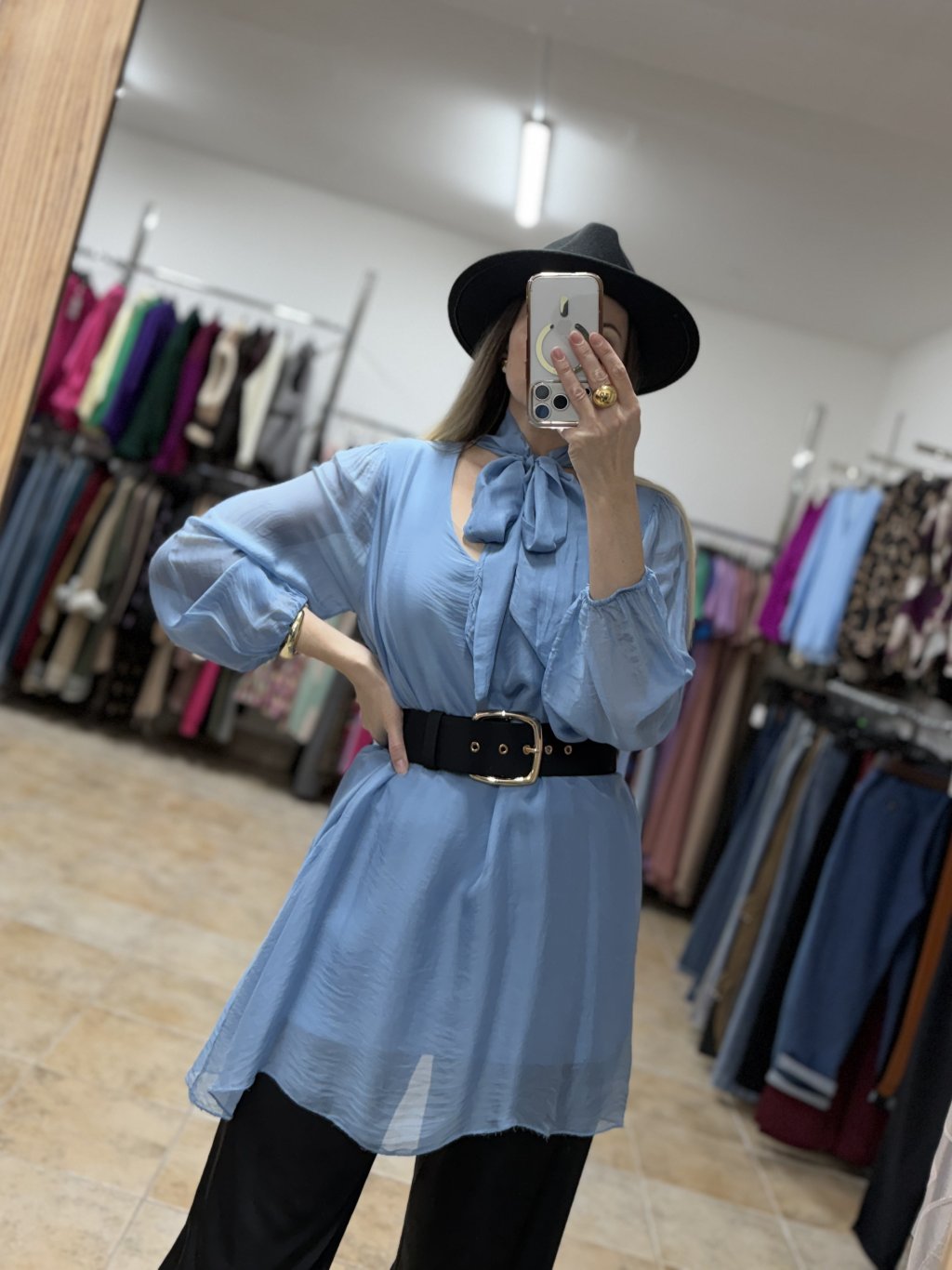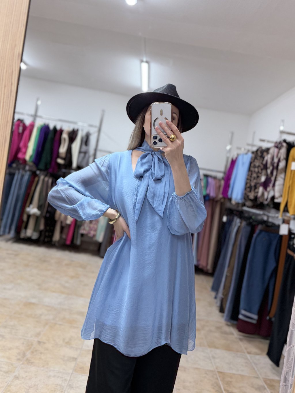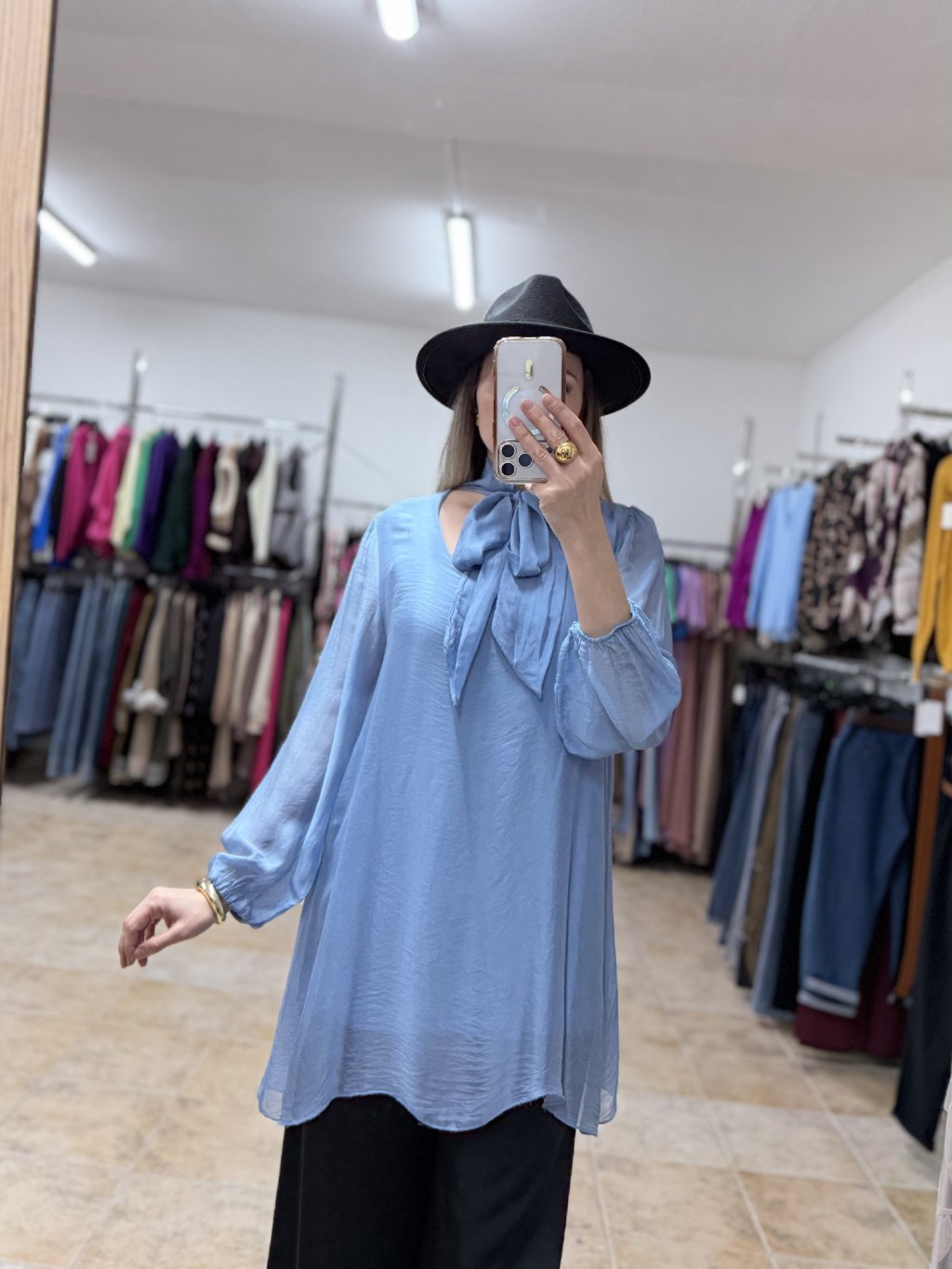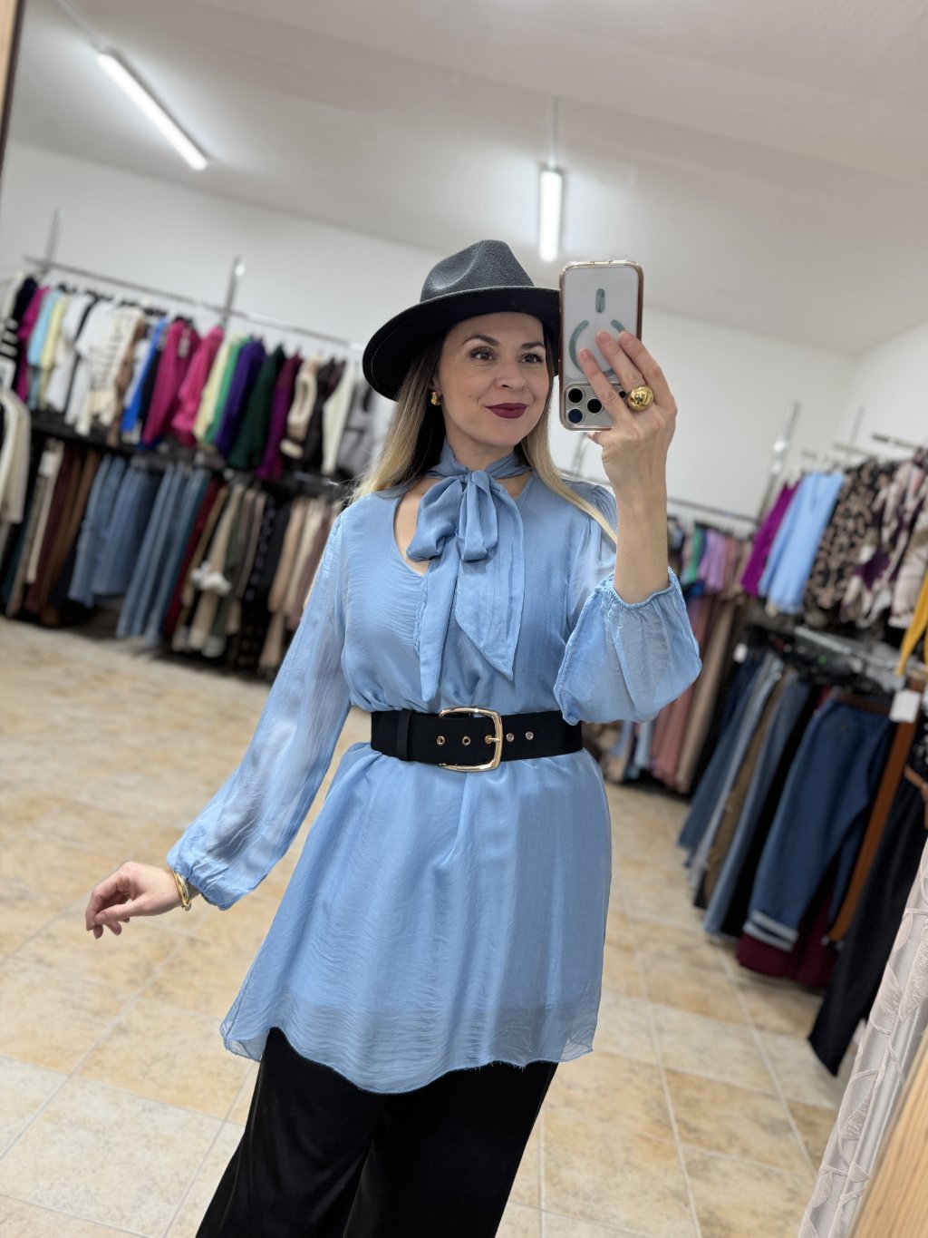 - elegantná predlžená blúzka z pravého hodvábu v jemnom denimovo-modrom odtieni
