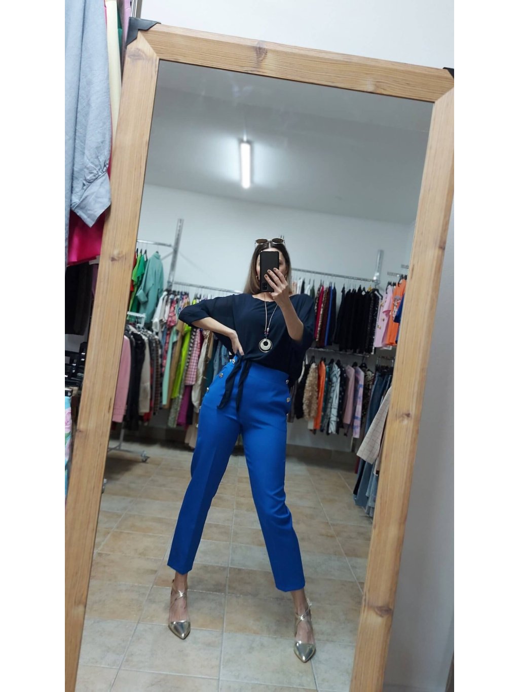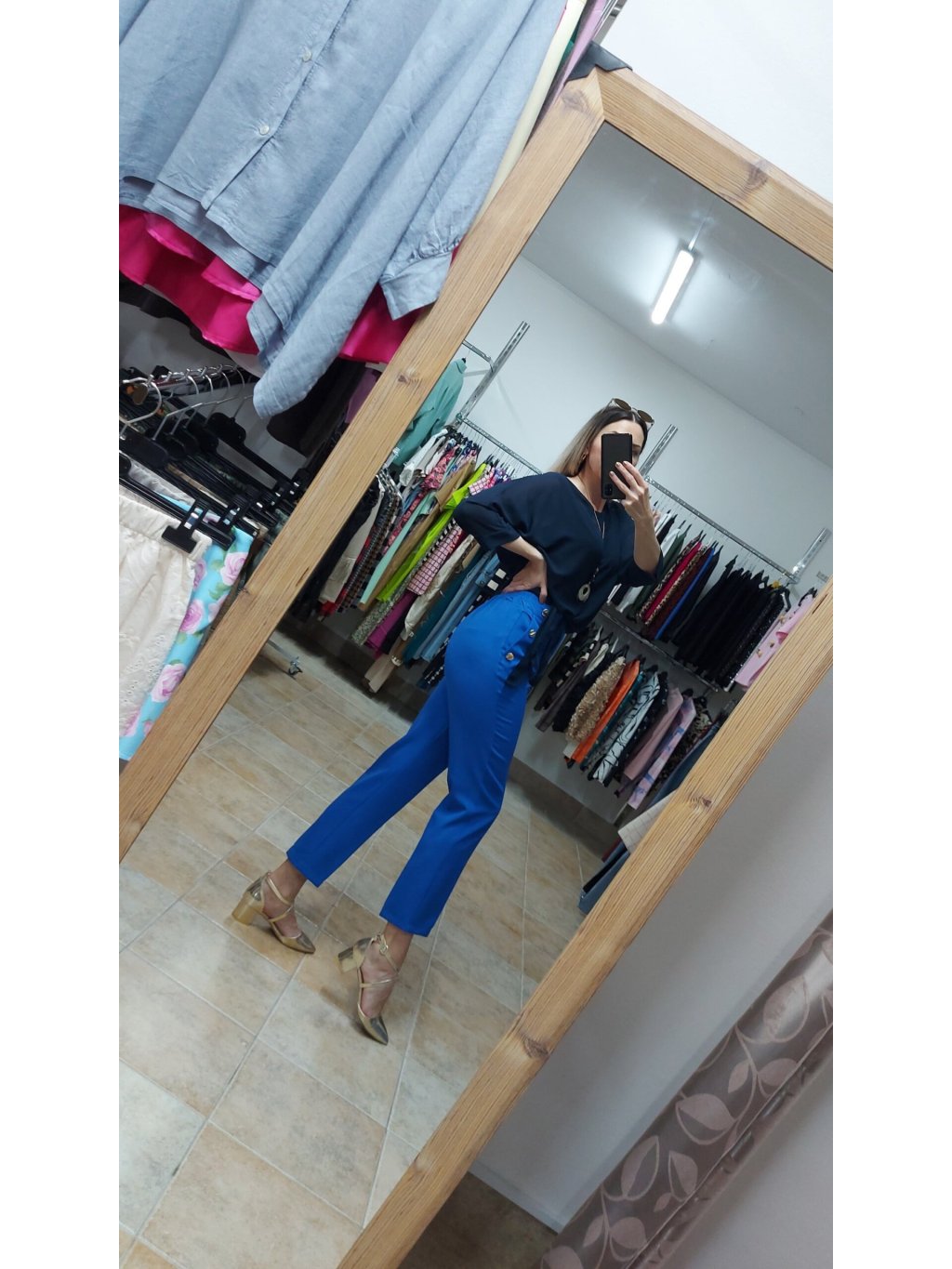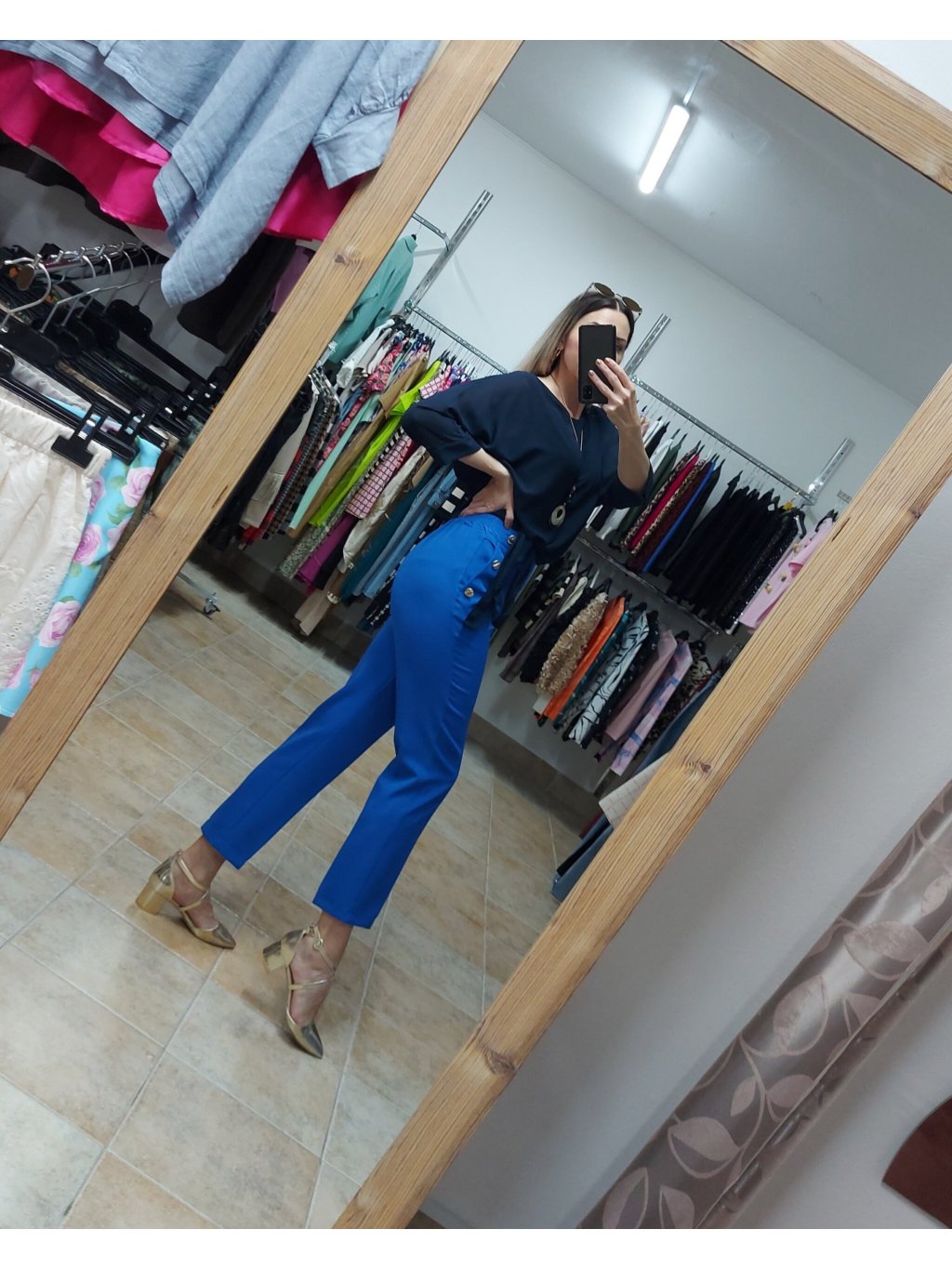 - po stranách majú tieto modré nohavice praktické vrecká, ktoré sú zvýraznené jemnými zlatými gombíkmi, dodávajúcimi im sofistikovaný nádych