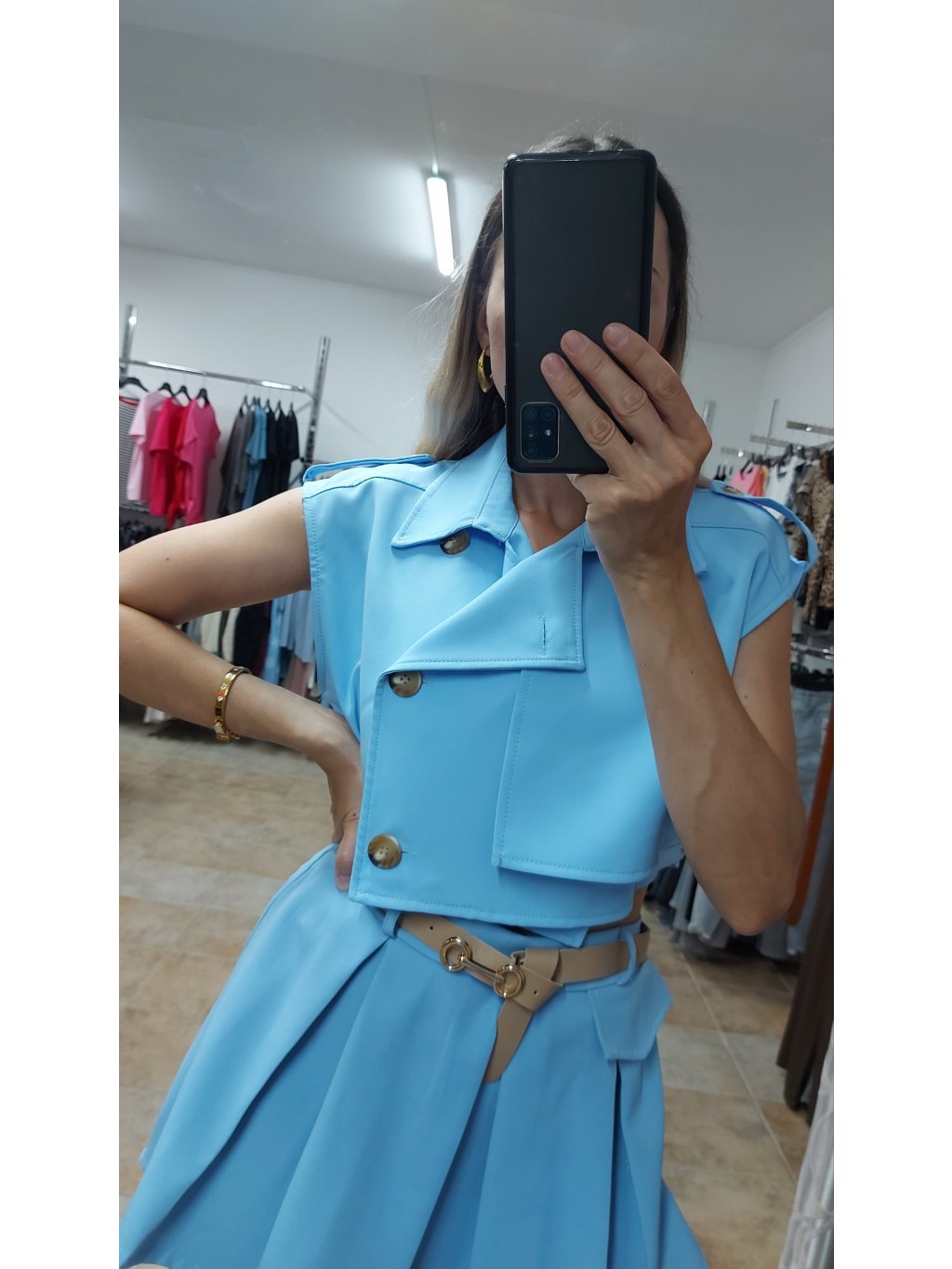 - béžový opasok so zlatou prackou krásne zvýrazní pás a prepojí celý look