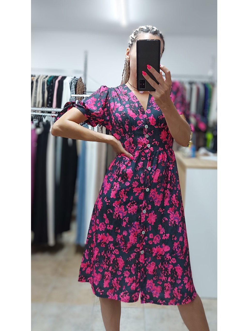 - šaty siahajú pod kolená a na čiernom podklade zdobia vzor farebných fuchsiových kvetov doplnených o jemné fialové odtiene