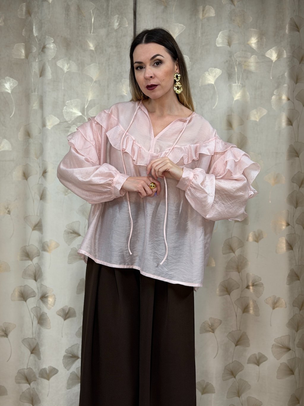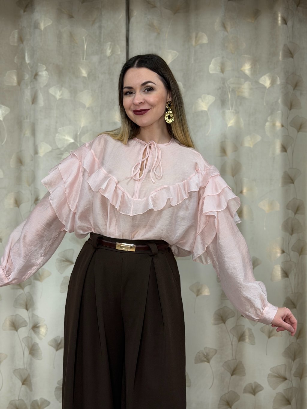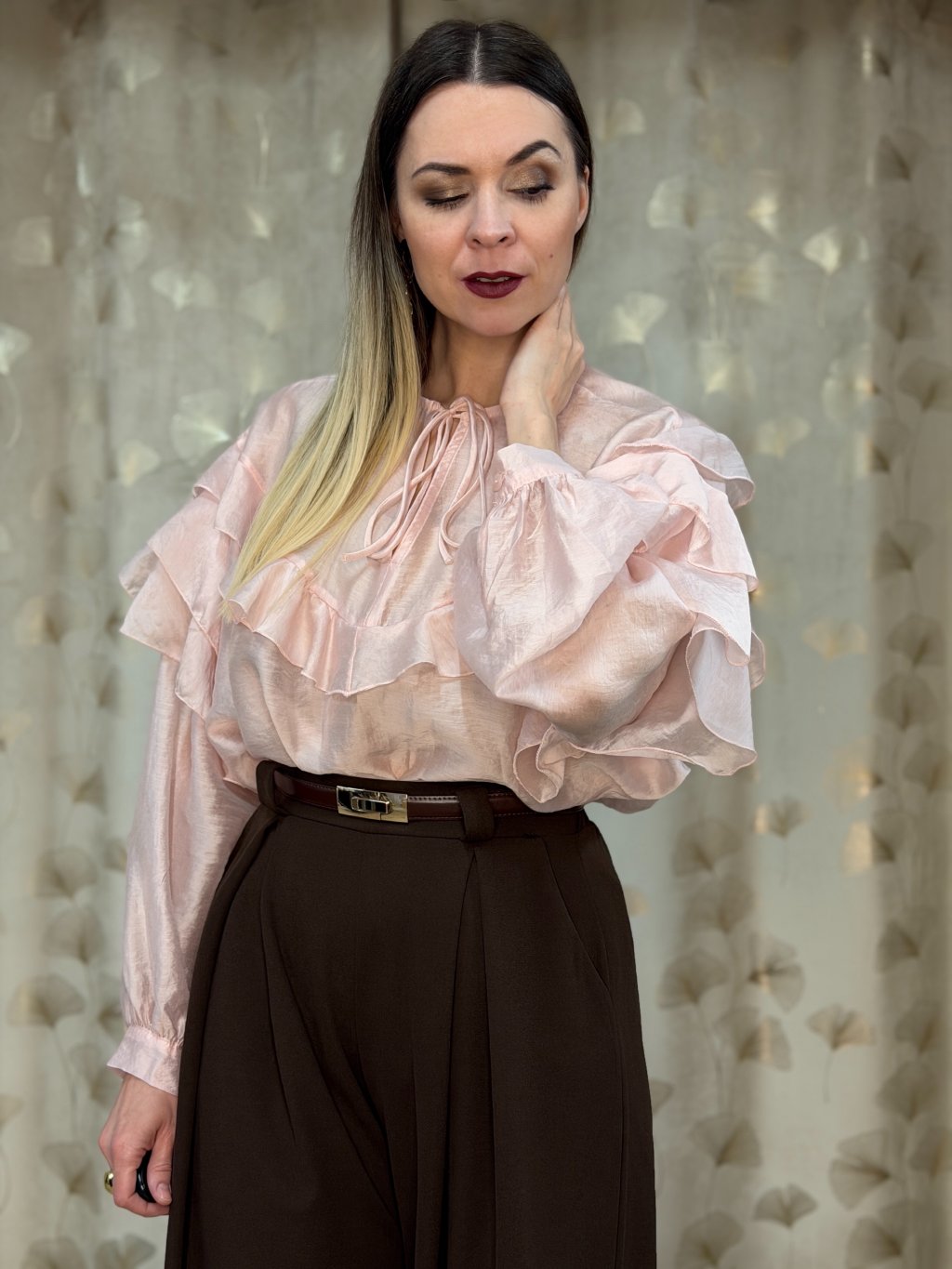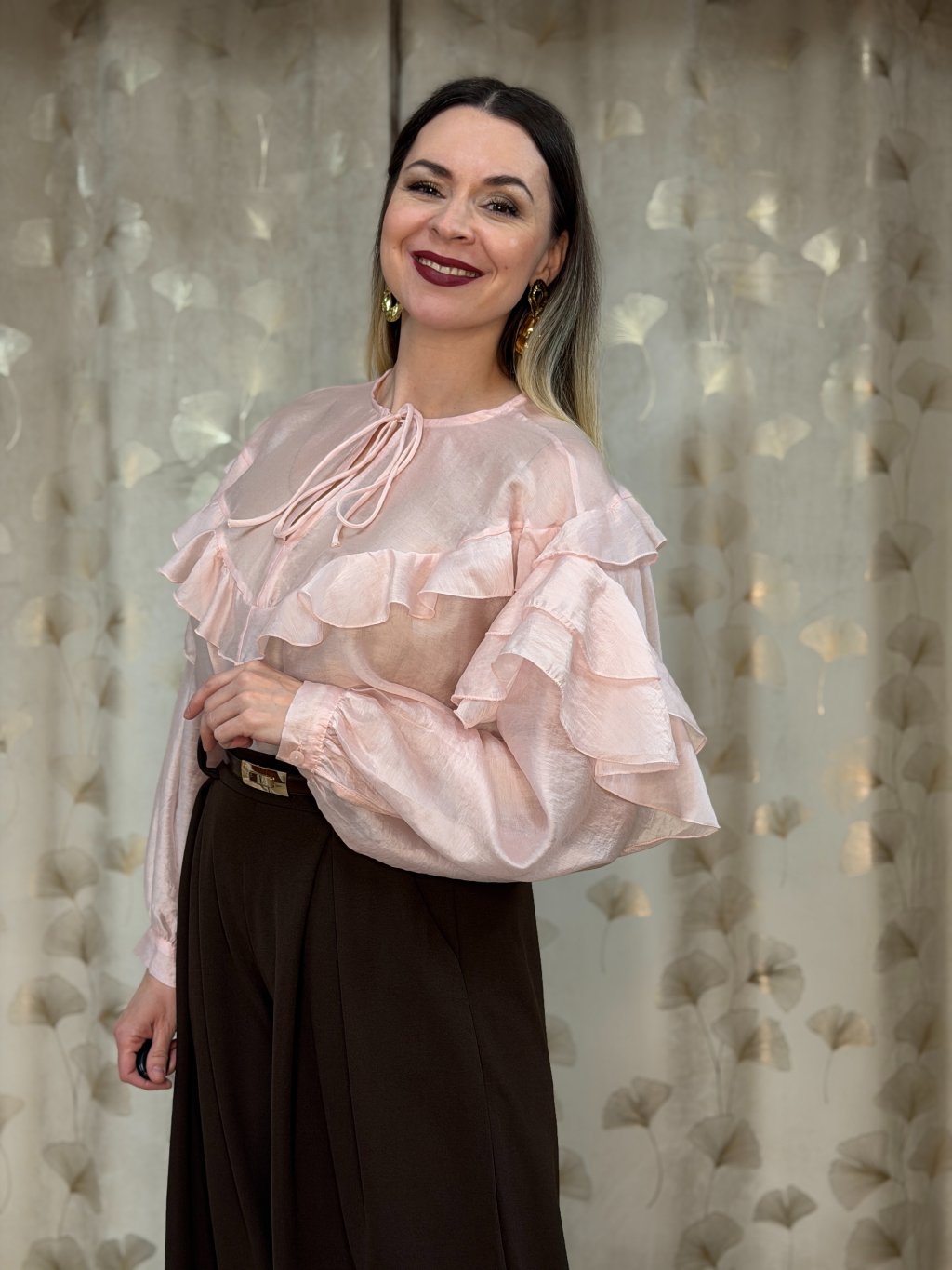 - jemná dámska volánová blúzka vo veľmi svetlom porcelánovo-ružovom odtieni