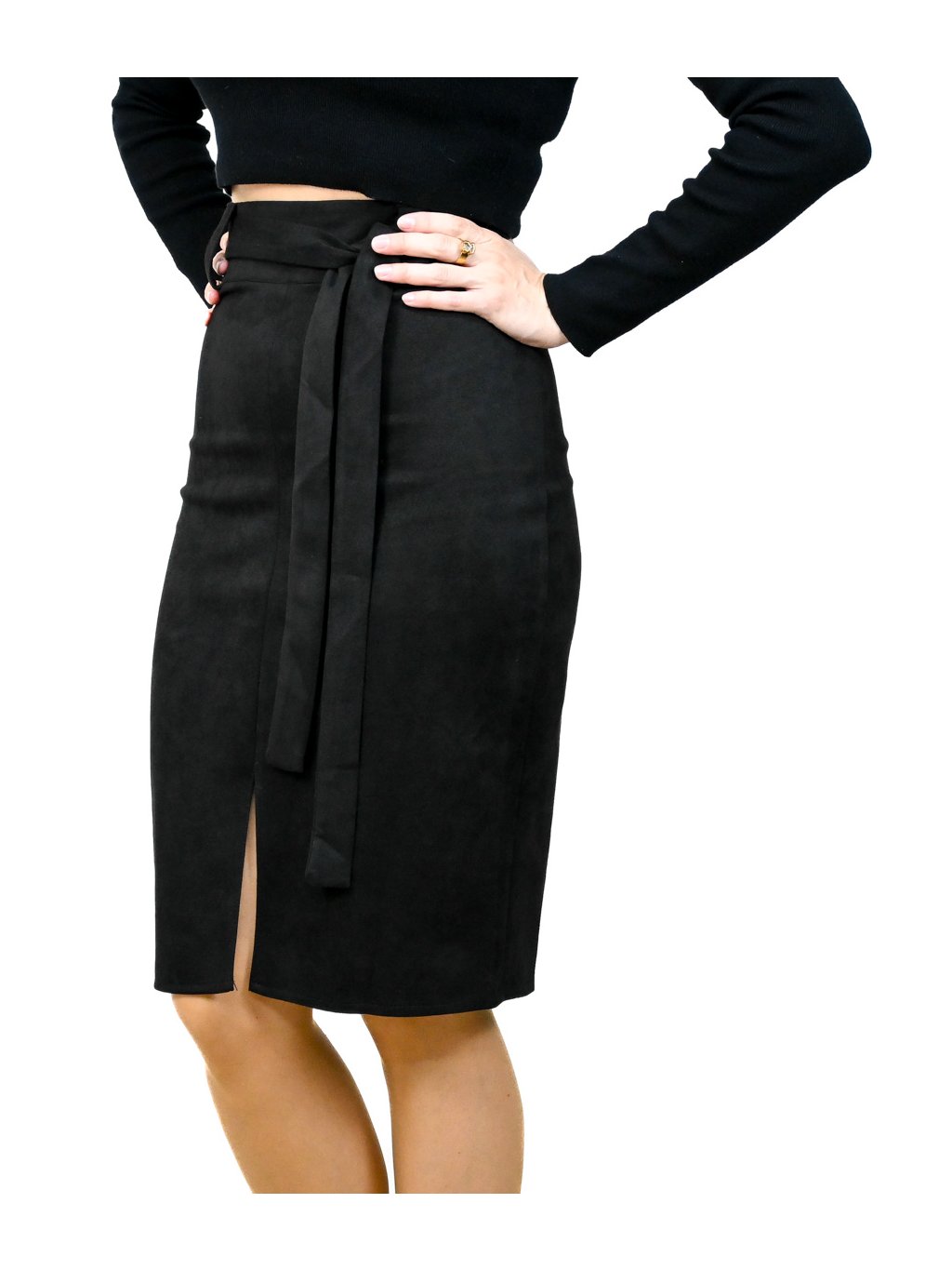- táto semišová sukňa je v klasickej čiernej farbe, takže ju ľahko zladíš s elegantnou blúzkou, rolákom či topom – ideálna do práce, na večeru alebo na špeciálne príležitosti