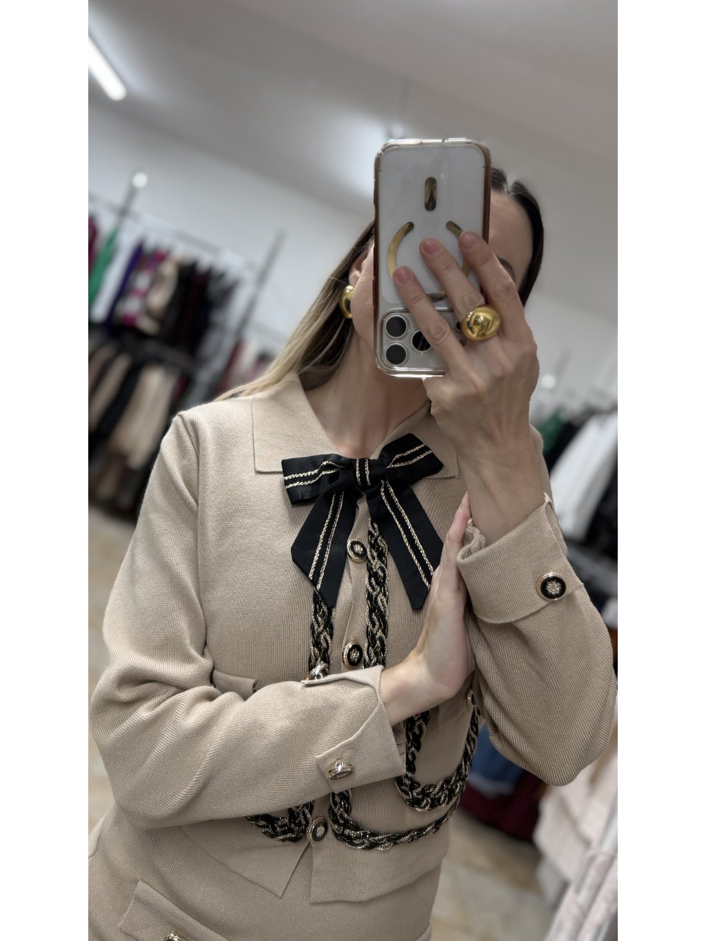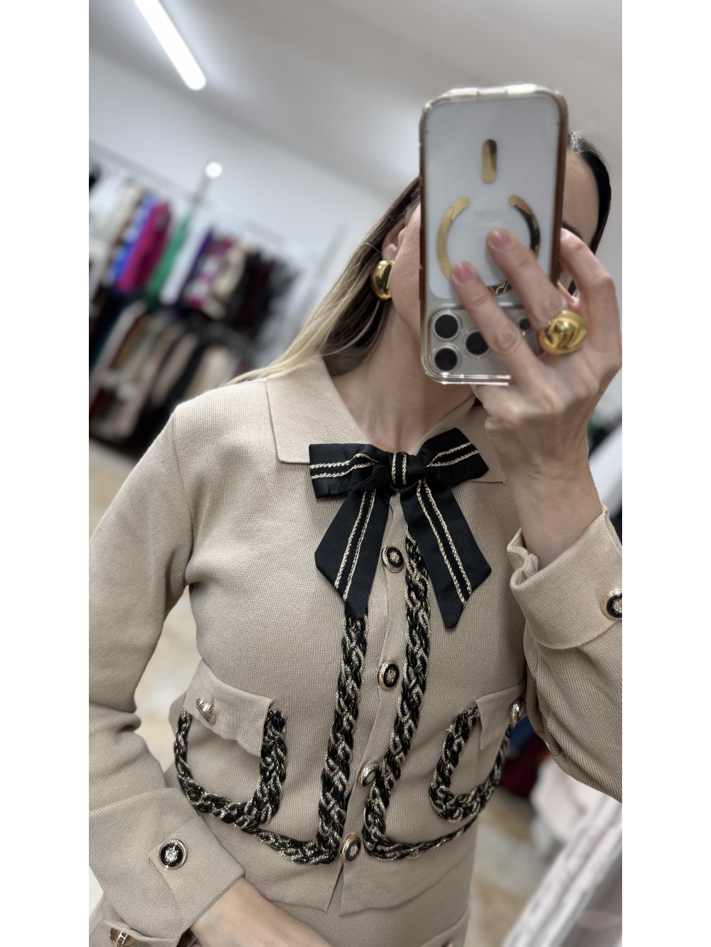 - sačko má klasický, elegantný strih s dlhými rukávmi, ktoré sú ukončené manžetou a dvomi ozdobnými gombíkmi