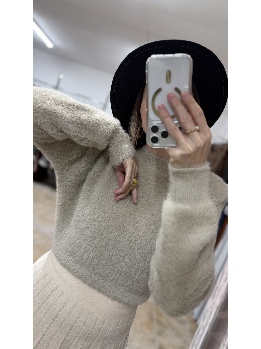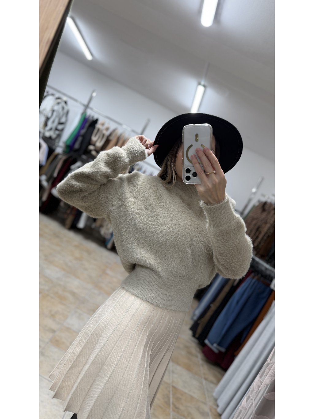- strih svetra je mierne kratší, no pôsobí veľmi vyvážene – v páse je jemne zúžený, takže prirodzene vytvára peknú siluetu a hodí sa aj k vyššiemu pásu