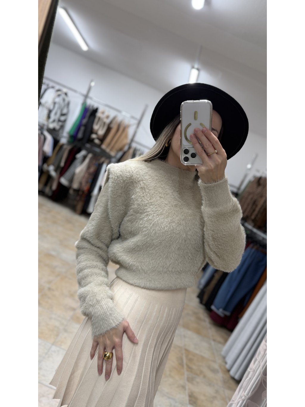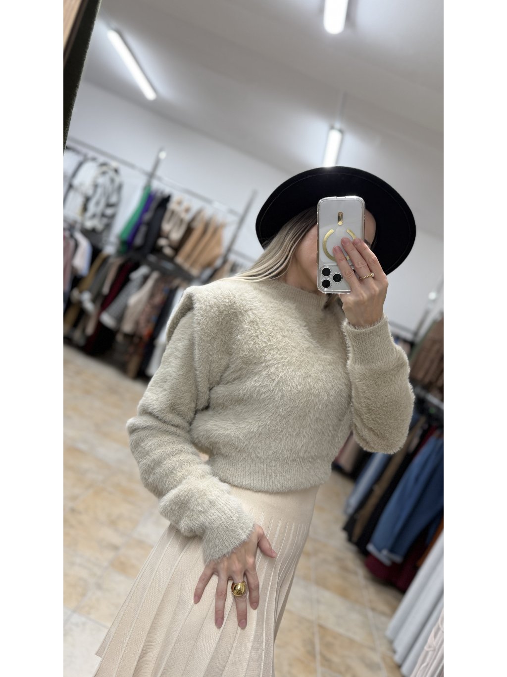 - zaujímavým detailom sú ramená so zdvojeným materiálom, ktoré jemne vytvárajú dojem vypchávok – nie sú výrazné, ale dodávajú svetru štruktúru a krásne formujú hornú líniu postavy