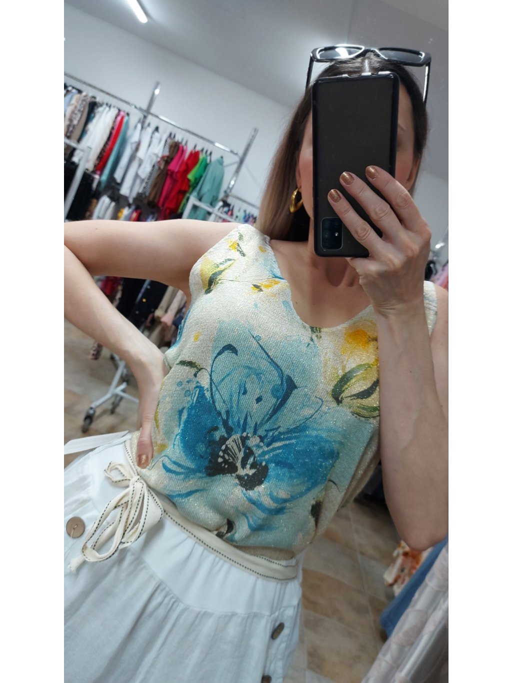 - celý top bez rukávov je jemne pretkávaný zlatou niťou, ktorá sa na svetle nádherne leskne a dodáva mu luxusný nádych bez toho, aby pôsobil prehnane, výsledok je ľahký, ženský a štýlový