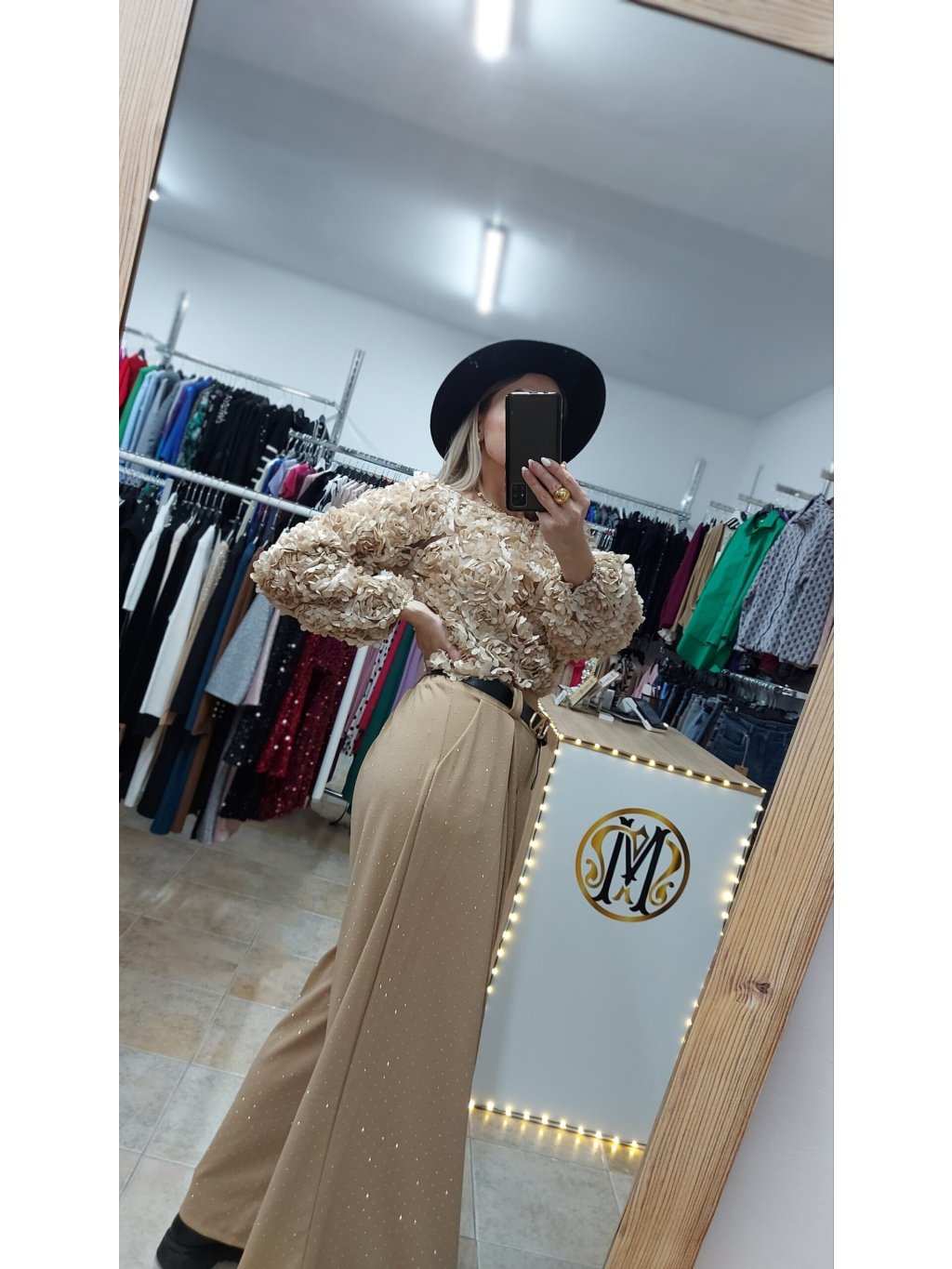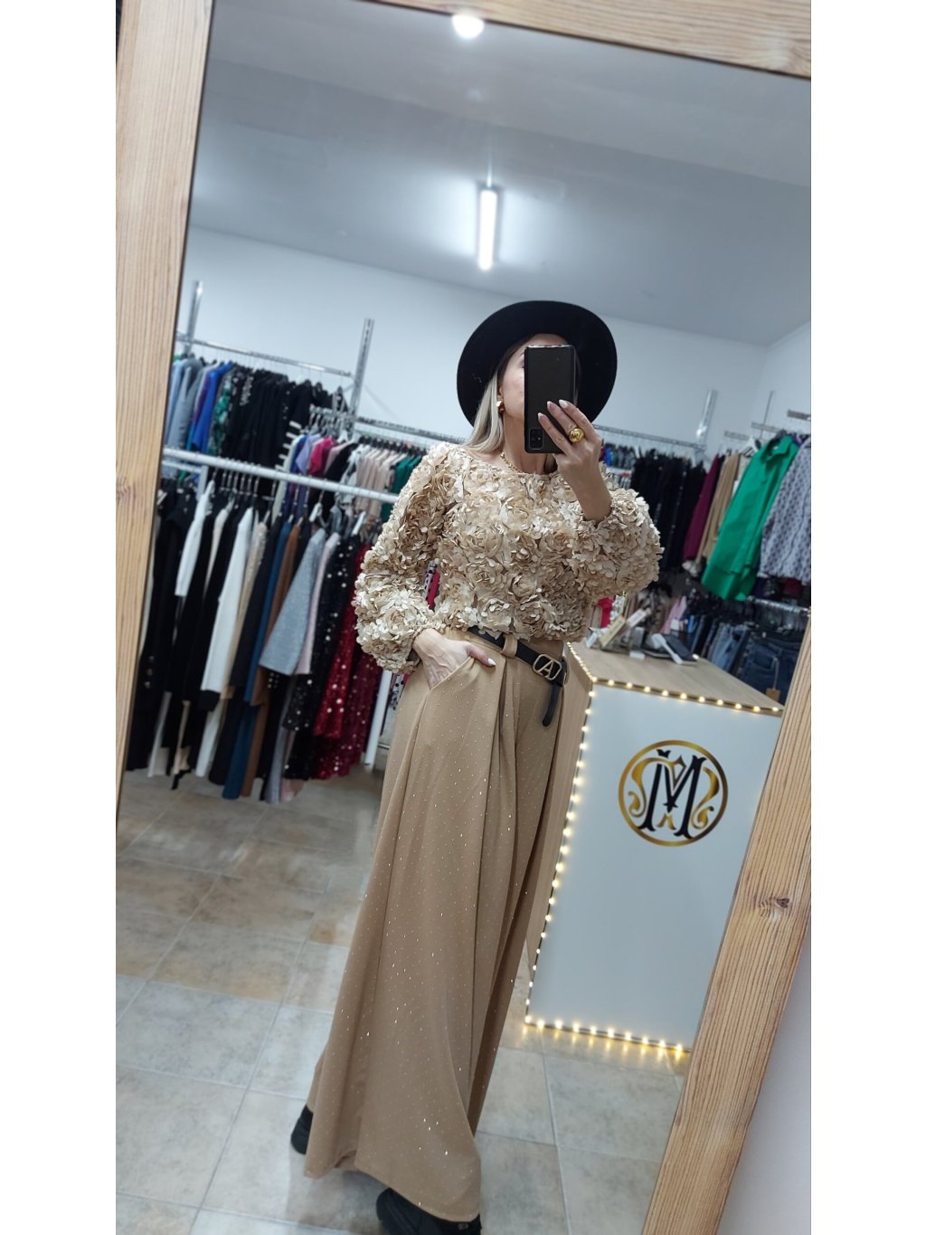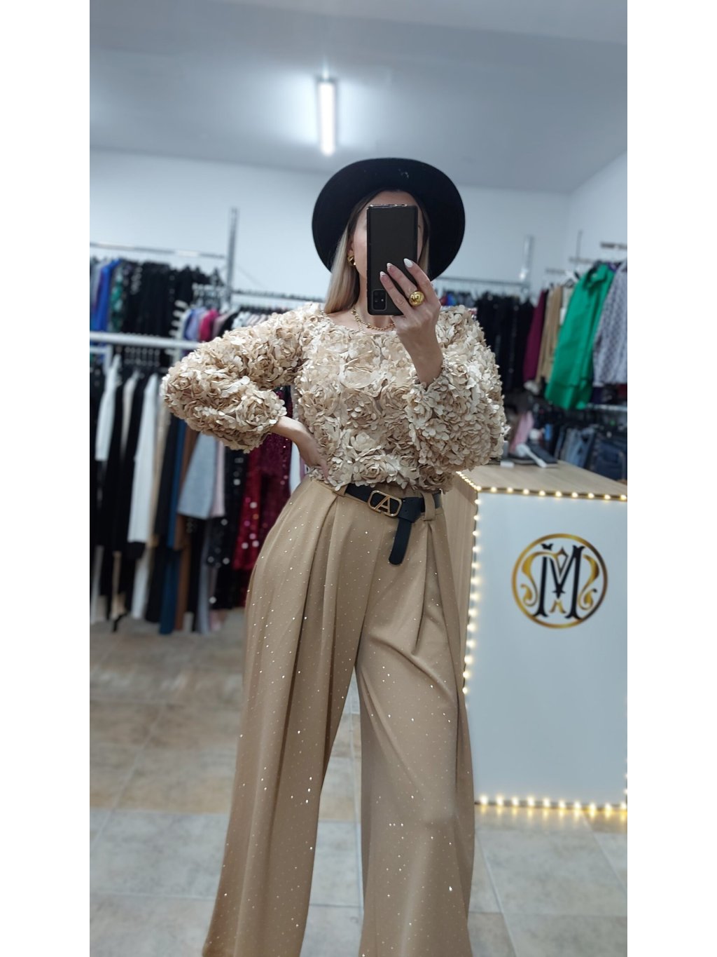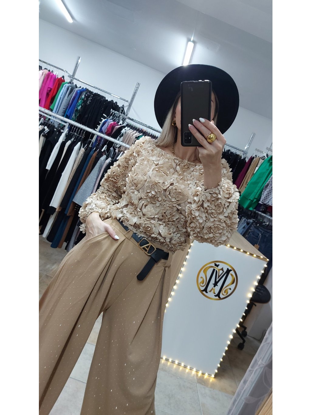 - praktické bočné vrecká zvyšujú ich ležérnosť a štýl dopĺňa čierny koženkový opasok so zlatou sponou, ktorý dodáva outfitu kontrast a eleganciu