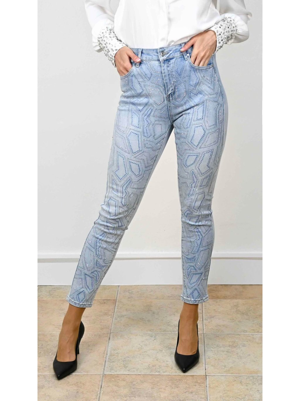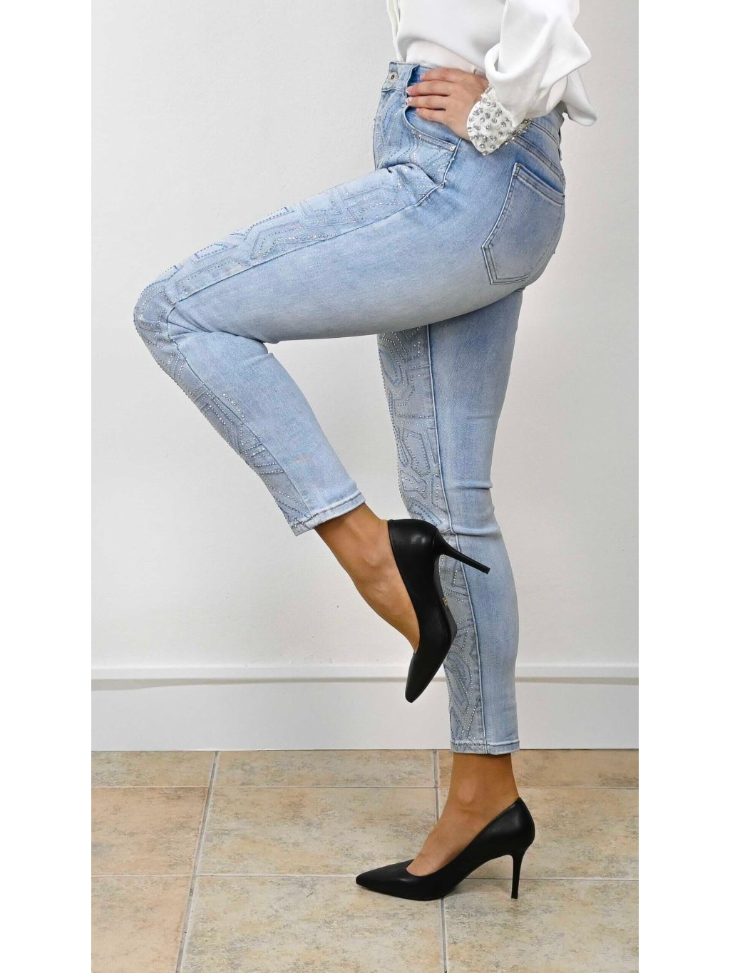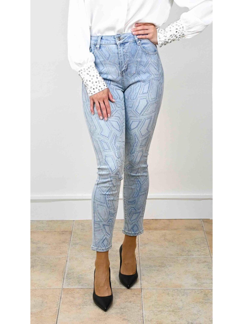 - tieto rifle s kamienkami perfektne vyniknú v kombinácii s jednoduchým topom alebo saténovou blúzkou, kde necháš vyniknúť ich zdobenie