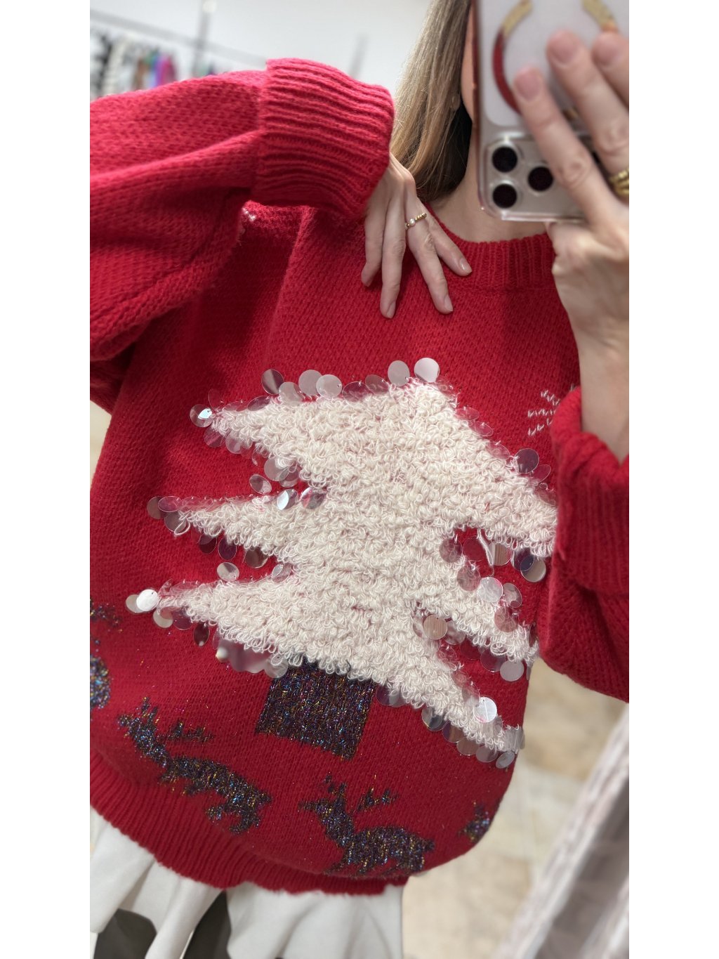 - červený vianočný sveter Tree je malý módny „darček“ – presne ten typ kúsku, ktorý pôsobí hravo, ikonicky a pritom neskutočne pohodlne