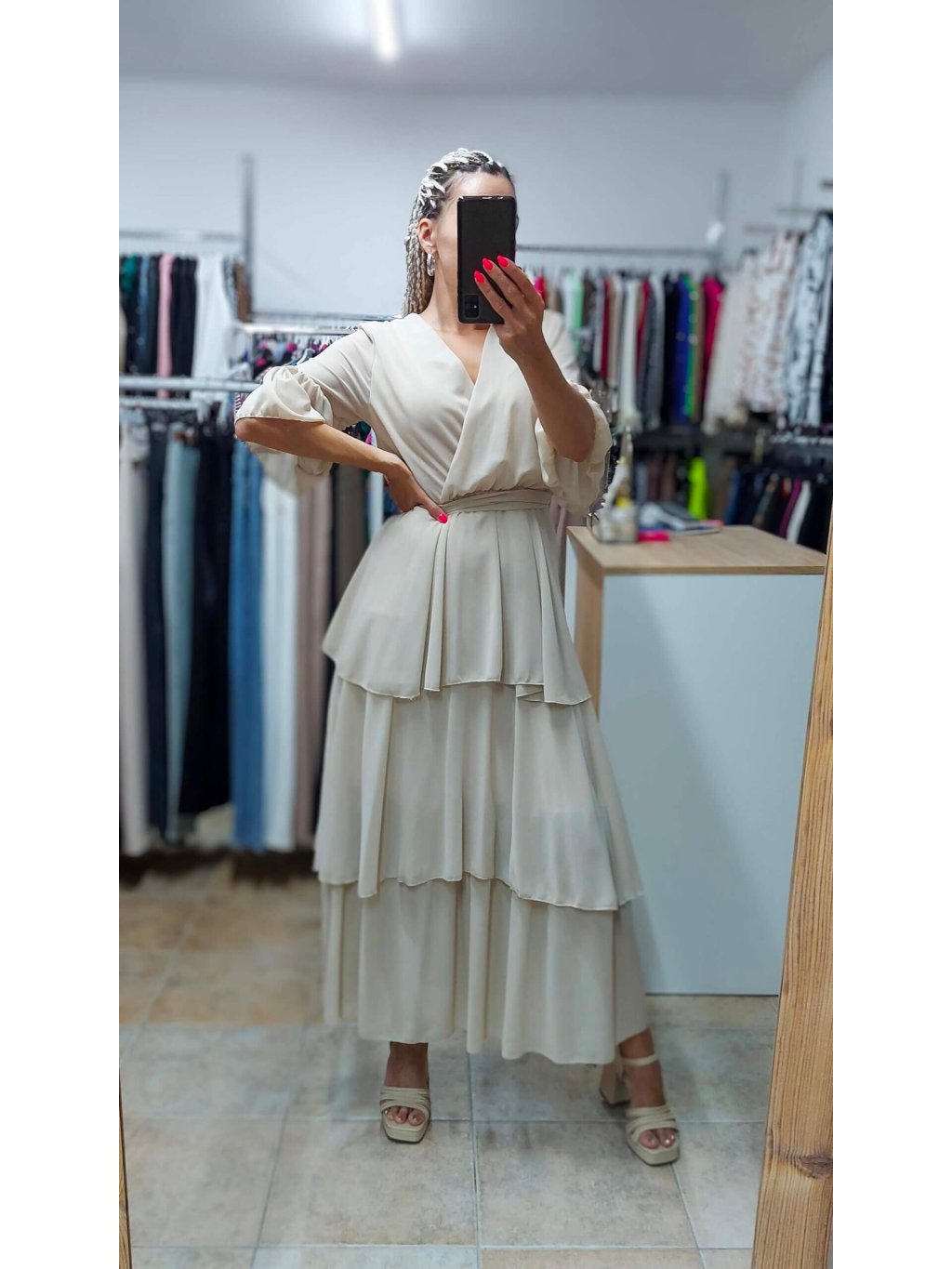 - prekladaný V-čkový výstrih dodáva šatám šmrnc, zatiaľ čo sukňa sa skladá z troch vrstvených volánových pásov, ktoré vytvárajú nádherný pohyb pri chôdzi