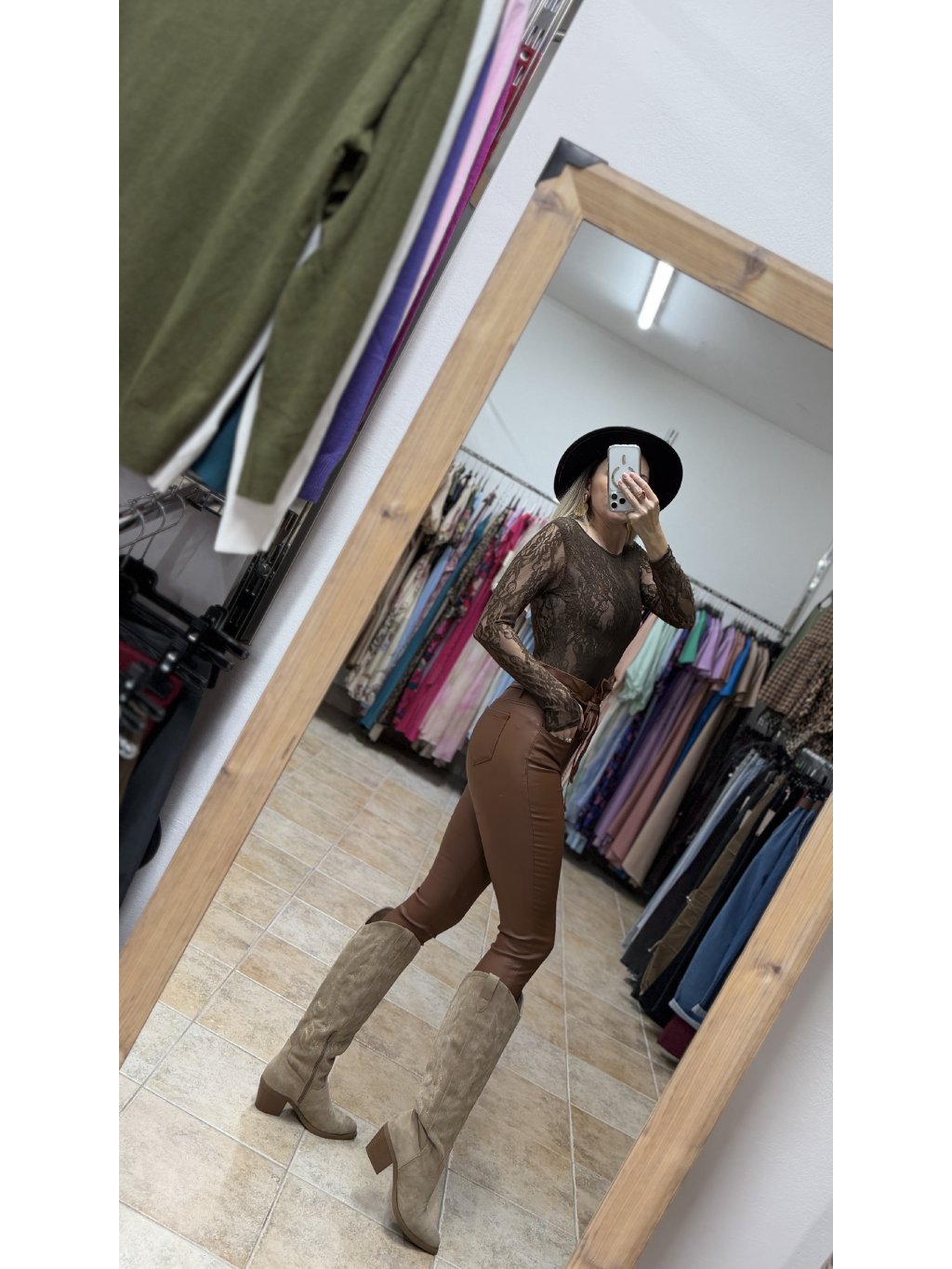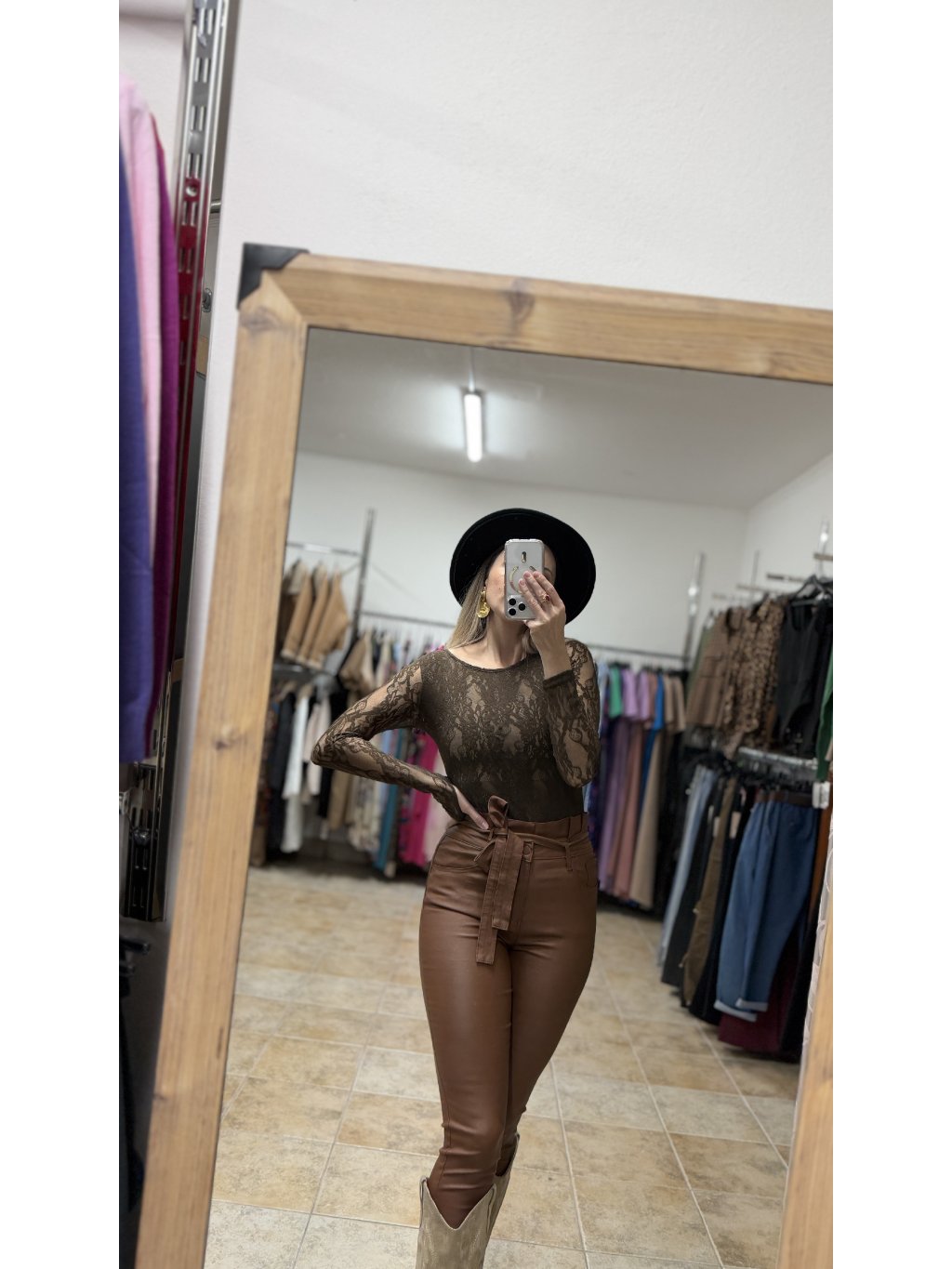 - voskované hnedé nohavice s vysokým pásom vyrobené z príjemného, elastického materiálu s jemným voskovým efektom