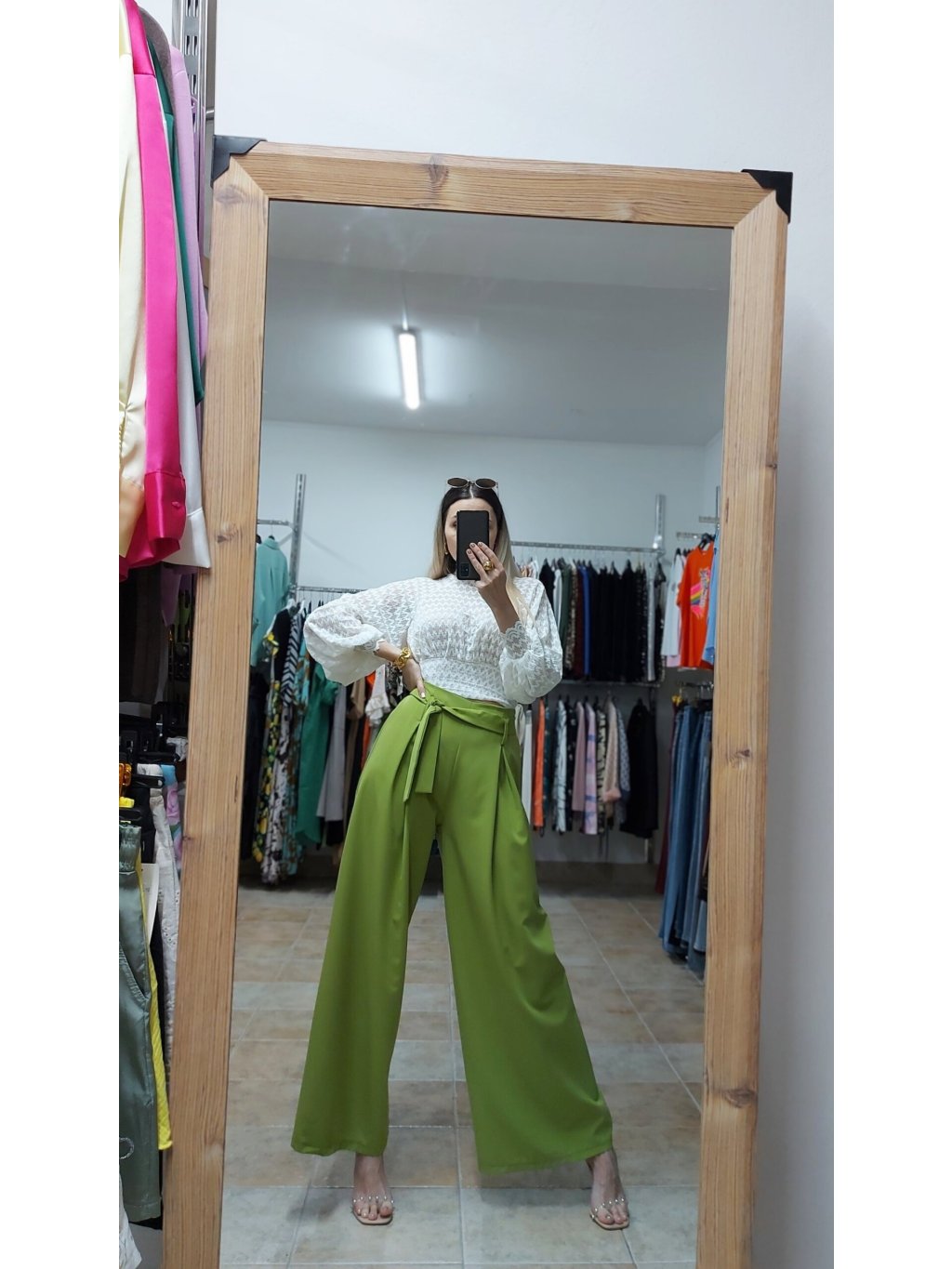 - široké zelené nohavice s opaskom sú perfektnou voľbou pre všetky ženy, ktoré milujú pohodlie a štýl v jednom